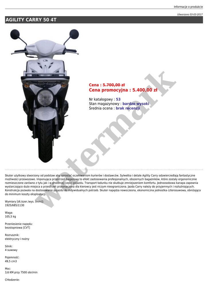Informacje o produkcie Utworzono 03-03-2017 AGILITY CARRY 50 4T er m ar k Cena : 5.700,00 zł Cena promocyjna : 5.400,00 zł at Nr katalogowy : 53 Stan magazynowy : bardzo wysoki Średnia ocena : brak recenzji w Skuter użytkowy stworzony od podstaw aby sprostać oczekiwaniom kurierów i dostawców. Sylwetka i detale Agility Carry odzwierciedlają fantastyczne możliwości przewozowe. Imponująca przestrzeń bagażowa to efekt zastosowania profesjonalnych, obszernych bagażników, które zostały ergonomicznie rozmieszczone zarówno z tyłu jak i w przedniej części pojazdu. Transport ładunku nie skutkuje zmniejszeniem komfortu. Jednoosobowa kanapa zapewnia wystarczająco dużo miejsca a przestrzeń przeznaczona dla kierowcy jest niczym nieograniczona. Jazda Carry należy do przyjemnych i rozluźniających. Konstrukcja pozwala na dostosowanie pojazdu do indywidualnych potrzeb. Skuter napędza nowoczesna, ekonomiczna jednostka czterosuwowa, obniżająca do minimum koszty eksploatacji. Wymiary [dł./szer./wys. (mm)]: 1925/685/1130 Waga: 105,5 kg Przeniesienie napędu: bezstopniowa [CVT] Rozrusznik: elektryczny i nożny Silnik: 4 suwowy Pojemność: 49,5 cm3 Moc: 3,6 KM przy 7500 obr/min Chłodzenie: powietrze Moment obrotowy: 3,5 Nm przy 7000 obr/min Rozmiar opon: przód 120/70-12, tył 130/70-12 Hamulce: przód tarcza, tył bęben w at er m ar k Dostępne kolory: biały