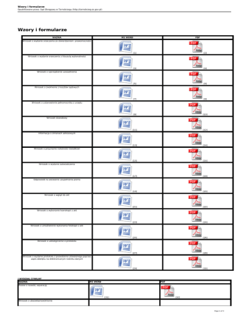 Wzory i formularze Opublikowane przez: Sąd Okręgowy w Tarnobrzegu (http://tarnobrzeg.so.gov.pl) Wzory i formularze NAZWA MS WORD PDF Wniosek o wydanie orzeczenia ze stwierdzeniem prawomocności [1] [2] [3] [4] [5] [6] [7] [8] [9] [10] [11] [12] [13] [14] [15] [16] [17] [18] [19] [20] [21] [22] [23] [24] [25] [26] [27] [28] [29] [30] Wniosek o wydanie orzeczenia z klauzulą wykonalności Wniosek o sporządzenie uzasadnienia Wniosek o zwolnienie z kosztów sądowych Wniosek o ustanowienie pełnomocnika z urzędu Wniosek dowodowy Informacja o zmianach adresowych Wniosek o przyznanie należności świadkowi Wniosek o wydanie zaświadczenia Odpowiedź na wezwanie uzupełnienia pisma Wniosek o wgląd do akt Wniosek o wykonanie kserokopii z akt Wniosek o umożliwienie wykonania fotokopii z akt Wniosek o udostępnienie e-protokołu Wniosek o wydanie protokołu z posiedzenia utrwalonego poprzez zapis dźwięku na elektronicznym nośniku danych I WYDZIAŁ CYWILNY NAZWA MS WORD PDF Pozew o rozwód, separację [31] [32] Wniosek o ubezwłasnowolnienie Page 1 of 3 Wzory i formularze Opublikowane przez: Sąd Okręgowy w Tarnobrzegu (http://tarnobrzeg.so.gov.pl) [33] [34] [35] [36] [37] [38] [39] [40] [41] [42] [43] [44] Wniosek o uznanie orzeczenia sądu zagranicznego Wniosek o rejestrację czasopisma Zgodny wniosek o separację Ulotka informacyjna - rozwód / separacja Ulotka informacyjna - ubezwłasnowolnienie III WYDZIAŁ PRACY I UBEZPIECZEŃ SPOŁECZNYCH NAZWA MS WORD PDF Odwołanie od decyzji organu rentowego [45] [46] [47] [48] [49] [50] [51] [52] [53] [54] Pozew o zapłatę Wniosek o sprostowanie oczywistej omyłki Apelacja od wyroku Sądu Okręgowego Zażalenie na postanowienie Sądu Okręgowego V WYDZIAŁ PENITENCJARNY I NADZORU NAD WYKONYWANIEM ORZECZEŃ KARNYCH NAZWA MS WORD PDF Wniosek o udzielenie przerwy w odbywaniu kary pozbawienia wolności [55] [56] [57] [58] [59] [60] [61] [62] Wniosek o udzielenie warunkowego przedterminowego zwolnienia Wniosek o udzielenie zezwolenia na odbycie kary pozbawienia wolności w systemie dozoru elektronicznego Oświadczenie do wniosku o odbywanie kary w systemie dozoru elektronicznego Zapraszamy do odwiedzenia strony Ministerstwa Sprawiedliwości (www.ms.gov.pl [63]) gdzie mogą Państwo znaleźć większą bazę formularzy. Paweł Dziewirz Source URL: http://tarnobrzeg.so.gov.pl/content/wzory-i-formularze Links: Page 2 of 3 Wzory i formularze Opublikowane przez: Sąd Okręgowy w Tarnobrzegu (http://tarnobrzeg.so.gov.pl) [1] http://tarnobrzeg.so.gov.pl/sites/default/files/BOI 1 Wniosek o wydanie orzeczenia ze stw. prawom..doc [2] http://tarnobrzeg.so.gov.pl/sites/default/files/BOI 1 Wniosek o wydanie orzeczenia ze stw. prawom..pdf [3] http://tarnobrzeg.so.gov.pl/sites/default/files/BOI 2 Wniosek o wydanie orzeczenia z klauz. wykonal._0_0.doc [4] http://tarnobrzeg.so.gov.pl/sites/default/files/BOI 2 Wniosek o wydanie orzeczenia z klauz. wykonal._0_0.pdf [5] http://tarnobrzeg.so.gov.pl/sites/default/files/BOI 3 Wniosek o sporządzenie uzasadnienia_0.doc [6] http://tarnobrzeg.so.gov.pl/sites/default/files/BOI 3 Wniosek o sporządzenie uzasadnienia_0.pdf [7] http://tarnobrzeg.so.gov.pl/sites/default/files/BOI 4 Wniosek o zwolnienie z kosztów sądowych.doc [8] http://tarnobrzeg.so.gov.pl/sites/default/files/BOI 4 Wniosek o zwolnienie z kosztów sądowych.pdf [9] http://tarnobrzeg.so.gov.pl/sites/default/files/BOI 5 Wniosek o ustanowienie pełnomocnika z urzędu.doc [10] http://tarnobrzeg.so.gov.pl/sites/default/files/BOI 5 Wniosek o ustanowienie pełnomocnika z urzędu.pdf [11] http://tarnobrzeg.so.gov.pl/sites/default/files/BOI 6 Wniosek dowodowy.doc [12] http://tarnobrzeg.so.gov.pl/sites/default/files/BOI 6 Wniosek dowodowy.pdf [13] http://tarnobrzeg.so.gov.pl/sites/default/files/BOI 7 Informacja o zmianach adresowych.doc [14] http://tarnobrzeg.so.gov.pl/sites/default/files/BOI 7 Informacja o zmianach adresowych.pdf [15] http://tarnobrzeg.so.gov.pl/sites/default/files/BOI 8 Wniosek o przyznanie należnośći świadkowi.doc [16] http://tarnobrzeg.so.gov.pl/sites/default/files/BOI 8 Wniosek o przyznanie należnośći świadkowi.pdf [17] http://tarnobrzeg.so.gov.pl/sites/default/files/BOI 9 Wniosek o wydanie zaświadczenia.doc [18] http://tarnobrzeg.so.gov.pl/sites/default/files/BOI 9 Wniosek o wydanie zaświadczenia.pdf [19] http://tarnobrzeg.so.gov.pl/sites/default/files/BOI 10 Odpowiedź na wezwanie uzupeł. pisma.doc [20] http://tarnobrzeg.so.gov.pl/sites/default/files/BOI 10 Odpowiedź na wezwanie uzupeł. pisma.pdf [21] http://tarnobrzeg.so.gov.pl/sites/default/files/BOI 11 Wniosek o wgląd do akt_1.doc [22] http://tarnobrzeg.so.gov.pl/sites/default/files/BOI 11 Wniosek o wgląd do akt_1.pdf [23] http://tarnobrzeg.so.gov.pl/sites/default/files/BOI 12 Wniosek o wydanie kserokopii kart_0.doc [24] http://tarnobrzeg.so.gov.pl/sites/default/files/BOI 12 Wniosek o wydanie kserokopii kart_0.pdf [25] http://tarnobrzeg.so.gov.pl/sites/default/files/BOI 13 Wniosek o wyrażenie zgody na fotokopię_0.doc [26] http://tarnobrzeg.so.gov.pl/sites/default/files/BOI 13 Wniosek o wyrażenie zgody na fotokopię_2.pdf [27] http://tarnobrzeg.so.gov.pl/sites/default/files/BOI 14 Wniosek o udostępnienie e-protokołu_0.doc [28] http://tarnobrzeg.so.gov.pl/sites/default/files/BOI 14 Wniosek o udostępnienie e-protokołu_0.pdf [29] http://tarnobrzeg.so.gov.pl/sites/default/files/BOI%2015%20%20Wniosek%20o%20wydadnie%20e-protoko%C5%82u_4_1.doc [30] http://tarnobrzeg.so.gov.pl/sites/default/files/BOI%2015%20%20Wniosek%20o%20wydadnie%20e-protoko%C5%82u_4_1.pdf [31] http://tarnobrzeg.so.gov.pl/sites/default/files/Pozew%20o%20rozw%C3%B3d%2C%20separacj%C4%99_2.doc [32] http://tarnobrzeg.so.gov.pl/sites/default/files/Pozew%20o%20rozw%C3%B3d%2C%20separacj%C4%99_2.pdf [33] http://tarnobrzeg.so.gov.pl/sites/default/files/Wniosek%20o%20ubezw%C5%82asnowolnienie_1_0_0.rtf [34] http://tarnobrzeg.so.gov.pl/sites/default/files/Wniosek%20o%20ubezw%C5%82asnowolnienie_1_0_0.pdf [35] http://tarnobr