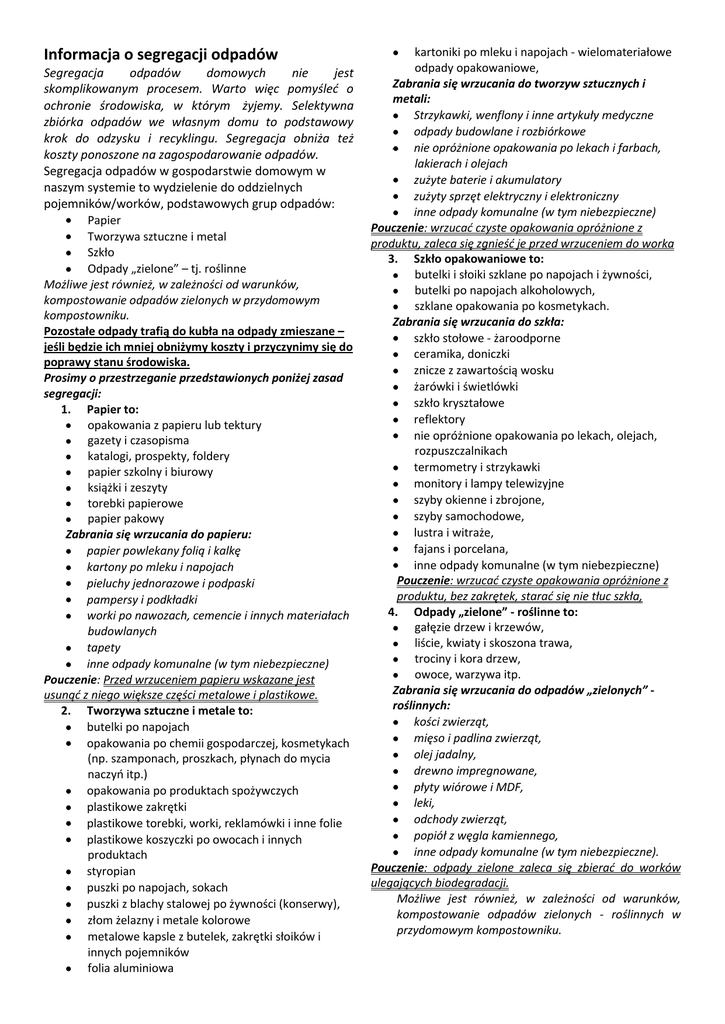 Informacja o segregacji odpadów Segregacja odpadów domowych nie jest skomplikowanym procesem. Warto więc pomyśleć o ochronie środowiska, w którym żyjemy. Selektywna zbiórka odpadów we własnym domu to podstawowy krok do odzysku i recyklingu. Segregacja obniża też koszty ponoszone na zagospodarowanie odpadów. Segregacja odpadów w gospodarstwie domowym w naszym systemie to wydzielenie do oddzielnych pojemników/worków, podstawowych grup odpadów: Papier Tworzywa sztuczne i metal Szkło Odpady „zielone” – tj. roślinne Możliwe jest również, w zależności od warunków, kompostowanie odpadów zielonych w przydomowym kompostowniku. Pozostałe odpady trafią do kubła na odpady zmieszane – jeśli będzie ich mniej obniżymy koszty i przyczynimy się do poprawy stanu środowiska. Prosimy o przestrzeganie przedstawionych poniżej zasad segregacji: 1. Papier to: opakowania z papieru lub tektury gazety i czasopisma katalogi, prospekty, foldery papier szkolny i biurowy książki i zeszyty torebki papierowe papier pakowy Zabrania się wrzucania do papieru: papier powlekany folią i kalkę kartony po mleku i napojach pieluchy jednorazowe i podpaski pampersy i podkładki worki po nawozach, cemencie i innych materiałach budowlanych tapety inne odpady komunalne (w tym niebezpieczne) Pouczenie: Przed wrzuceniem papieru wskazane jest usunąć z niego większe części metalowe i plastikowe. 2. Tworzywa sztuczne i metale to: butelki po napojach opakowania po chemii gospodarczej, kosmetykach (np. szamponach, proszkach, płynach do mycia naczyń itp.) opakowania po produktach spożywczych plastikowe zakrętki plastikowe torebki, worki, reklamówki i inne folie plastikowe koszyczki po owocach i innych produktach styropian puszki po napojach, sokach puszki z blachy stalowej po żywności (konserwy), złom żelazny i metale kolorowe metalowe kapsle z butelek, zakrętki słoików i innych pojemników folia aluminiowa kartoniki po mleku i napojach - wielomateriałowe odpady opakowaniowe, Zabrania się wrzucania do tworzyw sztucznych i metali: Strzykawki, wenflony i inne artykuły medyczne odpady budowlane i rozbiórkowe nie opróżnione opakowania po lekach i farbach, lakierach i olejach zużyte baterie i akumulatory zużyty sprzęt elektryczny i elektroniczny inne odpady komunalne (w tym niebezpieczne) Pouczenie: wrzucać czyste opakowania opróżnione z produktu, zaleca się zgnieść je przed wrzuceniem do worka 3. Szkło opakowaniowe to: butelki i słoiki szklane po napojach i żywności, butelki po napojach alkoholowych, szklane opakowania po kosmetykach. Zabrania się wrzucania do szkła: szkło stołowe - żaroodporne ceramika, doniczki znicze z zawartością wosku żarówki i świetlówki szkło kryształowe reflektory nie opróżnione opakowania po lekach, olejach, rozpuszczalnikach termometry i strzykawki monitory i lampy telewizyjne szyby okienne i zbrojone, szyby samochodowe, lustra i witraże, fajans i porcelana, inne odpady komunalne (w tym niebezpieczne) Pouczenie: wrzucać czyste opakowania opróżnione z produktu, bez zakrętek, starać się nie tłuc szkła, 4. Odpady „zielone” - roślinne to: gałęzie drzew i krzewów, liście, kwiaty i skoszona trawa, trociny i kora drzew, owoce, warzywa itp. Zabrania się wrzucania do odpadów „zielonych” roślinnych: kości zwierząt, mięso i padlina zwierząt, olej jadalny, drewno impregnowane, płyty wiórowe i MDF, leki, odchody zwierząt, popiół z węgla kamiennego, inne odpady komunalne (w tym niebezpieczne). Pouczenie: odpady zielone zaleca się zbierać do worków ulegających biodegradacji. Możliwe jest również, w zależności od warunków, kompostowanie odpadów zielonych - roślinnych w przydomowym kompostowniku.