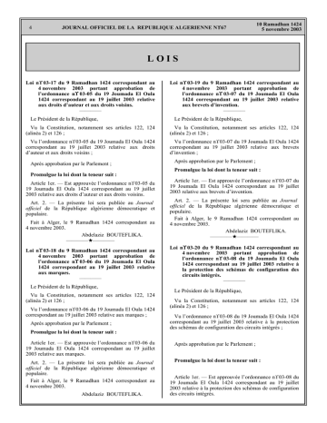 4 JOURNAL OFFICIEL DE LA REPUBLIQUE ALGERIENNE N°° 67 10 Ramadhan 1424 5 novembre 2003 LOIS Loi n°° 03-17 du 9 Ramadhan 1424 correspondant au 4 novembre 2003 portant approbation de l’ordonnance n°° 03-05 du 19 Joumada El Oula 1424 correspondant au 19 juillet 2003 relative aux droits d’auteur et aux droits voisins. ———— Le Président de la République, Loi n°° 03-19 du 9 Ramadhan 1424 correspondant au 4 novembre 2003 portant approbation de l’ordonnance n°° 03-07 du 19 Joumada El Oula 1424 correspondant au 19 juillet 2003 relative aux brevets d’invention. ———— Le Président de la République, Vu la Constitution, notamment ses articles 122, 124 (alinéa 2) et 126 ; Vu la Constitution, notamment ses articles 122, 124 (alinéa 2) et 126 ; Vu l’ordonnance n° 03-05 du 19 Joumada El Oula 1424 correspondant au 19 juillet 2003 relative aux droits d’auteur et aux droits voisins ; Vu l’ordonnance n° 03-07 du 19 Joumada El Oula 1424 correspondant au 19 juillet 2003 relative aux brevets d’invention ; Après approbation par le Parlement ; Après approbation par le Parlement ; Promulgue la loi dont la teneur suit : Promulgue la loi dont la teneur suit : Article 1er. — Est approuvée l’ordonnance n° 03-05 du 19 Joumada El Oula 1424 correspondant au 19 juillet 2003 relative aux droits d’auteur et aux droits voisins. Article 1er. — Est approuvée l’ordonnance n° 03-07 du 19 Joumada El Oula 1424 correspondant au 19 juillet 2003 relative aux brevets d’invention. Art. 2. — La présente loi sera publiée au Journal officiel de la République algérienne démocratique et populaire. Art. 2. — La présente loi sera publiée au Journal officiel de la République algérienne démocratique et populaire. Fait à Alger, le 9 Ramadhan 1424 correspondant au 4 novembre 2003. Abdelaziz BOUTEFLIKA. ————★———— Fait à Alger, le 9 Ramadhan 1424 correspondant au 4 novembre 2003. Abdelaziz BOUTEFLIKA. ————★———— Loi n°° 03-18 du 9 Ramadhan 1424 correspondant au 4 novembre 2003 portant approbation de l’ordonnance n°° 03-06 du 19 Joumada El Oula 1424 correspondant au 19 juillet 2003 relative aux marques. ———— Le Président de la République, Vu la Constitution, notamment ses articles 122, 124 (alinéa 2) et 126 ; Vu l’ordonnance n° 03-06 du 19 Joumada El Oula 1424 correspondant au 19 juillet 2003 relative aux marques ; Après approbation par le Parlement ; Promulgue la loi dont la teneur suit : Loi n°° 03-20 du 9 Ramadhan 1424 correspondant au 4 novembre 2003 portant approbation de l’ordonnance n°° 03-08 du 19 Joumada El Oula 1424 correspondant au 19 juillet 2003 relative à la protection des schémas de configuration des circuits intégrés. ———— Le Président de la République, Vu la Constitution, notamment ses articles 122, 124 (alinéa 2) et 126 ; Vu l’ordonnance n° 03-08 du 19 Joumada El Oula 1424 correspondant au 19 juillet 2003 relative à la protection des schémas de configuration des circuits intégrés ; Article 1er. — Est approuvée l’ordonnance n° 03-06 du 19 Joumada El Oula 1424 correspondant au 19 juillet 2003 relative aux marques. Après approbation par le Parlement ; Art. 2. — La présente loi sera publiée au Journal officiel de la République algérienne démocratique et populaire. Fait à Alger, le 9 Ramadhan 1424 correspondant au 4 novembre 2003. Promulgue la loi dont la teneur suit : Abdelaziz BOUTEFLIKA. Article 1er. — Est approuvée l’ordonnance n° 03-08 du 19 Joumada El Oula 1424 correspondant au 19 juillet 2003 relative à la protection des schémas de configuration des circuits intégrés.