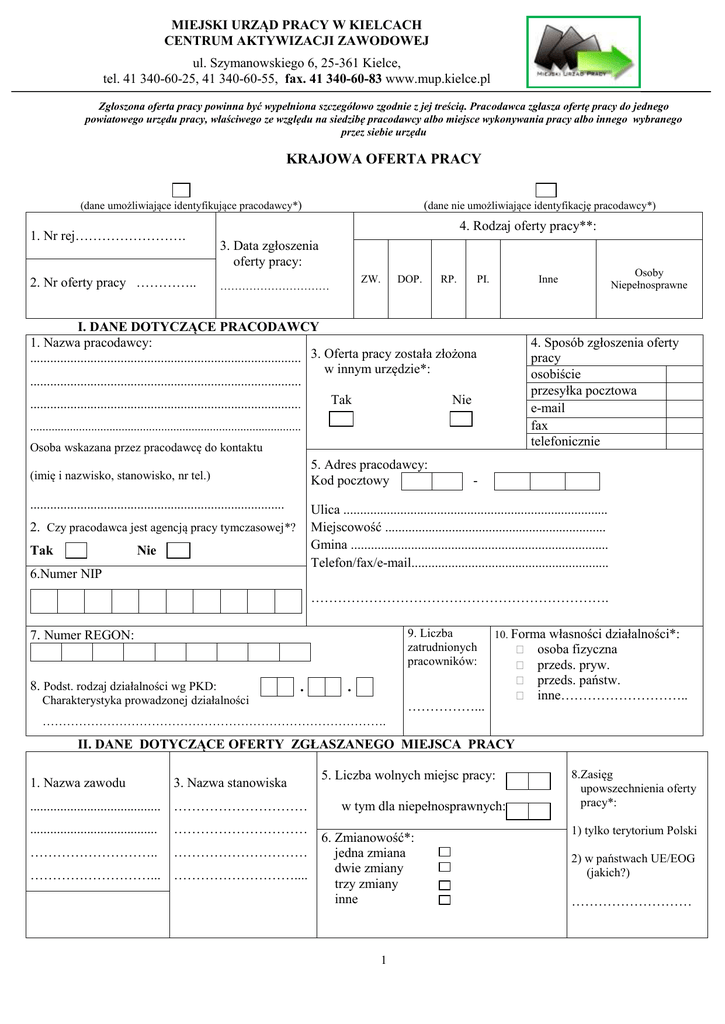 MIEJSKI URZĄD PRACY W KIELCACH CENTRUM AKTYWIZACJI ZAWODOWEJ ul. Szymanowskiego 6, 25-361 Kielce, tel. 41 340-60-25, 41 340-60-55, fax. 41 340-60-83 www.mup.kielce.pl Zgłoszona oferta pracy powinna być wypełniona szczegółowo zgodnie z jej treścią. Pracodawca zgłasza ofertę pracy do jednego powiatowego urzędu pracy, właściwego ze względu na siedzibę pracodawcy albo miejsce wykonywania pracy albo innego wybranego przez siebie urzędu KRAJOWA OFERTA PRACY (dane umożliwiające identyfikujące pracodawcy*) 1. Nr rej……………………. 2. Nr oferty pracy ………….. (dane nie umożliwiające identyfikację pracodawcy*) 4. Rodzaj oferty pracy**: 3. Data zgłoszenia oferty pracy: ZW. ………………………… DOP. RP. PI. I. DANE DOTYCZĄCE PRACODAWCY 1. Nazwa pracodawcy: ................................................................................. 3. Oferta pracy została złożona w innym urzędzie*: ................................................................................. Tak Nie ................................................................................. 4. Sposób zgłoszenia oferty pracy osobiście przesyłka pocztowa e-mail fax telefonicznie ......................................................................................... Osoba wskazana przez pracodawcę do kontaktu 5. Adres pracodawcy: Kod pocztowy (imię i nazwisko, stanowisko, nr tel.) ............................................................................ - Ulica ............................................................................... Miejscowość .................................................................. Gmina ............................................................................. Telefon/fax/e-mail........................................................... 2. Czy pracodawca jest agencją pracy tymczasowej*? Tak Osoby Niepełnosprawne Inne Nie 6.Numer NIP …………………………………………………………. 9. Liczba zatrudnionych pracowników: 7. Numer REGON: 8. Podst. rodzaj działalności wg PKD: Charakterystyka prowadzonej działalności . 10. Forma . ……………... własności działalności*: osoba fizyczna przeds. pryw. przeds. państw. inne……………………….. …………………………………………………………………………. II. DANE DOTYCZĄCE OFERTY ZGŁASZANEGO MIEJSCA PRACY 1. Nazwa zawodu 3. Nazwa stanowiska ....................................... ………………………… ...................................... ………………………… ……………………….. ………………………… ………………………... ……………………….... 5. Liczba wolnych miejsc pracy: w tym dla niepełnosprawnych: 6. Zmianowość*: jedna zmiana dwie zmiany trzy zmiany inne 1 8.Zasięg upowszechnienia oferty pracy*: 1) tylko terytorium Polski 2) w państwach UE/EOG (jakich?) ……………………… 4 Adres miejsca pracy: 7. Data rozpoczęcia pracy: 9. Preferowana forma kontaktu z pracodawcą: ……………………………………… telefoniczna:……………………….. 2.Kod zawodu wg. KZiS ……………………………… ………………………………………. ……………………………… Okres zatrudnienia w przypadku pracy na podst. osobista w godz.:…………………... ……………………………… umowy o pracę:………………….. ………………………………….…… …………………………………… inna:…………………………………. ………………………………………. 10. Rodzaj umowy*: na czas nieokreślony na czas określony na okres próbny o dzieło zlecenie praca sezonowa inne……………… 11. Wymiar czasu pracy: 13. System wynagrodzenia*: kwota brutto ………………………………….. miesięczny…………….. godzinowy…………….. 12. Godziny pracy: akord………………….. ………………………………….. inne……………………. III. DANE DOTYCZĄCE OCZEKIWAŃ WOBEC KANDYDATA 1. poziom wykształcenia: ………………………………………………………………………………….............................................. 2. umiejętności:…………………………………………………………………………………………………………............................ …………………………………………………………………………………………………………………………………………….... 3. uprawnienia:…………………………………………………………………………………………………………............................. ……………………………………………………………………………………………………………………………………………..... 4. doświadczenie zawodowe:………………………………………………………………………………………………….. 5. znajomość j. obcych (stopień znajomości):………………………………………………………………………………………... 6. zakres obowiązków:…………………………………………………………………………………………………………………… ……………………………………………………………………………………………………………………………………………… ………………………………………………………………………………………………………………………………………………. 7. dodatkowe informacje:………………………………………………………………………………………………………………… …………………………………………………………………………………………………………………………