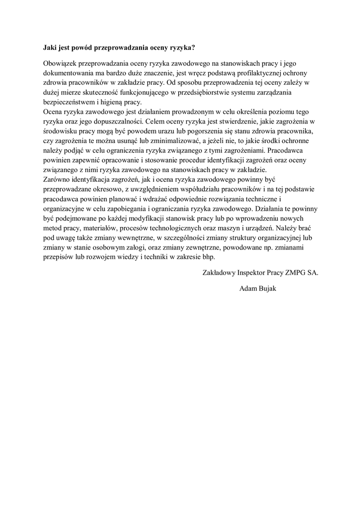 Jaki jest powód przeprowadzania oceny ryzyka? Obowiązek przeprowadzania oceny ryzyka zawodowego na stanowiskach pracy i jego dokumentowania ma bardzo duże znaczenie, jest wręcz podstawą profilaktycznej ochrony zdrowia pracowników w zakładzie pracy. Od sposobu przeprowadzenia tej oceny zależy w dużej mierze skuteczność funkcjonującego w przedsiębiorstwie systemu zarządzania bezpieczeństwem i higieną pracy. Ocena ryzyka zawodowego jest działaniem prowadzonym w celu określenia poziomu tego ryzyka oraz jego dopuszczalności. Celem oceny ryzyka jest stwierdzenie, jakie zagrożenia w środowisku pracy mogą być powodem urazu lub pogorszenia się stanu zdrowia pracownika, czy zagrożenia te można usunąć lub zminimalizować, a jeżeli nie, to jakie środki ochronne należy podjąć w celu ograniczenia ryzyka związanego z tymi zagrożeniami. Pracodawca powinien zapewnić opracowanie i stosowanie procedur identyfikacji zagrożeń oraz oceny związanego z nimi ryzyka zawodowego na stanowiskach pracy w zakładzie. Zarówno identyfikacja zagrożeń, jak i ocena ryzyka zawodowego powinny być przeprowadzane okresowo, z uwzględnieniem współudziału pracowników i na tej podstawie pracodawca powinien planować i wdrażać odpowiednie rozwiązania techniczne i organizacyjne w celu zapobiegania i ograniczania ryzyka zawodowego. Działania te powinny być podejmowane po każdej modyfikacji stanowisk pracy lub po wprowadzeniu nowych metod pracy, materiałów, procesów technologicznych oraz maszyn i urządzeń. Należy brać pod uwagę także zmiany wewnętrzne, w szczególności zmiany struktury organizacyjnej lub zmiany w stanie osobowym załogi, oraz zmiany zewnętrzne, powodowane np. zmianami przepisów lub rozwojem wiedzy i techniki w zakresie bhp. Zakładowy Inspektor Pracy ZMPG SA. Adam Bujak