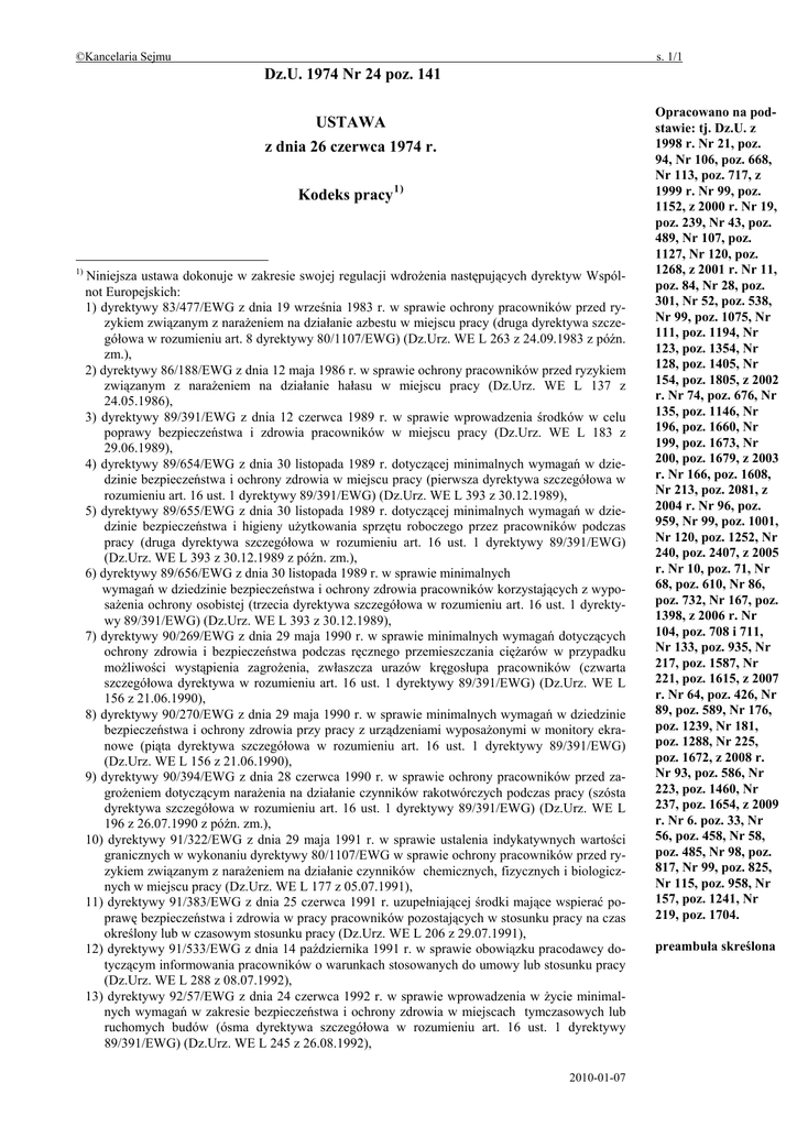 ©Kancelaria Sejmu s. 1/1 Dz.U. 1974 Nr 24 poz. 141 USTAWA z dnia 26 czerwca 1974 r. Kodeks pracy 1) 1) Niniejsza ustawa dokonuje w zakresie swojej regulacji wdrożenia następujących dyrektyw Wspólnot Europejskich: 1) dyrektywy 83/477/EWG z dnia 19 września 1983 r. w sprawie ochrony pracowników przed ryzykiem związanym z narażeniem na działanie azbestu w miejscu pracy (druga dyrektywa szczegółowa w rozumieniu art. 8 dyrektywy 80/1107/EWG) (Dz.Urz. WE L 263 z 24.09.1983 z późn. zm.), 2) dyrektywy 86/188/EWG z dnia 12 maja 1986 r. w sprawie ochrony pracowników przed ryzykiem związanym z narażeniem na działanie hałasu w miejscu pracy (Dz.Urz. WE L 137 z 24.05.1986), 3) dyrektywy 89/391/EWG z dnia 12 czerwca 1989 r. w sprawie wprowadzenia środków w celu poprawy bezpieczeństwa i zdrowia pracowników w miejscu pracy (Dz.Urz. WE L 183 z 29.06.1989), 4) dyrektywy 89/654/EWG z dnia 30 listopada 1989 r. dotyczącej minimalnych wymagań w dziedzinie bezpieczeństwa i ochrony zdrowia w miejscu pracy (pierwsza dyrektywa szczegółowa w rozumieniu art. 16 ust. 1 dyrektywy 89/391/EWG) (Dz.Urz. WE L 393 z 30.12.1989), 5) dyrektywy 89/655/EWG z dnia 30 listopada 1989 r. dotyczącej minimalnych wymagań w dziedzinie bezpieczeństwa i higieny użytkowania sprzętu roboczego przez pracowników podczas pracy (druga dyrektywa szczegółowa w rozumieniu art. 16 ust. 1 dyrektywy 89/391/EWG) (Dz.Urz. WE L 393 z 30.12.1989 z późn. zm.), 6) dyrektywy 89/656/EWG z dnia 30 listopada 1989 r. w sprawie minimalnych wymagań w dziedzinie bezpieczeństwa i ochrony zdrowia pracowników korzystających z wyposażenia ochrony osobistej (trzecia dyrektywa szczegółowa w rozumieniu art. 16 ust. 1 dyrektywy 89/391/EWG) (Dz.Urz. WE L 393 z 30.12.1989), 7) dyrektywy 90/269/EWG z dnia 29 maja 1990 r. w sprawie minimalnych wymagań dotyczących ochrony zdrowia i bezpieczeństwa podczas ręcznego przemieszczania ciężarów w przypadku możliwości wystąpienia zagrożenia, zwłaszcza urazów kręgosłupa pracowników (czwarta szczegółowa dyrektywa w rozumieniu art. 16 ust. 1 dyrektywy 89/391/EWG) (Dz.Urz. WE L 156 z 21.06.1990), 8) dyrektywy 90/270/EWG z dnia 29 maja 1990 r. w sprawie minimalnych wymagań w dziedzinie bezpieczeństwa i ochrony zdrowia przy pracy z urządzeniami wyposażonymi w monitory ekranowe (piąta dyrektywa szczegółowa w rozumieniu art. 16 ust. 1 dyrektywy 89/391/EWG) (Dz.Urz. WE L 156 z 21.06.1990), 9) dyrektywy 90/394/EWG z dnia 28 czerwca 1990 r. w sprawie ochrony pracowników przed zagrożeniem dotyczącym narażenia na działanie czynników rakotwórczych podczas pracy (szósta dyrektywa szczegółowa w rozumieniu art. 16 ust. 1 dyrektywy 89/391/EWG) (Dz.Urz. WE L 196 z 26.07.1990 z późn. zm.), 10) dyrektywy 91/322/EWG z dnia 29 maja 1991 r. w sprawie ustalenia indykatywnych wartości granicznych w wykonaniu dyrektywy 80/1107/EWG w sprawie ochrony pracowników przed ryzykiem związanym z narażeniem na działanie czynników chemicznych, fizycznych i biologicznych w miejscu pracy (Dz.Urz. WE L 177 z 05.07.1991), 11) dyrektywy 91/383/EWG z dnia 25 czerwca 1991 r. uzupełniającej środki mające wspierać poprawę bezpieczeństwa i zdrowia w pracy pracowników pozostających w stosunku pracy na czas określony lub w czasowym stosunku pracy (Dz.Urz. WE L 206 z 29.07.1991), 12) dyrektywy 91/533/EWG z dnia 14 października 1991 r. w sprawie obowiązku pracodawcy dotyczącym informowania pracowników o warunkach stosowanych do umowy lub stosunku pracy (Dz.Urz. WE L 288 z 08.07.1992), 13) dyrektywy 92/57/EWG z dnia 24 czerwca 1992 r. w sprawie wprowadzenia w życie minimalnych wymagań w zakresie bezpieczeństwa i ochrony zdrowia w miejscach tymczasowych lub ruchomych budów (ósma dyrektywa szczegółowa w rozumieniu art. 16 ust. 1 dyrektywy 89/391/EWG) (Dz.Urz. WE L 245 z 26.08.1992), 2010-01-07 Opracowano na podstawie: tj. Dz.U. z 1998 r. Nr 21, poz. 94, Nr 106, poz. 668, Nr 113, poz. 717, z 1999 r. Nr 99, poz. 1152, z 2000 r. Nr 19, poz. 239, Nr 43, poz. 489, Nr 107, poz. 1127, Nr 120, poz. 1268, z 2001 r. Nr 11, poz. 84, Nr 28, poz. 301, Nr 52, poz. 538, Nr 99, poz. 1075, Nr 111, poz. 1194, Nr 123, poz. 1354, Nr 128, poz. 1405, Nr 154, poz. 1805, z 2002 r. Nr 74, poz. 676, Nr 135, poz. 1146, Nr 196, poz. 1660, Nr 199, poz. 1673, Nr 200, poz. 1679, z 2003 r. Nr 166, poz. 1608, Nr 213, poz. 2081, z 2004 r. Nr 96, poz. 959, Nr 99, poz. 1001, Nr 120, poz. 1252, Nr 240, poz. 2407, z 2005 r. Nr 10, poz. 71, Nr 68, poz. 610, Nr 86, poz. 732, Nr 167, poz. 1398, z 2006 r. Nr 104, poz. 708 i 711, Nr 133, poz. 935, Nr 217, poz. 1587, Nr 221, poz. 1615, z 2007 r. Nr 64, poz. 426, Nr 89, poz. 589, Nr 176, poz. 1239, Nr 181, poz. 1288, Nr 225, poz. 1672, z 2008 r. Nr 93, poz. 586, Nr 223, poz. 1460, Nr 237, poz. 1654, z 2009 r. Nr 6. poz. 33, Nr 56, poz. 458, Nr 58, poz. 485, Nr 98, poz. 817, Nr 99, poz. 825, Nr 115, poz. 958, Nr 157, poz. 1241, Nr 219, poz. 1704. preambuła skreślona ©Kancelaria Sejmu s. 2/2 14) dyrektywy 92/58/EWG z dnia 24 czerwca 1992 r. w sprawie minimalnych wymagań dotyczących znaków bezpieczeństwa i/lub zdrowia w miejscu pracy (dziewiąta dyrektywa szczegółowa w rozumieniu art. 16 ust. 1 dyrektywy 89/391/EWG) (Dz.Urz. WE L 245 z 26.08.1992), 15) dyrektywy 92/85/EWG z dnia 19 października 1992 r. w sprawie wprowadzenia środków służących wspieraniu poprawy w miejscu pracy bezpieczeństwa i zdrowia pracownic w ciąży, pracownic, które niedawno rodziły i pracownic karmiących piersią (dziesiąta dyrektywa szczegółowa w rozumieniu art. 16 ust. 1 dyrektywy 89/391/EWG) (Dz.Urz. WE L 348 z 28.11.1992), 16) dyrektywy 93/104/WE z dnia 23 listopada 1993 r. dotyczącej niektórych aspektów organizacji czasu pracy (Dz.Urz. WE L 307 z 13.12.1993), 17) dyrektywy 94/33/WE z dnia 22 czerwca 1994 r. w sprawie ochrony pracy osób młodych (Dz.Urz. WE L 216 z 20.08.1994), 18) dyrektywy 96/34/WE z dnia 3 czerwca 1996 r. w sprawie Porozumienia ramowego dotyczącego url