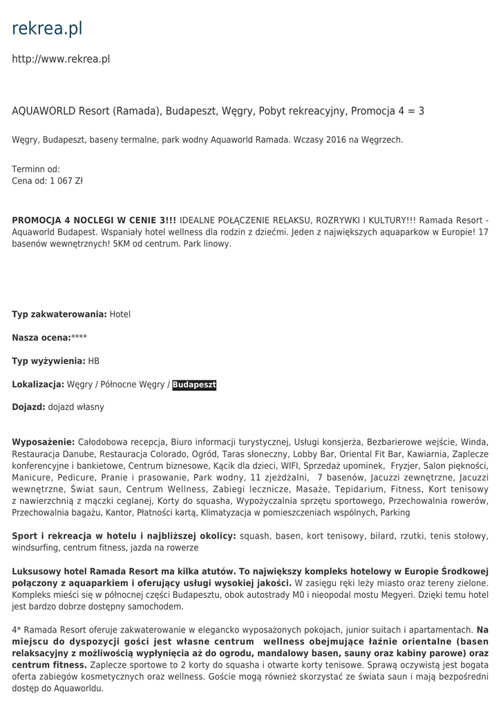rekrea.pl http://www.rekrea.pl AQUAWORLD Resort (Ramada), Budapeszt, Węgry, Pobyt rekreacyjny, Promocja 4 = 3 Węgry, Budapeszt, baseny termalne, park wodny Aquaworld Ramada. Wczasy 2016 na Węgrzech. Terminn od: Cena od: 1 067 Zł PROMOCJA 4 NOCLEGI W CENIE 3!!! IDEALNE POŁĄCZENIE RELAKSU, ROZRYWKI I KULTURY!!! Ramada Resort Aquaworld Budapest. Wspaniały hotel wellness dla rodzin z dziećmi. Jeden z największych aquaparkow w Europie! 17 basenów wewnętrznych! 5KM od centrum. Park linowy. Typ zakwaterowania: Hotel Nasza ocena:**** Typ wyżywienia: HB Lokalizacja: Węgry / Północne Węgry / Budapeszt Dojazd: dojazd własny Wyposażenie: Całodobowa recepcja, Biuro informacji turystycznej, Usługi konsjerża, Bezbarierowe wejście, Winda, Restauracja Danube, Restauracja Colorado, Ogród, Taras słoneczny, Lobby Bar, Oriental Fit Bar, Kawiarnia, Zaplecze konferencyjne i bankietowe, Centrum biznesowe, Kącik dla dzieci, WIFI, Sprzedaż upominek, Fryzjer, Salon piękności, Manicure, Pedicure, Pranie i prasowanie, Park wodny, 11 zjeżdżalni, 7 basenów, Jacuzzi zewnętrzne, Jacuzzi wewnętrzne, Świat saun, Centrum Wellness, Zabiegi lecznicze, Masaże, Tepidarium, Fitness, Kort tenisowy z nawierzchnią z mączki ceglanej, Korty do squasha, Wypożyczalnia sprzętu sportowego, Przechowalnia rowerów, Przechowalnia bagażu, Kantor, Płatności kartą, Klimatyzacja w pomieszczeniach wspólnych, Parking Sport i rekreacja w hotelu i najbliższej okolicy: squash, basen, kort tenisowy, bilard, rzutki, tenis stołowy, windsurfing, centrum fitness, jazda na rowerze Luksusowy hotel Ramada Resort ma kilka atutów. To największy kompleks hotelowy w Europie Środkowej połączony z aquaparkiem i oferujący usługi wysokiej jakości. W zasięgu ręki leży miasto oraz tereny zielone. Kompleks mieści się w północnej części Budapesztu, obok autostrady M0 i nieopodal mostu Megyeri. Dzięki temu hotel jest bardzo dobrze dostępny samochodem. 4* Ramada Resort oferuje zakwaterowanie w elegancko wyposażonych pokojach, junior suitach i apartamentach. Na miejscu do dyspozycji gości jest własne centrum wellness obejmujące łaźnie orientalne (basen relaksacyjny z możliwością wypłynięcia aż do ogrodu, mandalowy basen, sauny oraz kabiny parowe) oraz centrum fitness. Zaplecze sportowe to 2 korty do squasha i otwarte korty tenisowe. Sprawą oczywistą jest bogata oferta zabiegów kosmetycznych oraz wellness. Goście mogą również skorzystać ze świata saun i mają bezpośredni dostęp do Aquaworldu. Aquaworld Budapeszt to ogromny kompleks zadaszony olbrzymią kopułą, pod którą mieszczą się baseny, wieże, wiszące mosty, zjeżdżalnie, ślizgawki oraz świat saun. Przez cały rok oferuje niezapomnianą zabawę odwiedzającym we wszystkich kategoriach wiekowych. Centrum atrakcji wodnych zakrywa ogromna kopuła o średnicy 72 metrów, która ma wysokość 5 pięter. Kopuła jest tak obszerna, że spokojnie mogłaby pomieścić całą rodzinę niebieskich wielorybów! Godna podziwu jest centralna budowla przypominająca swym stylem świątynię Angkor Wat w Kambodży, która otoczona jest wiszącymi mostami, wieżami oraz basenami. Armia „uśmiechniętych posągów” jest w harmonii z całą koncepcją Aquaworldu, która stawia sobie za cel stworzenie gościom tej monumentalnej świątyni kultury zdrojowej, za pośrednictwem oryginalnych rozwiązań architektonicznych i technicznych, bogatą kombinację wrażeń. Cena pobytu obejmuje wyżywienie HB w formie bogatego międzynarodowego bufetu. Możliwość parkowania przy hotelu, opłata parkingowa została zawarta w cenie pobytu. Uwaga Zalecamy zakup kompleksowego ubezpieczenia turystycznego, w tym ubezpieczenia rezygnacji z podróży za obniżoną cenę. Cena obejmuje 4 x zakwaterowanie, 4 x wyżywienie HB (śniadania i kolacje w formie bufetu), wstęp wolny do łaźni orientalnych, centrum wellness i fitness (basen relaksacyjny, ogrzewany basen zewnętrzny, łaźnie mandala, sauna, łaźnie parowe, siłownia), wstęp wolny do Aquaworldu, sauny hotelowej oraz fitness, bezpłatny dostęp do Internetu, wypożyczenie szlafroka, parking, obowiązkowe ubezpieczenie biur podróży Cena nie obejmuje podatku turystycznego 1,5 € za osobę w wieku od 18 lat / noc