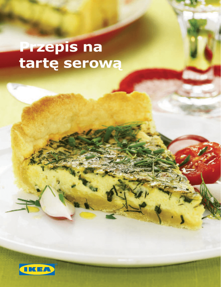© Inter IKEA Systems B.V. 2009 Przepis na tartę serową 2 godziny dla 6 osób Przepis na tartę serową Średniotwardy ser żółty OST LAGRAD to dojrzały ser o bogatym i wyrazistym smaku. Składniki (porcja dla 6 osób): 3 dl startego sera OST LAGRAD (średniotwardy ser żółty) ½ dl świeżo siekanego koperku 3 dl mąki pszennej 4 jajka 140g masła 3 łyżki wody 1 ½ dl śmietany 1 dl posiekanego szczypiorku sól pieprz czarny mielony Sposób przygotowania: Zmieszaj masło i mąkę. Dodaj wodę i energicznie wyrabiaj, aby uzyskać jednolite ciasto. Ciasto zostaw w chłodnym miejscu na 30 minut. Podgrzej piekarnik do 175°C. Rozwałkuj ciasto, aby pokryło całą powierzchnię formy do pieczenia tart (najlepiej o średnicy 20-25 cm). Zawiń ciasto na około 1 cm wokół krawędzi naczynia, aby nie zsunęło się podczas pieczenia. Przy pomocy widelca zrób na dnie ciasta dziurki, aby podczas pieczenia para mogła się swobodnie ulatniać. Podpiecz samo ciasto przez 15-20 minut w temperaturze 175°C. Zmieszaj jajka, ser, śmietanę, szczypiorek i koperek. Dodaj sól i pieprz. Wylej masę na ciasto i piecz przez kolejne 25-30 minut. Nie masz czasu na gotowanie? Wypróbuj naszą tartę serową PAJ OST! OST LAGRAD średniotwardy ser żółty 300 g DRÖMMAR forma do ciasta 31 cm