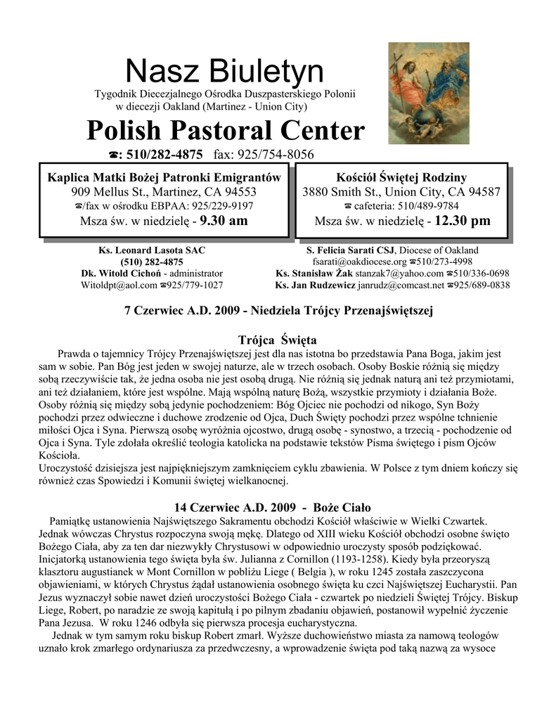 Nasz Biuletyn Tygodnik Diecezjalnego Ośrodka Duszpasterskiego Polonii w diecezji Oakland (Martinez - Union City) Polish Pastoral Center ?: 510/282-4875 fax: 925/754-8056 Kaplica Matki Bożej Patronki Emigrantów 909 Mellus St., Martinez, CA 94553 Kościół Świętej Rodziny 3880 Smith St., Union City, CA 94587 ?/fax w ośrodku EBPAA: 925/229-9197 ? cafeteria: 510/489-9784 Msza św. w niedzielę - 9.30 am Msza św. w niedzielę - 12.30 pm Ks. Leonard Lasota SAC (510) 282-4875 Dk. Witold Cichoń - administrator [email protected] ?925/779-1027 S. Felicia Sarati CSJ, Diocese of Oakland [email protected] ?510/273-4998 Ks. Stanisław Żak [email protected] ?510/336-0698 Ks. Jan Rudzewicz [email protected] ?925/689-0838 7 Czerwiec A.D. 2009 - Niedziela Trójcy Przenajświętszej Trójca Święta Prawda o tajemnicy Trójcy Przenajświętszej jest dla nas istotna bo przedstawia Pana Boga, jakim jest sam w sobie. Pan Bóg jest jeden w swojej naturze, ale w trzech osobach. Osoby Boskie różnią się między sobą rzeczywiście tak, że jedna osoba nie jest osobą drugą. Nie różnią się jednak naturą ani też przymiotami, ani też działaniem, które jest wspólne. Mają wspólną naturę Bożą, wszystkie przymioty i działania Boże. Osoby różnią się między sobą jedynie pochodzeniem: Bóg Ojciec nie pochodzi od nikogo, Syn Boży pochodzi przez odwieczne i duchowe zrodzenie od Ojca, Duch Święty pochodzi przez wspólne tchnienie miłości Ojca i Syna. Pierwszą osobę wyróżnia ojcostwo, drugą osobę - synostwo, a trzecią - pochodzenie od Ojca i Syna. Tyle zdołała określić teologia katolicka na podstawie tekstów Pisma świętego i pism Ojców Kościoła. Uroczystość dzisiejsza jest najpiękniejszym zamknięciem cyklu zbawienia. W Polsce z tym dniem kończy się również czas Spowiedzi i Komunii świętej wielkanocnej. 14 Czerwiec A.D. 2009 - Boże Ciało Pamiątkę ustanowienia Najświętszego Sakramentu obchodzi Kościół właściwie w Wielki Czwartek. Jednak wówczas Chrystus rozpoczyna swoją mękę. Dlatego od XIII wieku Kościół obchodzi osobne święto Bożego Ciała, aby za ten dar niezwykły Chrystusowi w odpowiednio uroczysty sposób podziękować. Inicjatorką ustanowienia tego święta była św. Julianna z Cornillon (1193-1258). Kiedy była przeoryszą klasztoru augustianek w Mont Cornillon w pobliżu Liege ( Belgia ), w roku 1245 została zaszczycona objawieniami, w których Chrystus żądał ustanowienia osobnego święta ku czci Najświętszej Eucharystii. Pan Jezus wyznaczył sobie nawet dzień uroczystości Bożego Ciała - czwartek po niedzieli Świętej Trójcy. Biskup Liege, Robert, po naradzie ze swoją kapitułą i po pilnym zbadaniu objawień, postanowił wypełnić życzenie Pana Jezusa. W roku 1246 odbyła się pierwsza procesja eucharystyczna. Jednak w tym samym roku biskup Robert zmarł. Wyższe duchowieństwo miasta za namową teologów uznało krok zmarłego ordynariusza za przedwczesny, a wprowadzenie święta pod taką nazwą za wysoce niewłaściwe. Co więcej, omalże nie oskarżono św. Julianny o herezję. Karnie została przeniesiona z klasztoru w Mont Cornillon na prowincję (1247). Na interwencję archidiakona katedry w Liege, Jakuba, kardynał Hugo po ponownym zbadaniu sprawy zatwierdził jednak święto. W roku 1251 ponownie archidiakon Jakub poprowadził więc ulicami Liege procesję eucharystyczną. Pan Jezus hojnie wynagrodził za to gorliwego kapłana. Syn szewca z Troyes (Szampania) został wkrótce biskupem w Verdun, patriarchą Jerozolimy i ostatecznie papieżem (1261-1264). Panował jako Urban IV. On to w roku 1264 wprowadził do Rzymu uroczystość Bożego Ciała. Z Ogłoszenia parafialne Z . 25 Maja 2009 została powołana do życia w wieczności nasza parafianka z Union City nieodżałowana śp. Pani Zofia Demska. Była osoba wielce Bogobojna, zawsze uczestniczaca w Niedzielnej Mszy Św. Pan Bóg obdarzył ja długim żywotem, bo dożyła 89 lat. Wypraszajmy u Pana Boga pokój dla jej duszy. Córce z zięciem oraz całej rodzinie składamy serdeczne wyrazy współczucia. Pokój jej duszy. . Do wszystkich zainteresowanych odbiorem Naszego Biuletynu droga internetową. Po otwarciu strony internetowej www.PolishPastoralCenter.org znajdziecie państwo linki do biuletynów. Każdy może sobie je otworzyć i zapoznać z bieżącymi informacjami. . Prezent od Dzieci Pierwszo-komunijnych i ich rodziców w postaci Kapy został już zamówiony. Dostawa prezentu na pewno się odwlecze co najmniej 6 - 8 tygodni, bo jest zamówiony w Europie. Jest to prezent bardzo kosztowny, więc parafia partycypuje w jego zakupie również. Serdeczne Bóg zapłać. . Szkoła Języka Polskiego w Walnut Creek poszukuje nauczycieli na nowy rok szkolny 2009-2010. Chętnych prosimy o kontakt z kierownikiem szkoły p. Tomkiem Kotlinskim [email protected] lub (707)480-8692. Więcej informacji można znaleźć na stronie internetowej szkoły www.polishschool.org . Zebrane składki kościelne. Za złożone ofiary składamy serdeczne Bóg zapłać: Martinez $ 75 $392 $396 $203 $401 $358 + dotacja na Kape $400 $373 04/09/09 04/26/09 05/03/09 05/10/09 05/17/09 05/24/09 05/31/09 Tygodniowo potrzeba w Martinez: $342 Union City $205 $126 $426 $397 i w Union City: $480 Z http://PolishPastoralCenter.org/sacraments Z Nauka religii i przygotowanie do I Komunii św. - w ramach zajęć Szkoły Polskiej. Przygotowanie do bierzmowania - zgłosić co najmniej 2 lata przed planowanym terminem. Odwiedziny chorych - po uprzednim uzgodnieniu telefonicznym, a w sprawach nagłych w każdym czasie. Sakrament pojednania - przed lub po Mszy św. Chrzest - zgłosić co najmniej miesiąc wcześniej. Małżeństwo - zgłosić co najmniej 6 miesięcy przed planowanym terminem. Z Sponsorzy “Naszego Biuletynu” Z Z Ogłoszenia różne: Praca - Kupno - Sprzedaż - Usługi - Rozrywka Z . Praca w Sonomie dla osoby w średnim wieku wraz z zamieszkaniem. Jest to praca do opieki nad osob