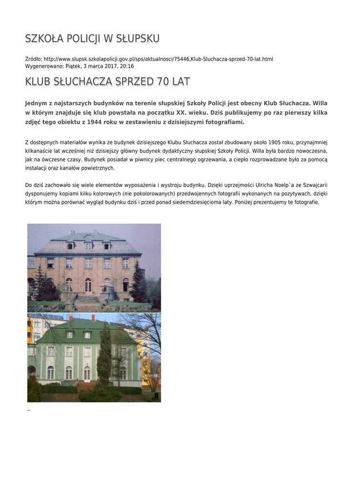 SZKOŁA POLICJI W SŁUPSKU Źródło: http://www.slupsk.szkolapolicji.gov.pl/sps/aktualnosci/75446,Klub-Sluchacza-sprzed-70-lat.html Wygenerowano: Piątek, 3 marca 2017, 20:16 KLUB SŁUCHACZA SPRZED 70 LAT Jednym z najstarszych budynków na terenie słupskiej Szkoły Policji jest obecny Klub Słuchacza. Willa w którym znajduje się klub powstała na początku XX. wieku. Dziś publikujemy po raz pierwszy kilka zdjęć tego obiektu z 1944 roku w zestawieniu z dzisiejszymi fotografiami. Z dostępnych materiałów wynika że budynek dzisiejszego Klubu Słuchacza został zbudowany około 1905 roku, przynajmniej kilkanaście lat wcześniej niż dzisiejszy główny budynek dydaktyczny słupskiej Szkoły Policji. Willa była bardzo nowoczesna, jak na ówczesne czasy. Budynek posiadał w piwnicy piec centralnego ogrzewania, a ciepło rozprowadzane było za pomocą instalacji oraz kanałów powietrznych. Do dziś zachowało się wiele elementów wyposażenia i wystroju budynku. Dzięki uprzejmości Ulricha Noelp`a ze Szwajcarii dysponujemy kopiami kilku kolorowych (nie pokolorowanych) przedwojennych fotografii wykonanych na pozytywach, dzięki którym można porównać wygląd budynku dziś i przed ponad siedemdziesięcioma laty. Poniżej prezentujemy te fotografie. _ _ _ _ _ Ocena: 0/5 (0) Tweetnij