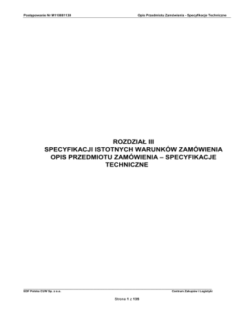 Postępowanie Nr M110001130 Opis Przedmiotu Zamówienia - Specyfikacje Techniczne ROZDZIAŁ III SPECYFIKACJI ISTOTNYCH WARUNKÓW ZAMÓWIENIA OPIS PRZEDMIOTU ZAMÓWIENIA – SPECYFIKACJE TECHNICZNE ____________________________________________________________________________________________________________________ EDF Polska CUW Sp. z o.o. Centrum Zakupów i Logistyki Strona 1 z 135 Postępowanie Nr M110001130 Opis Przedmiotu Zamówienia - Specyfikacje Techniczne Spis treści MIEJSCE PRZECHOWYWANIA ORYGINAŁU: CENTRUM USŁUG WSPÓLNYCH EDF POLSKA / INśYNIERIA / ..........................................................................................BŁĄD! NIE ZDEFINIOWANO ZAKŁADKI. ŚCIEśKA DOSTĘPU DO WERSJI ELEKTRONICZNEJ: ......................BŁĄD! NIE ZDEFINIOWANO ZAKŁADKI. I. PRZEDMIOT ZAMÓWIENIA ........................................................................................................................... 3 1. 2. 3. 4. 5. CEL ZADANIA...................................................................................................................................................... 3 OPIS UWARUNKOWAŃ WYNIKAJĄCYCH ZE STANU ISTNIEJĄCEGO – OGÓLNYCH I BRANśOWYCH ............................... 3 OGÓLNY OPIS PRZEDMIOTU ZAMÓWIENIA / ZAKRES: ............................................................................................. 3 LOKALIZACJA PRZEDMIOTU ZAMÓWIENIA: .......................................................................................................... 81 GRANICE ZAMÓWIENIA: ..................................................................................................................................... 81 II. WYMAGANIA DOTYCZĄCE REALIZACJI ROBÓT..................................................................................... 81 1. 2. WYMAGANIA OGÓLNE ................................................................................................................................ 81 1.1. Wymagania realizacyjne: ................................................................................................................................ 81 1.2. Podstawowe obowiązki Wykonawcy w zakresie realizacji robót: ............................................................. 84 1.3. Organizacja Robót remontowo - montaŜowych ........................................................................................... 88 1.4. Wymagania dla personelu kluczowego ........................................................................................................ 93 1.5. Ruch próbny ...................................................................................................................................................... 93 1.6. Próby Końcowe – Pomiary Odbiorowe. ........................................................................................................ 94 1.7. Odbiory Robót (naleŜy podać własne warunki odbiorowe z uwzględnieniem specyfiki branŜ w przypadku zadań wielobranŜowych) ......................................................................................................................... 94 1.8. Dokumentacja powykonawcza i końcowe dokumenty budowy ................................................................. 95 1.9. Szkolenia ........................................................................................................................................................... 95 1.10. Instrukcje rozruchu, eksploatacji i remontów. .......................................................................................... 95 WYMAGANIA SZCZEGŁOWE DLA REALIZACJI PRAC: ................................................................................... 95 III. WYMAGANIA DOTYCZĄCE PROJEKTOWANIA WYKONAWCZEGO (OGÓLNE I SZCZEGÓŁOWE) 99 1. WYMAGANIA OGÓLNE: ............................................................................................................................... 99 2. WYMAGANIA SZCZEGÓŁOWE WYKONANIA I WARUNKÓW DLA WYKONANIA PROJEKTÓW WYKONAWCZYCH: ........................................................................................................................................... 100 IV. 1. 2. 3. 4. 5. 6. 7. 8. 1. 9. HARMONOGRAM, GWARANCJE, UMOWY SERWISOWE DLA REALIZACJI I PROJEKTOWANIA 105 HARMONOGRAM PROJEKTOWANIA I REALIZACJI ............................................................................................... 105 GWARANCJE .................................................................................................................................................. 108 GWARANCJE TECHNICZNE ............................................................................................................................... 110 UMOWY SERWISOWE....................................................................................................................................... 111 ZAŁĄCZNIK CENOWY- ZAKRES PRAC: ............................................................................................................... 111 ZESTAWIENIE PŁATNOŚCI: ............................................................................................................................... 111 ROBOTY DODATKOWE: ................................................................................................................................... 112 DODATKOWE WYMAGANIA ZAWARTOŚCI OFERTY: ............................................................................................ 112 ZAŁĄCZNIKI .................................................................................................................................................... 112 ZARZĄDZANIE ZADANIEM: ............................................................................................................................... 114 V. WYMAGANIA , INSTRUKCJE PRZEPISY ORAZ SZCZEGÓŁOWE ZASADY BEZPIECZEŃSTAWA: BHP, PRZECIWPOśAROWE I OCHRONY ŚRODOWISKA OBOWIĄZUJĄCE W DANEJ SPÓŁCE ............. 114 VI