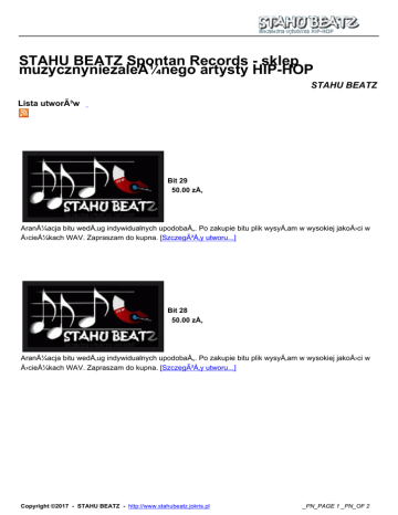 STAHU BEATZ Spontan Records - sklep muzycznyniezależnego artysty HIP-HOP STAHU BEATZ Lista utworów Bit 29 50.00 zÅ‚ Aranżacja bitu wedÅ‚ug indywidualnych upodobaÅ„. Po zakupie bitu plik wysyÅ‚am w wysokiej jakoÅ›ci w Å›cieżkach WAV. Zapraszam do kupna. [Szczegóły utworu...] Bit 28 50.00 zÅ‚ Aranżacja bitu wedÅ‚ug indywidualnych upodobaÅ„. Po zakupie bitu plik wysyÅ‚am w wysokiej jakoÅ›ci w Å›cieżkach WAV. Zapraszam do kupna. [Szczegóły utworu...] Copyright ©2017 - STAHU BEATZ - http://www.stahubeatz.jokris.pl _PN_PAGE 1 _PN_OF 2 Bit 27 50.00 zÅ‚ Aranżacja bitu wedÅ‚ug indywidualnych upodobaÅ„. Po zakupie bitu plik wysyÅ‚am w wysokiej jakoÅ›ci w Å›cieżkach WAV. Zapraszam do kupna. [Szczegóły utworu...] Bit 26 50.00 zÅ‚ Aranżacja bitu wedÅ‚ug indywidualnych upodobaÅ„. Po zakupie bitu plik wysyÅ‚am w wysokiej jakoÅ›ci w Å›cieżkach WAV. Zapraszam do kupna. [Szczegóły utworu...] • • • • • • • • 4 «« Start « Poprzednia 1 2 3 4 NastÄ™pna » Koniec »» ▼ 0 4 PrzeÅ›lij Wyniki 1 - 4 z 30 Copyright ©2017 - STAHU BEATZ - http://www.stahubeatz.jokris.pl _PN_PAGE 2 _PN_OF 2