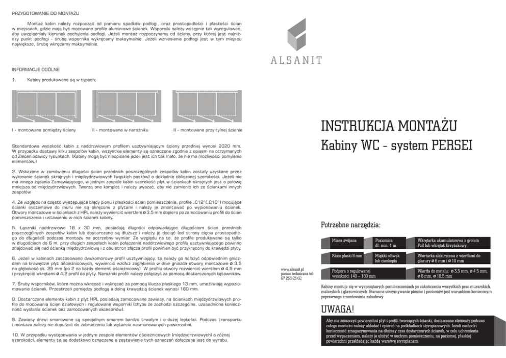 PRZYGOTOWANIE DO MONTAŻU Montaż kabin należy rozpocząć od pomiaru spadków podłogi, oraz prostopadłości i płaskości ścian w miejscach, gdzie mają być mocowane profile aluminiowe ścianek. Wsporniki należy wstępnie tak wyregulować, aby uwzględniały kierunek pochylenia podłogi. Jeżeli montaż rozpoczynamy od ściany, przy której jest najniższy punkt podłogi - śrubę wspornika wykręcamy maksymalnie. Jeżeli wzniesienie podłogi jest w tym miejscu największe, śrubę wkręcamy maksymalnie. INFORMACJE OGÓLNE 1. Kabiny produkowane są w typach: I - montowane pomiędzy ściany II - montowane w narożniku INSTRUKCJA MONTAŻU Kabiny WC - system PERSEI III - montowane przy tylnej ścianie Standardowa wysokość kabin z naddrzwiowym profilem usztywniającym ściany przedniej wynosi 2020 mm. W przypadku dostawy kilku zespołów kabin, wszystkie elementy są oznaczone zgodnie z opisem na otrzymanych od Zleceniodawcy rysunkach. (Kabiny mogą być nieopisane jeżeli jest ich tak mało, że nie ma możliwości pomylenia elementów.) 2. Wskazane w zamówieniu długości ścian przednich poszczególnych zespołów kabin zostały uzyskane przez wykonanie ścianek skrajnych i międzydrzwiowych (wąskich pasków) o dokładnie obliczonej szerokości. Jeżeli nie ma innego żądania Zamawiającego, w jednym zespole kabin szerokość płyt w ściankach skrajnych jest o połowę mniejsza od międzydrzwiowych. Tworzą one komplet i należy uważać, aby nie zamienić ich ze ściankami innych zespołów. 4. Ze względu na często występujące błędy pionu i płaskości ścian pomieszczenia, profile „C12”(„C10”) mocujące ścianki systemowe do muru nie są skręcone z płytami i należy je zmontować po wypionowaniu ścianek. Otwory montażowe w ściankach z HPL należy wywiercić wiertłem 3,5 mm dopiero po zamocowaniu profili do ścian pomieszczenia i ustawieniu w nich ścianek kabiny. 5. Łączniki naddrzwiowe 18 x 30 mm, posiadają długości odpowiadające długościom ścian przednich poszczególnych zespołów kabin lub dostarczane są dłuższe i należy je dociąć (od strony cięcia prostopadłego do długości) podczas montażu na potrzebny wymiar. Ze względu na to, że profile produkowane są tylko w długościach do 6 m, przy długich zespołach kabin połączenie naddrzwiowego profilu usztywniającego powinno znajdować się nad ścianką międzydrzwiową i z obu stron złącza profil powinien być przykręcony do krawędzi płyty. 6. Jeżeli w kabinach zastosowano dwukomorowy profil usztywniający, to należy go nałożyć odpowiednim gniazdem na krawędzie płyt ościeżnicowych, wywiercić wzdłuż zagłębienia w dnie gniazda otwory montażowe 3,5 na głębokość ok. 25 mm (po 2 na każdy element ościeżnicowy). W profilu otwory rozwiercić wiertłem 4,5 mm i przykręcić wkrętami 4,2 profil do płyty. Narożniki profili należy połączyć za pomocą dostarczonych kątowników. 7. Śruby wsporników, które można wkręcać i wykręcać za pomocą klucza płaskiego 13 mm, umożliwiają wypoziomowanie ścianek. Przestrzeń pomiędzy podłogą a dolną krawędzią ścianek wynosi 160 mm. 8. Dostarczane elementy kabin z płyt HPL posiadają zamocowane zawiasy, na ściankach międzydrzwiowych profile do mocowania ścian działowych i regulowane wsporniki (chyba że zachodzi szczególna, uzasadniona konieczność wysłania ścianek bez zamocowanych akcesoriów). 9. Zawiasy drzwi smarowane są specjalnym smarem bardzo trwałym i o dużej lepkości. Podczas transportu i montażu należy nie dopuścić do zabrudzenia lub wytarcia nasmarowanych powierzchni. 10. W przypadku występowania w jednym zespole elementów ościeżnicowych (międzydrzwiowych) o różnej szerokości, elementy te są dodatkowo oznaczane a zestawienie tych oznaczeń dołączane jest do wyrobu. www.alsanit.pl pomoc techniczna tel: 67 253 23 62 Miara zwijana Poziomica ��������� dł. min. 1 m Wkrętarka akumulatorowa z grotem ������ Pz2 lub wkrętak krzyżakowy Miękki ołówek Klucz płaski 8 mm ��������� lub cienkopis Miękkiołówek ołówek Miękki ��������� lubcienkopis cienkopis lub Wiertarka elektryczna z wiertłami do ������ glazury 6 mm i 10 mm Podpora o regulowanej wysokości 140 – 180 mm ��������� Wiertła do metalu: 3,5 mm, 4.5 mm, ������ 6 mm, 10.5 mm Kabiny montuje się w wysprzątanych pomieszczeniach po zakończeniu wszystkich prac murarskich, malarskich i glazurniczych. Staranne utrzymywanie pionów i poziomów jest warunkiem koniecznym poprawnego zmontowania zabudowy UWAGA! Aby nie zniszczyć powierzchni płyt i profili tworzących ścianki, dostarczone elementy podczas całego montażu należy układać i opierać na podkładkach styropianowych. Jeżeli zachodzi konieczność zmagazynowania na dłuższy czas dostarczonych ścianek, w celu uchronienia przed wypaczeniem, należy je ułożyć w suchym pomieszczeniu, na poziomej, płaskiej powierzchni przekładając każdą warstwę styropianem. informacje ogólne znajdziesz na ostatniej stronie Kabiny WC - system PERSEI UWAGA! W celu usprawnienia pracy prosimy zwracać uwagę na kolejność wykonywanych prac. Kolejne kroki oznaczone są dużymi cyframi. 1 2 1+2 3 3a wspornik reg. 3 kołek rozporowy 4 Łączenie profili pod kątem prostym wkręt 2a 5 zaślepka okrągła ścianka miedzydrzwiowa 6 profil usztywniający wkręt M6 7 zamek łazienkowy 8 ścianka działowa 2 ścianka skrajna boczna ścianka skrajna przyścienna pochwyt 1. Skręć element ościeżnicowy (międzydrzwiowy) ze ścianką działową wkrętami 4,2 mm. 2. Ustaw następny element ościeżnicowy na wyznaczonej linii tak aby szczelina pomiędzy nim a skrzydłem drzwiowym wynosiła 3 mm. 3. Kręcąc podstawkami wsporników w odpowiednią stronę, wyrównaj wysokości elementów przyściennego i międzydrzwiowego według kroku 1 p.2. 4. Zamocuj ściankę dzia