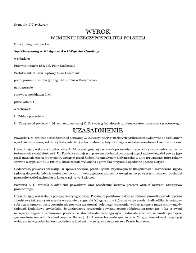 Sygn. akt: I C 1782/13 WYROK W IMIENIU RZECZYPOSPOLITEJ POLSKIEJ Dnia 3 lutego 2014 roku Sąd Okręgowy w Białymstoku I Wydział Cywilny w składzie: Przewodniczący: SSR del. Piotr Kozłowski Protokolant: st. sekr. sądowy Anna Owerczuk po rozpoznaniu w dniu 3 lutego 2014 roku w Białymstoku na rozprawie sprawy z powództwa I. M. przeciwko Z. U. o zachowek I. Oddala powództwo. II. Zasądza od powódki I. M. na rzecz pozwanej Z. U. kwotę 3 617 złotych tytułem kosztów zastępstwa procesowego. UZASADNIENIE Powódka I. M. wniosła o zasądzenie od pozwanej Z. U.kwoty 158.357,58 złotych tytułem zachowku wraz z odsetkami w wysokości ustawowej od dnia 5 listopada 2013 roku do dnia zapłaty. Domagała się także zasądzenia kosztów procesu. Uzasadniając, wskazała iż jako córce A. M. przysługuje jej zachowek po zmarłym ojcu, który cały spadek zapisał w testamencie swojej siostrze Z. U.. Powódka niniejszym pozwem dochodzi pozostałej części zachowku, gdyż pewną jego część uzyskała już na mocy ugody zawartej przed Sądem Rejonowym w Białymstoku w dniu 23 września 2013 roku w sprawie o sygn. akt XI C 1311/13, która została wykonana i powódka otrzymała ugodzone 35.000 złotych. Dodatkowo powódka wskazuje, iż sprawa toczona przed Sądem Rejonowym w Białymstoku i zakończona ugodą sądową dotyczyła jedynie części zachowku, tj. kwoty 50.000 złotych, z uwagi na to powyższym pozwem dochodzi pozostałej części zachowku w kwocie 158.357,58 złotych. Pozwana Z. U. wniosła o oddalenie powództwa oraz zasądzenie kosztów procesu wraz z kosztami zastępstwa procesowego. Uzasadniając, wskazała na powagę rzeczy ugodzonej. Podała, że podstawa faktyczna żądania powódki jest identyczna z podstawą faktyczną roszczenia w sprawie o sygn. akt XI 1311/13, w której zawarto ugodę. Podkreśliła, że ustalony substrat w tamtym postępowaniu nie pozwala generować kolejnego roszczenia, wobec zawarcia przez strony ugody sądowej. Dodatkowo stwierdziła, że dochodzone roszczenie powinno zostać oddalone na mocy art. 5 k.c. z uwagi na wysoce naganne zachowanie powódki w stosunku do zmarłego ojca. Podniosła również, że środki pieniężne zgromadzone na rachunku bankowym w Banku (...) S.A. nie wchodzą do spadku po A. M., gdyż ten dokonał dyspozycji wkładem na wypadek śmierci zgodnie z art. 56 ust 1 w związku z ust 5 ustawy Prawo bankowe. Sąd ustalił, co następuje: Powódka I. M. jest jedyną córką A. M., zmarłego w dniu 10 stycznia 2013 roku. Spadkodawca A. M. w dniu 20 lutego 2009 roku sporządził testament, na mocy którego jedynym spadkobiercą uczynił swoją siostrę Z. U.. Sąd Rejonowy w Białymstoku postanowieniem z dnia 11 czerwca 2013 roku w sprawie o syg. Akt II Ns 634/13 stwierdził, iż cały spadek po zmarłym A. M. na podstawie testamentu notarialnego z dnia 20 lutego 2009 roku nabyła siostra Z. U.. Dowód: odpis skrócony aktu zgonu, wypis testamentu notarialnego z dnia 20 lutego 2009 roku, odpis skrócony urodzenia I. M., postanowienie Sądu Rejonowego w Białymstoku z dnia 11 czerwca 2013 roku - akta sprawy sygn. akt II Ns 634/13; k. 3, k. 21, k. 27, k. 43 Dnia 14 czerwca 2013 roku I. M. złożyła do Sądu Rejonowego w Białymstoku pozew, którym dochodziła od pozwanej częściowej zapłaty kwoty zachowku w wysokości 50.000 złotych. W odpowiedzi na powyższy pozew oraz w trakcie postępowania strona pozwana wnosiła o oddalenie powództwa na podstawie art. 5 k.c. podnosząc, iż zachowanie powódki wobec zmarłego ojca było wysoce naganne i sprzeczne z zasadami współżycia społecznego. W trakcie toczącego się postępowania przed Sądem Rejonowym w Białymstoku, sygn. akt XI C 1311/13 ustalono, że w skład masy majątkowej po zmarłym A. M. wchodziła nieruchomość stanowiąca spółdzielcze własnościowe prawo do lokalu mieszkalnego nr (...) przy ul (...) w B. oraz środki pieniężne zgromadzone na rachunkach bankowych w Banku (...) S.A., które zostały objęte dyspozycją na wypadek śmierci. W dniu 23 września 2013 roku na rozprawie przed Sądem Rejonowym w Białymstoku strony zawarły ugodę sądową, na mocy której pozwana Z. U. zobowiązała się zapłacić powódce I. M. kwotę 35.000 złotych w terminie do dnia 10 października 2013 roku tytułem zachowku, z ustawowymi odsetkami w wysokości 13 % w stosunku rocznym, w przypadku nieuiszczenia tej kwoty w ugodzonym terminie. Strony oświadczyły, że ugodzona suma wyczerpuje całość roszczeń dochodzonych w sprawie. Dowód: pozew z dnia 14 czerwca 2013 roku, odpowiedz na pozew z dnia 3 lipca 2013 roku, dokumentacja banku, ugoda sądowa – protokół z rozprawy Sądu Rejonowego w Białymstoku z dnia 23 września 2013 roku, postanowienie Sądu Rejonowego w Białystoku z dnia 23 września 2013 roku - akta sprawy syg. Akt XI C 1311/13; k. 2 – k. 3, k. 29 – k.32, k. 69 – k. 71, k. 91. k. 93 Ostatecznie pozwana na skutek zawarcia ugody przed Sądem Rejonowym w Białymstoku dokonała zapłaty ugodzonej kwoty 35.000 złotych osobiście do rąk powódki. Dowód: okoliczność bezsporna Sąd zważył, co następuje Zgodnie z art. 917 k.c. przez ugodę strony czynią sobie wzajemne ustępstwa w zakresie istniejącego między nimi stosunku prawnego. Ustępstwa czynione przez strony mogą mieć na celu uchylenie niepewności, co do roszczeń wynikających z tego stosunku lub zapewnienie ich wykonania albo uchylenie istniejącego lub mogącego powstać sporu. Ugoda jest umową, która umożliwia likwidowanie konfliktów na drodze kompromisu bez konieczności odwoływania się i angażowania osób trzecich. Uzasadnieniem dla zawarcia ugody może być niepewność stron w zakresie ich sytuacji prawnej, która oceniana jest w kategoriach subiektywnych. Istotą ugody jest czynienie sobie wzajemnie ustępstw w zakresie oczekiwanych rezultatów stosunku prawnego regulowanego przez strony. Ugoda sądowa z punktu widzenia prawa materialnego jest umową ( por. wyrok Sąd