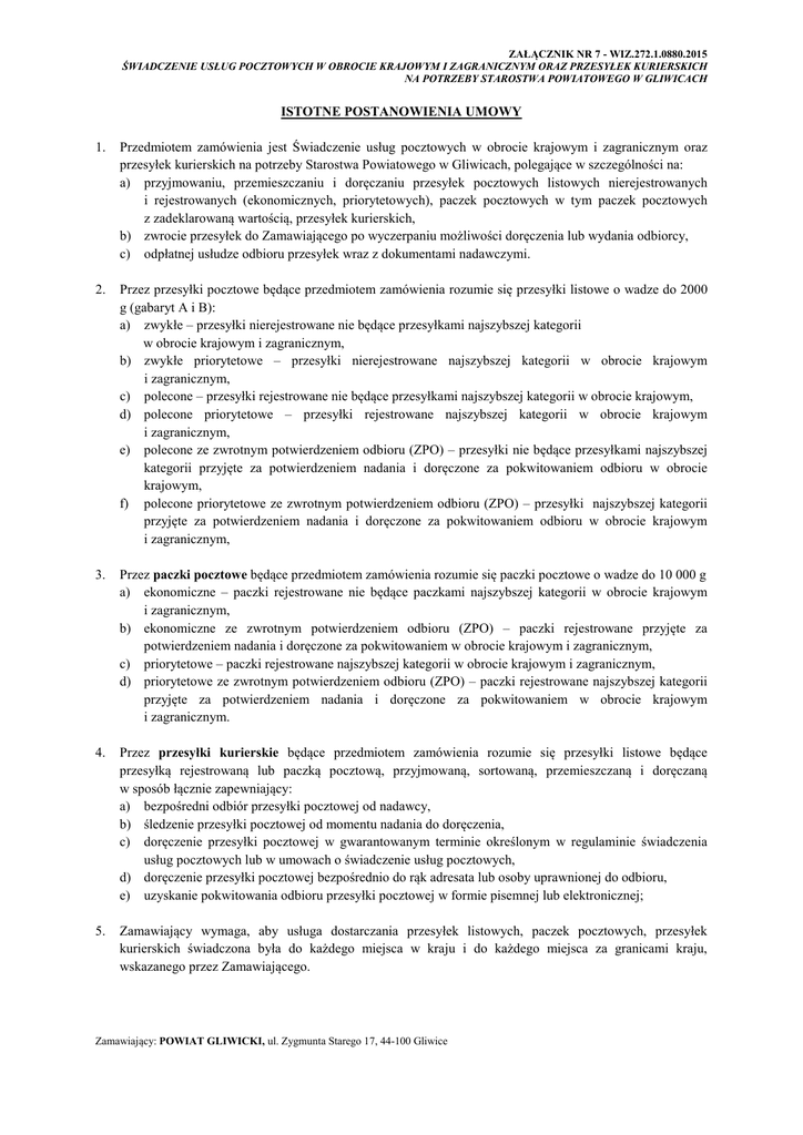 ZAŁĄCZNIK NR 7 - WIZ.272.1.0880.2015 ŚWIADCZENIE USŁUG POCZTOWYCH W OBROCIE KRAJOWYM I ZAGRANICZNYM ORAZ PRZESYŁEK KURIERSKICH NA POTRZEBY STAROSTWA POWIATOWEGO W GLIWICACH ISTOTNE POSTANOWIENIA UMOWY 1. Przedmiotem zamówienia jest Świadczenie usług pocztowych w obrocie krajowym i zagranicznym oraz przesyłek kurierskich na potrzeby Starostwa Powiatowego w Gliwicach, polegające w szczególności na: a) przyjmowaniu, przemieszczaniu i doręczaniu przesyłek pocztowych listowych nierejestrowanych i rejestrowanych (ekonomicznych, priorytetowych), paczek pocztowych w tym paczek pocztowych z zadeklarowaną wartością, przesyłek kurierskich, b) zwrocie przesyłek do Zamawiającego po wyczerpaniu możliwości doręczenia lub wydania odbiorcy, c) odpłatnej usłudze odbioru przesyłek wraz z dokumentami nadawczymi. 2. Przez przesyłki pocztowe będące przedmiotem zamówienia rozumie się przesyłki listowe o wadze do 2000 g (gabaryt A i B): a) zwykłe – przesyłki nierejestrowane nie będące przesyłkami najszybszej kategorii w obrocie krajowym i zagranicznym, b) zwykłe priorytetowe – przesyłki nierejestrowane najszybszej kategorii w obrocie krajowym i zagranicznym, c) polecone – przesyłki rejestrowane nie będące przesyłkami najszybszej kategorii w obrocie krajowym, d) polecone priorytetowe – przesyłki rejestrowane najszybszej kategorii w obrocie krajowym i zagranicznym, e) polecone ze zwrotnym potwierdzeniem odbioru (ZPO) – przesyłki nie będące przesyłkami najszybszej kategorii przyjęte za potwierdzeniem nadania i doręczone za pokwitowaniem odbioru w obrocie krajowym, f) polecone priorytetowe ze zwrotnym potwierdzeniem odbioru (ZPO) – przesyłki najszybszej kategorii przyjęte za potwierdzeniem nadania i doręczone za pokwitowaniem odbioru w obrocie krajowym i zagranicznym, 3. Przez paczki pocztowe będące przedmiotem zamówienia rozumie się paczki pocztowe o wadze do 10 000 g a) ekonomiczne – paczki rejestrowane nie będące paczkami najszybszej kategorii w obrocie krajowym i zagranicznym, b) ekonomiczne ze zwrotnym potwierdzeniem odbioru (ZPO) – paczki rejestrowane przyjęte za potwierdzeniem nadania i doręczone za pokwitowaniem w obrocie krajowym i zagranicznym, c) priorytetowe – paczki rejestrowane najszybszej kategorii w obrocie krajowym i zagranicznym, d) priorytetowe ze zwrotnym potwierdzeniem odbioru (ZPO) – paczki rejestrowane najszybszej kategorii przyjęte za potwierdzeniem nadania i doręczone za pokwitowaniem w obrocie krajowym i zagranicznym. 4. Przez przesyłki kurierskie będące przedmiotem zamówienia rozumie się przesyłki listowe będące przesyłką rejestrowaną lub paczką pocztową, przyjmowaną, sortowaną, przemieszczaną i doręczaną w sposób łącznie zapewniający: a) bezpośredni odbiór przesyłki pocztowej od nadawcy, b) śledzenie przesyłki pocztowej od momentu nadania do doręczenia, c) doręczenie przesyłki pocztowej w gwarantowanym terminie określonym w regulaminie świadczenia usług pocztowych lub w umowach o świadczenie usług pocztowych, d) doręczenie przesyłki pocztowej bezpośrednio do rąk adresata lub osoby uprawnionej do odbioru, e) uzyskanie pokwitowania odbioru przesyłki pocztowej w formie pisemnej lub elektronicznej; 5. Zamawiający wymaga, aby usługa dostarczania przesyłek listowych, paczek pocztowych, przesyłek kurierskich świadczona była do każdego miejsca w kraju i do każdego miejsca za granicami kraju, wskazanego przez Zamawiającego. Zamawiający: POWIAT GLIWICKI, ul. Zygmunta Starego 17, 44-100 Gliwice ZAŁĄCZNIK NR 7 - WIZ.272.1.0880.2015 ŚWIADCZENIE USŁUG POCZTOWYCH W OBROCIE KRAJOWYM I ZAGRANICZNYM ORAZ PRZESYŁEK KURIERSKICH NA POTRZEBY STAROSTWA POWIATOWEGO W GLIWICACH 6. W przypadku przesyłek wymagających nadania u operatora wyznaczonego Zamawiający wymaga, aby Wykonawca gwarantował, aby potwierdzenie nadania przesyłki rejestrowanej miało moc dokumentu urzędowego i skutkowało zachowaniem terminów o których mowa w art. 57 § 5 pkt 2 Kodeksu postępowania administracyjnego, w art. 165 § 2 Kodeksu postępowania cywilnego oraz na podstawie innych przepisów bezwzględnie obowiązujących, gdzie przewidziany został skutek zachowania terminu wniesienia takiej przesyłki poprzez operatora wyznaczonego w rozumieniu ustawy z dnia 23 listopada 2012r. Prawo pocztowe lub w placówce operatora świadczącego pocztowe usługi powszechne w innym państwie członkowskim Unii Europejskiej. (t.j. Dz. U. z 2013r. poz. 267). 7. Zamawiający sporządzi odrębną książkę nadawczą przesyłek wymagających nadania u operatora wyznaczonego, w celu ich wydzielenia i nadania przez Wykonawcę u operatora wyznaczonego. Wykaz taki zostanie sporządzony na dzień odbioru tych przesyłek przez Wykonawcę. 8. Wykonawca, w przypadku przesyłek wymagających nadania u operatora wyznaczonego zobowiązany będzie do: a) odebrania wydzielonych przesyłek pocztowych, b) dostarczenia i nadania w imieniu Zamawiającego wydzielonych przesyłek w dniu sporządzenia wykazu, c) dostarczenia uzyskanego potwierdzenia nadania wydzielonych przesyłek, Zamawiającemu najpóźniej następnego dnia, d) nie zmieniania danych Zamawiającego na kopercie. Zamawiający nie dopuszcza przepakowywania przesyłek. 9. Zamawiający nie dopuszcza sytuacji, w której część przesyłek zostanie nadana przez inny podmiot w imieniu i na rzecz Zamawiającego, w wyniku czego na przesyłkach lub dowodzie nadania przesyłki będzie figurował inny podmiot niż Zamawiający. 10. W ramach świadczenia usług Wykonawca zobowiązany będzie do odbioru przesyłek z siedziby Zamawiającego tj. Starostwa Powiatowego w Gliwicach, ul. Z. Starego 17, 44-100 Gliwice, codziennie od poniedziałku do piątku na koszt Zamawiającego w godzinach od 13:00 do 13.30.W przypadku przesyłek kurierskich, przesyłki odbierane będą w trakcie urzędowania Starostwa Powiatowego w Gliwicach. 11. Zamawiający w wyjątkowych sytuacjach zastrzega 