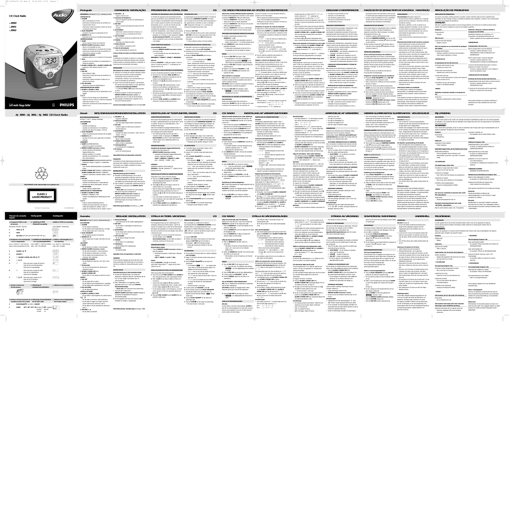 XP AJ395x/00 7x3 deel B 06-02-2001 12:20 Pagina 1 Português Audio CD Clock Radio 3950 AJ-3951 AJ-3952 AJ- OCK RADIO ACT DISC CL AJ3950 COMP STOP PLAY/PAUSE H SEARC SEARCH M AT ALAR CONTROL REPE BRIGHTNESS SLEEP Y SET DA IO OO IO I IO IO OI WEEKENDSLEEPER M2 ALAR/OFF DE MO DE ALARM 1 2 MODE/OFF ZZ 1 FM RADIO SLEEP ME VOLU RADIO ON ON OFF OFF L -A • ARM hz • 108 M 1600 k Hz 104 1200 S E T AR A LA AL RM 2 TI E 98 850 • 93 630 FM 88 • MW 530 M FM FM AM AM M 1 TI M E AJ 3950 - AJ 3951 - AJ 3952 CD Clock Radio COMANDOS/ INSTALAÇÃO #VOLUME $, 3 - regula o nível do som. •LEITOR DE CD $Indicador de frequência 1STOP 9 - indica a frequência da faixa de radiofrequência - pára a reprodução de um CD; seleccionada - interrompe a função de tempo de sonolência no %SET DAY modo de leitor de CD; - define o dia para activação da função de fim de - interrompe o alarme activado no leitor de CD por semana. um período de 24 horas. ^24 HR RESET 2PLAY/ PAUSE 2; - interrompe o alarme activado no besouro, no - inicia/faz uma pausa na reprodução do CD. rádio ou no CD por um período de 24 horas. 3SEARCH ∞, § &LIFT TO OPEN - salta faixas do CD/ busca uma determinada passagem. - abre e fecha a tampa do compartimento do CD. •GENERALIDADES *TUNING 4SLEEP - sintoniza uma estação de rádio. - activa e ajusta o tempo de sonolência. (Antena flexível 5REPEAT ALARM/ BRIGHTNESS CONTROL - para melhorar a recepção em FM. - altera a luminosidade do visor; )Cabo de alimentação - desliga o despertador por um período de 9 minutos; - para a alimentação de corrente CA. - interrompe a função de tempo de sonolência no A placa de tipo encontra-se na base do aparelho. modo de CD, besouro, ou rádio. 6WEEKEND-SLEEPER AVISO - desactiva o alarme 1 e/ ou 2 durante o fim de semana. A utilização de comandos ou ajustes ou a execução 7Visor de procedimentos diferentes daqueles aqui indicados - visualiza a hora do relógio ou do despertador e o poderá resultar em exposição perigosa a radiações ou estado do aparelho. noutro tipo de funcionamento não seguro. 8ALARM 1 MODE/ OFF ou ALARM 2 MODE/ OFF - programa/ revê/ desliga o alarme 1 ou 2. INSTALAÇÃO •RÁDIO Alimentação de corrente e modo de demonstração 9ON/ OFF 1 Verifique se a tensão da corrente indicada na placa - liga e desliga o rádio; de tipo que se encontra na base do aparelho - interrompe a função de tempo de sonolência no corresponde à da sua rede local. Se não modo de rádio; corresponder, contacte o seu concessionário ou o - interrompe o alarme activado no rádio por um centro encarregado da assistência. período de 24 horas. 2 Ligue a ficha à tomada da parede. A alimentação 0FM/ AM (MW) de corrente está agora ligada e no visor aparecerá - selecciona a faixa de radiofrequência. o modo de demonstração PHILIPS. •PROGRAMAÇÃO DE HORAS ™ A indicação PH..IL ..IPS passa continuamente !ALARM 1, ALARM 2, TIME no visor. - programa a respectiva hora do despertador ou do • Pressione qualquer comando (à excepção de relógio REPEAT ALARM/ BRIGHTNESS CONTROL, no @7 , 8 aparelho) para sair do modo de demonstração. - acerta a hora do relógio ou do despertador; - regula os volumes mínimo e máximo do despertar 3 Para desligar completamente o aparelho, tire a ficha da tomada da parede. suave para o alarme 1 ou 2; - selecciona uma faixa do CD para despertar com o Consumo de energia em espera (modo de relógio).3 W alarme 1 ou 2. COMANDOS (vide figuras 1 e 2 , entregar por favor) Dansk BETJENINGSANORDNINGER/INSTALLATION BETJENINGSANORDNINGER (se figur 1 og 2 , behage overdrage) Meet PHILIPS at the internet http://www.philips.com CLASS 1 LASER PRODUCT Printed in Hong Kong Cmm/RB/0102 Manual de consulta rápida Hurtig guide Snabbguide a. Programar TIME e o dia da semana a. Indstilling af TIME (tidspunkt) og ugedag a.Ställa in TIME och veckodag •CD-AFSPILLER 1STOP 9 - standser CD-afspilning - standser slumrefunktionen i CD-indstilling - standser den aktive CD-vækker i 24 timer 2PLAY/ PAUSE 2; - starter CD-afspilning eller afbryder den et øjeblik 3SEARCH ∞, § - springer CD-numre over/ søger efter en bestemt passage. •GENERELT 4SLEEP (SLUMREFUNKTION) - aktiverer og justerer slumretiden. 5REPEAT ALARM/ BRIGHTNESS CONTROL - ændrer lysstyrken på displayets baggrundsbelysning - afbryder vækkeren i 9 minutter - standser slumrefunktioner i CD-, summetoneeller radioindstilling. 2 WEEKENDSLEEPER (WEEKENDSLEEPERFUNKTION) - deaktiverer vækker 1 og/eller 2 i weekenden. 7Display - viser urtiden/vækketidspunkterne og apparatets status. 8ALARM 1 MODE/ OFF (VÆKKER 1 /AFBRUDT) eller ALARM 2 MODE/ OFF (VÆKKER 2 /AFBRUDT) - indstiller/ kontrollerer/ afbryder vækker 1 eller 2. •RADIO 9ON/ OFF - tænder og slukker for radioen - standser slumrefunktionen i radioindstilling - standser den aktive radiovækker i 24 timer 0FM/ AM (MW) - vælger radioens bølgeområde. •INDSTILLING AF TIDSPUNKTER !ALARM 1, ALARM 2, TIME (VÆKKER 1, VÆKKER 2, TID) - indstiller det pågældende vækketidspunkt eller urtiden @7 , 8 - justerer urtiden/vækketidspunkterne - indstiller den blide væknings minimale og maksimale lydstyrke for vækker 1 eller 2 - vælger et CD-melodinummer for vækker 1 eller 2 Svenska REGLAGE (Se figur 1 och 2, behag vända över) Pressionar/ Tryk på/ Tryck på: visor/ display/ teckenrutan: 1 TIME , 7 / 8 12:33 2 TIME 12:33 3 SET DAY (1 ➠ 2 ➠ 3 ➠ 4 ➠ 5 ➠ 6 ➠ 7 ➠ 1...) 7 b. Programar a hora de despertar b. Indstilling af vækketidspunkt b. Ställa in väckningstid 1 & 2 1 e 2 e o despertador 1 & 2 og vækningsfunktion och väckning por ex. o Alarme 1 (por besouro, rádio ou faixa de despertar do CD) f.eks. vækker 1 (med summetone-, t.ex.. Alarm 1 (med ringning, radio- eller CD-vækning) radio eller CD-spår) 1 ALARM 1, 7 / 8 6:30 2 ALARM 1 6:30 3 1 (ALARM 1 MODE, ON/ OFF), 7 / 8 Lo:00 4 1, 7 / 8 H1:16 5 1 6 7 Parar aqui para a opção de besouro Stop her for summetonefunktion Sluta här fö