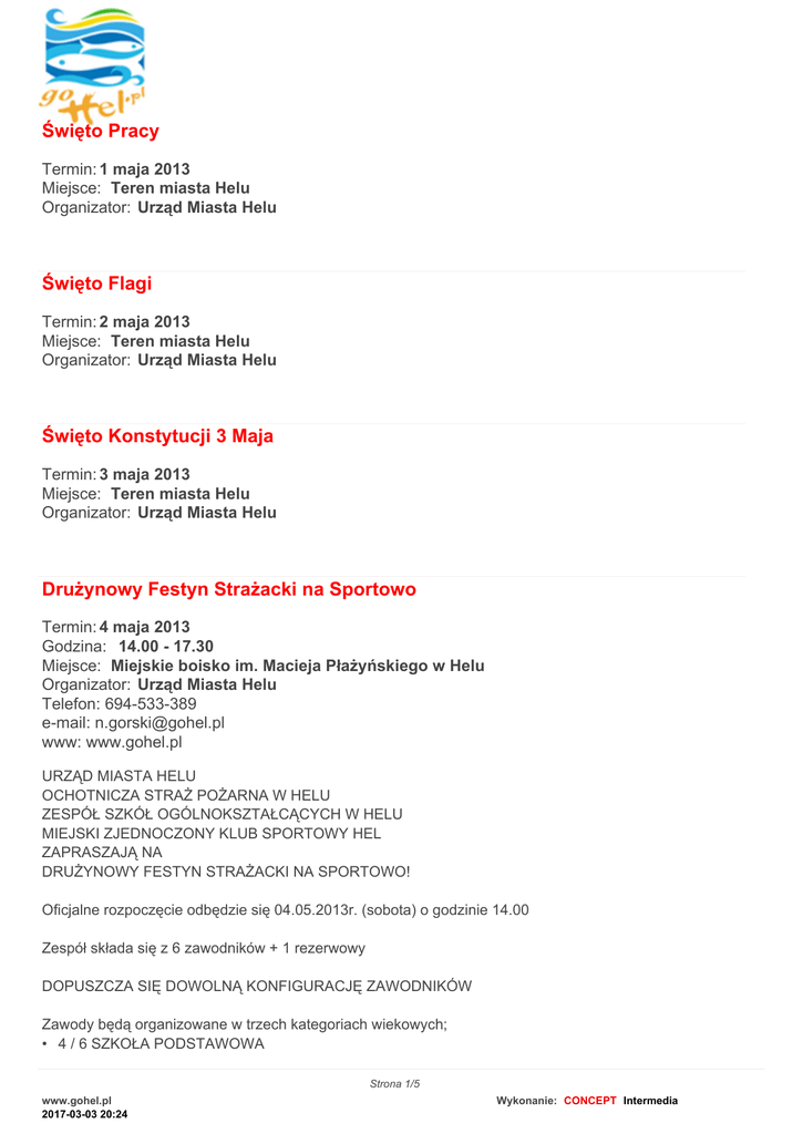 Święto Pracy Termin: 1 maja 2013 Miejsce: Teren miasta Helu Organizator: Urząd Miasta Helu Święto Flagi Termin: 2 maja 2013 Miejsce: Teren miasta Helu Organizator: Urząd Miasta Helu Święto Konstytucji 3 Maja Termin: 3 maja 2013 Miejsce: Teren miasta Helu Organizator: Urząd Miasta Helu Drużynowy Festyn Strażacki na Sportowo Termin: 4 maja 2013 Godzina: 14.00 - 17.30 Miejsce: Miejskie boisko im. Macieja Płażyńskiego w Helu Organizator: Urząd Miasta Helu Telefon: 694-533-389 e-mail: [email protected] www: www.gohel.pl URZĄD MIASTA HELU OCHOTNICZA STRAŻ POŻARNA W HELU ZESPÓŁ SZKÓŁ OGÓLNOKSZTAŁCĄCYCH W HELU MIEJSKI ZJEDNOCZONY KLUB SPORTOWY HEL ZAPRASZAJĄ NA DRUŻYNOWY FESTYN STRAŻACKI NA SPORTOWO! Oficjalne rozpoczęcie odbędzie się 04.05.2013r. (sobota) o godzinie 14.00 Zespół składa się z 6 zawodników + 1 rezerwowy DOPUSZCZA SIĘ DOWOLNĄ KONFIGURACJĘ ZAWODNIKÓW Zawody będą organizowane w trzech kategoriach wiekowych; • 4 / 6 SZKOŁA PODSTAWOWA Strona 1/5 www.gohel.pl 2017-03-03 20:24 Wykonanie: CONCEPT Intermedia • GIMNAZJUM/ LICEUM • DOROŚLI Zgłoszenia prosimy przesłać do dnia 03.05.2013 r. na adres [email protected] lub telefonicznie Norbert Górski 694-533-389 Udział w zawodach jest BEZPŁATNY SERDECZNIE ZAPRASZAMY DO ZAPISÓW I WSPÓLNEJ ZABAWY! Międzynarodowy Dzień Zwycięstwa Termin: 8 maja 2013 Miejsce: Teren miasta Helu Organizator: Urząd Miasta Helu Noc Sportu w Helu Termin: 18 maja 2013 Godzina: 17.30 - 24.00 Miejsce: Miejska Hala Sportowo - Widowiskowa w Helu Telefon: 694-533-389 e-mail: [email protected] 17.30 – 19.00 – Tenis Ziemny dla kobiet i mężczyzn 19.00 – 19.30 – Mecz piłki nożnej U-10 TYMBARK ZSO Hel 1 vs. ZSO Hel 2 19.30 – 20.00 – Turniej Piłki Nożnej klas 4/5 vs. 6 klasy Szkoły Podstawowej 20.00 – 21.30 – Rodziny Turniej Badmintona – gra pojedyncza i podwójna 21.30 – 23.00 – Turniej Piłki Siatkowej dziewcząt i chłopców „DWÓJKAMI” 23.00 – 24.00 – Mecz Piłki Nożnej Oldboje vs. MZKS Hel 24.00 - ……… – Mecz Piłki Nożnej Alternatywny Cypel vs. OSP Hel WSTĘP 1 ZŁ KIEDY : 18.05.2013 START GODZINA 17.30 - Osoby posiadające karnet na poszczególne dyscypliny uczestniczą w rozgrywkach BEZPŁATNIE Kontakt Norbert Górski 694-533-389 Noc Muzeów Termin: 18 maja 2013 Godzina: 18.00 - 24.00 Strona 2/5 www.gohel.pl 2017-03-03 20:24 Wykonanie: CONCEPT Intermedia Miejsce: Muzeum Obrony Wybrzeza Organizator: Muzeum Obrony Wybrzeża Stowarzyszenia „Przyjaciele Helu” Adres: Hel, ul. Helska 16 Telefon: 697-888-584 WĹ‚. Szarski e-mail: [email protected] www: helmuzeum.pl Muzeum Obrony Wybrzeża Stowarzyszenia "Przyjaciele Helu" zaprasza 18 maja na NOC MUZEÓW Wstęp wolny, bezpłatny, prosimy zabrać latarki, początek o godz. 18-tej. Przewidujemy: • Darmowe, nocne zwiedzanie muzeum • Trwająca od godz. 18 inscenizacja historyczna z dojazdem kolejką (szczegóły na stronie helmuzeum.pl) • Występy zespołu dziecięcego JANTAREK • Prelekcja w kręgu działobitni - dwa interesujące tematy. • Nauka musztry z karabinem • Występy zespołu młodzieżowego SARkazm • Ognisko z kiełbaskami (można przynieść własne, lub nabyć na miejscu) • Karaoke z szantami Ze względu na las dookoła kategorycznie zakazuje się używania ognia poza miejsce wyznaczonym na ognisko, w tym także zakaz odpalania rac, petard i t.p. Polska Biega 2013 Termin: 24 maja 2013 Godzina: 12.00 - 14.00 Miejsce: Hel Organizator: Urząd Miasta Helu Telefon: 694-533-389 e-mail: [email protected] www: www.gohel.pl POLSKA BIEGA 2013 w Helu Zgłoszenia do biegu POLSKA BIEGA 2013 proszę kierować drogą e-mail na adres [email protected] lub telefonicznie Norbert Górski 694-533-389 podając imię i nazwisko oraz dzień, miesiąc i rok urodzenia. Bieg odbędzie się ulicami miasta Helu w trzech kategoriach wiekowych: do lat 10 na dystansie 300 m. - ul. Wiejska do lat 15 na dystansie 1700 m – ul. Wiejska, Kaszubska, Adm. Steyera, Helski leśny szlak turystyczny (wyjście 65), Adm. Steyera, Kaszubska, Wiejska od lat 16 plus na dystansie 2600 m. - Wiejska, Kaszubska, Adm. Steyera, Helski leśny szlak turystyczny (wyjście 65), Adm. Steyera, Kmdr. por. Z Przybyszewskiego, Wiejska SERDECZNIE ZAPRASZAMY DO UDZIAŁU W BIEGU! Strona 3/5 www.gohel.pl 2017-03-03 20:24 Wykonanie: CONCEPT Intermedia Noc Bibliotek 2013 - Literackie podchody Termin: 28 maja 2013 Godzina: 18.00 - 22.00 Miejsce: Hel Organizator: Miejska Biblioteka Publiczna i Studio Tańca Dance Flow Adres: Komandorska 2, 84-150 Hel Telefon: 58 675-09-67 e-mail: [email protected] www: www.mbp-hel.org.pl Miejska Biblioteka Publiczna i ST Dance Flow zapraszają na Literackie podchody, organizowane w ramach „Nocy Bibliotek”. Drużyny, składające się z 3-4 osób w wieku od 7-17 lat (przynajmniej jedna osoba w drużynie musi być uczniem gimnazjum) można zgłaszać do dnia 24 maja 2013 r. Podchody odbędą się w dniu 28 maja 2013 r. Noc Bibliotek 2013 zakończymy wspólną zabawą przy ognisku i kiełbaskach. Zgłaszanie drużyn i szczegółowe informacje – w Bibliotece lub pod numerem telefonu 58 675-09-67. Test COOPERA Termin: 31 maja 2013 Godzina: 18.00 Miejsce: Boisko miejskie im. M. Płażyńskiego w Helu Telefon: 694-533-389 e-mail: [email protected] www: www.gohel.pl Serdecznie zapraszamy na Test COOPERA Test Coopera - próba wytrzymałościowa opracowana przez amerykańskiego lekarza Kennetha H. Coopera na potrzeby armii USA w 1968 roku, polegająca na 12-minutowym nieprzerwanym biegu. Obecnie jest szeroko stosowany do badania sprawności fizycznej przede wszystkim sportowców. Polega on na przemierzeniu (w dowolny sposób: biegnąc, idąc o własnych siłach) jak największego dystansu w ciągu 12 minut. 31.05.2013 godz. 18.00 na miejskim boisku im. M. Płażyńskiego w Helu Chcesz się sprawdzić PRZYJDŹ!!! Kontakt i zapisy: Norbert Górski 694-533-389 lub [email protected] Turniej Tenisowy o Puchar Artura Szostaczko Strona 4/