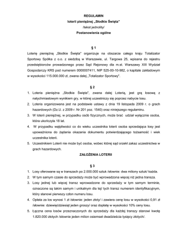 REGULAMIN loterii pieniężnej „Słodkie Święta” /tekst jednolity/ Postanowienia ogólne §1 Loterię pieniężną „Słodkie Święta" organizuje na obszarze całego kraju Totalizator Sportowy Spółka z o.o. z siedzibą w Warszawie, ul. Targowa 25, wpisana do rejestru przedsiębiorców prowadzonego przez Sąd Rejonowy dla m.st. Warszawy XIII Wydział Gospodarczy KRS pod numerem 0000007411, NIP 525-00-10-982, o kapitale zakładowym w wysokości 115.000.000 zł, zwana dalej „Totalizator Sportowy". §2 1. Loteria pieniężna „Słodkie Święta", zwana dalej Loterią, jest grą losową z natychmiastowym wynikiem gry, w której uczestniczy się poprzez nabycie losu. 2. Loteria organizowana jest na podstawie ustawy z dnia 19 listopada 2009 r. o grach hazardowych (Dz.U. z 2009 r. Nr 201 poz. 1540) oraz niniejszego regulaminu. 3. W loterii pieniężnej, w przypadku osób fizycznych, może brać udział wyłącznie osoba, która ukończyła 18 lat. 4. W przypadku wątpliwości co do wieku uczestnika loterii osoba sprzedająca losy jest upoważniona do żądania okazania dokumentu potwierdzającego tożsamość i wiek uczestnika loterii. 5. Uczestnikiem Loterii nie może być osoba, wobec której sąd orzekł zakaz uczestnictwa w grach hazardowych. ZAŁOŻENIA LOTERII §3 1. Losy oferowane są w transzach po 2.000.000 sztuk /słownie: dwa miliony sztuk/ każda. 2. W tym samym czasie do sprzedaży może być wprowadzona więcej niż jedna transza. 3. Losy jednej lub więcej transz wprowadzone do sprzedaży w tym samym terminie, oznaczone są takim samym i unikalnym dla tej/ tych transz numerem identyfikacyjnym, który stanowi pierwszy człon numeru losu. 4. Opłata za los wynosi 1 zł /słownie: jeden złoty/ i zawiera cenę losu w wysokości 0,91 zł /słownie: dziewięćdziesiąt jeden groszy/ oraz dopłatę w wysokości 10% ceny losu. 5. Łączna cena losów przeznaczonych do sprzedaży dla każdej transzy stanowi kwotę 1.820.000 złotych /słownie jeden milion osiemset dwadzieścia tysięcy złotych/. §4 1. Wysokość kapitału przeznaczonego na wygrane pieniężne wynosi dla każdej transzy 1.040.000 zł /słownie: jeden milion czterdzieści tysięcy złotych/, co stanowi 57,14% łącznej ceny losów przeznaczonych do sprzedaży dla każdej transzy. 2. Ilość i wysokość wygranych dla każdej transzy w Loterii: Wartość Stopień Ilość wygranych wygranych Łączna wartość wygranych wygranych w złotych w złotych I 15 2 000 30 000 II 2 000 30 60 000 III 10 000 15 150 000 IV 10 000 10 100 000 V 40 000 5 200 000 VI 100 000 2 200 000 VII 300 000 1 300 000 Razem wygranych: 462.015 sztuk dla każdej transzy. ZNAMIONA LOSÓW §5 Losy Loterii wykonane są w formie prostokąta o wymiarach 5,08 cm x 10,16 cm. §6 Na pierwszej stronie losu wydrukowano: 1) nazwę losu, 2) oznaczenie opłaty za los, 3) logo loterii pieniężnych Totalizatora Sportowego, 4) instrukcje dla uczestników Loterii, 5) pole gry pokryte w całości ścieralną warstwą ochronną, 6) numer identyfikacyjny losu. §7 Na drugiej stronie losu wydrukowano: 1) tabelę wygranych, 2) informacje o organizatorze Loterii i sposobie odbioru wygranej pieniężnej, 3) kody kreskowe i numery służące do identyfikacji losu, 4) logo Totalizatora Sportowego. WARUNKI SPRZEDAŻY LOSÓW §8 1. Termin rozpoczęcia sprzedaży losów oraz ilość transz Loterii, oznaczonych takim samym i unikalnym dla tej/ tych transz numerem identyfikacyjnym, który stanowi pierwszy człon numeru losu, każdorazowo określa Totalizator Sportowy i podaje do publicznej wiadomości grających z co najmniej 3 – dniowym wyprzedzeniem. 2. Termin zakończenia sprzedaży losów Loterii, oznaczonych takim samym i unikalnym dla tej/ tych transz numerem identyfikacyjnym, który stanowi pierwszy człon numeru losu, każdorazowo określa Totalizator Sportowy i podaje do publicznej wiadomości grających z co najmniej 7 – dniowym wyprzedzeniem. §9 Totalizator Sportowy prowadzi sprzedaż losów Loterii za pośrednictwem kolektur oraz innych sieci dystrybucji. § 10 1. Przy zakupie losu uczestnik Loterii obowiązany jest sprawdzić, czy los spełnia wymogi określone w § 5 -7 niniejszego regulaminu. 2. W przypadku stwierdzenia przez uczestnika Loterii, że los nie spełnia wymogów określonych w § 5 -7 niniejszego regulaminu, nabywcy przysługuje zwrot ceny losu wraz z dopłatą w zamian za zwrócony los, w miejscu i momencie jego nabycia, pod warunkiem, że zwracany los nie nosi cech dokonanych zdrapań. § 11 Nabycie losu jest równoznaczne z przyjęciem warunków uczestnictwa w Loterii określonych niniejszym regulaminem. ZASADY LOTERII § 12 1. Los bierze udział w grze o wygrane pieniężne. 2. W celu uzyskania wyniku gry, nabywca losu usuwa ścieralną warstwę ochronną z pola gry i odczytuje znajdujące się pod nim sześć kwot (dodatkowo opisanych słownie). Trzykrotne wystąpienie wśród nich takiej samej kwoty oznacza wygraną pieniężną w wysokości równej jednokrotności tej kwoty w złotych. Na jeden los przypadać może tylko jedna wygrana. § 13 1. Realizacja wygranych dla losów z jednej lub więcej transz Loterii, oznaczonych takim samym i unikalnym dla tej/ tych transz numerem identyfikacyjnym, który stanowi pierwszy człon numeru losu, odbywa się począwszy od daty rozpoczęcia sprzedaży losów tej/ tych transz Loterii. 2. Wygrane dla losów z jednej lub więcej transz Loterii, oznaczonych takim samym i unikalnym dla tej/ tych transz numerem identyfikacyjnym, który stanowi pierwszy człon numeru losu, wypłacane są w okresie do 30 dni od daty zakończenia sprzedaży tej/ tych transz losów Loterii. § 14 1. W terminach, o których mowa w § 13, wygrane w wysokości do 30 zł /słownie: trzydziestu złotych/ włącznie, są wypłacane we wszystkich punktach sprzedaży losów Loterii. 2. W terminach, o których mowa w § 13, wygrane w wysokości do 2.000 zł /słownie: dwóch tysięcy złotych/ włącznie, są wypłacane w kole