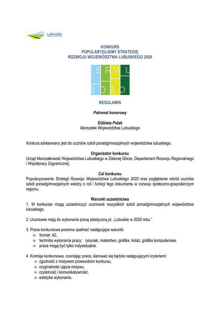 KONKURS POPULARYZUJEMY STRATEGIĘ ROZWOJU WOJEWÓDZTWA LUBUSKIEGO 2020 REGULAMIN Patronat honorowy Elżbieta Polak Marszałek Województwa Lubuskiego Konkurs adresowany jest do uczniów szkół ponadgimnazjalnych województwa lubuskiego. Organizator konkursu Urząd Marszałkowski Województwa Lubuskiego w Zielonej Górze, Departament Rozwoju Regionalnego i Współpracy Zagranicznej. Cel konkursu Popularyzowanie Strategii Rozwoju Województwa Lubuskiego 2020 oraz pogłębienie wśród uczniów szkół ponadgimnazjalnych wiedzy o roli i funkcji tego dokumentu w rozwoju społeczno-gospodarczym regionu. Warunki uczestnictwa 1. W konkursie mogą uczestniczyć uczniowie wszystkich szkół ponadgimnazjalnych województwa lubuskiego. 2. Uczniowie mają do wykonania pracę plastyczną pt. „Lubuskie w 2020 roku.” 3. Praca konkursowa powinna spełniać następujące warunki: • format: A2, • technika wykonania pracy: rysunek, malarstwo, grafika, kolaż, grafika komputerowa, • prace mogą być tylko indywidualne. 4. Komisja konkursowa, oceniając prace, kierować się będzie następującymi kryteriami: • zgodność z motywem przewodnim konkursu, • oryginalność ujęcia motywu, • czytelność i komunikatywność, • estetyka wykonania. 5. Autor pracy konkursowej wyrazi zgodę na przeniesienie na organizatora konkursu (Urząd Marszałkowski Województwa Lubuskiego w Zielonej Górze) całości praw autorskich, obejmujących prawo jego eksploatacji na następujących polach: utrwalanie, zwielokrotnianie określoną techniką, wprowadzenie do obrotu, wprowadzenie do pamięci komputera, publiczne wystawianie, wyświetlanie. Organizator będzie uprawniony również nieodpłatnie przekazać dzieło podmiotom trzecim. 6. Osoby nadsyłające prace konkursowe wyrażają zgodę na przetwarzanie przez organizatora Konkursu swoich danych osobowych (Ustawa o ochronie danych osobowych z dnia 29 sierpnia 1997 roku, Dz. U. Nr 133, poz. 833, z późn. zm.). 7.Organizator nie ponosi odpowiedzialności za uszkodzenia nadesłanych prac powstałe w wyniku transportu pocztowego. Harmonogram przebiegu konkursu 1. Zgłoszenie szkoły do udziału w konkursie - do 8 listopada 2013 r. Zgłoszenie w wersji elektronicznej poprzez formularz zgłoszeniowy dostępny na stronie internetowej www.lubuskie.pl w zakładce „Konkurs - popularyzujemy Strategię Rozwoju Województwa Lubuskiego 2020” lub w wersji papierowej na adres: Urząd Marszałkowski Województwa Lubuskiego, Departament Rozwoju Regionalnego i Współpracy Zagranicznej, ul. Podgórna 7 , 65 - 057 Zielona Góra, z dopiskiem: „Konkurs - popularyzujemy Strategię Rozwoju Województwa Lubuskiego 2020”. 2. Eliminacje szkolne - do 20 listopada 2013 r. Eliminacje szkolne przeprowadza szkolna komisja konkursowa powołana przez dyrektora placówki. W konkursie daną szkołę reprezentuje tylko jedna praca. 3. Zgłoszenie wyników eliminacji szkolnych - do 30 listopada 2013 r. Zwycięską pracę, wraz z protokołem z eliminacji szkolnych i wypełnioną przez ucznia „kartą oceny- eliminacje wojewódzkie” według załączników nr 3 i nr 4 zamieszczonych na stronie Urzędu Marszałkowskiego www.lubuskie.pl w zakładce „Konkurs - popularyzujemy Strategię Rozwoju Województwa Lubuskiego 2020” należy przesłać na adres: Urząd Marszałkowski Województwa Lubuskiego, Departament Rozwoju Regionalnego i Współpracy Zagranicznej, ul. podgórna 7 , 65 - 057 Zielona Góra, z dopiskiem: „Konkurs - popularyzujemy Strategię Rozwoju Województwa Lubuskiego 2020”. 4.Ogłoszenie wyników konkursu poziomu wojewódzkiego - 17 grudnia 2013 r. W dniu 17 grudnia o godz. 11.00 w Sali Kolumnowej Urzędu Marszałkowskiego przy ul. Podgórnej 7 w Zielonej Górze, Marszałek Województwa Lubuskiego wręczy nagrody zwycięskim uczniom, ich opiekunom i szkołom biorącym udział w konkursie. Nagrody Nagrody indywidualne dla autora nagrodzonej pracy: za zajęcie I miejsca w konkursie - TABLET iPad 4 za zajęcie II miejsca w konkursie - LAPTOP Lenovo za zajęcie III miejsca w konkursie - TABLET Samsung Galaxy Nagrody dla szkół: za zajęcie I miejsca w konkursie - Tablica interaktywna 88” za zajęcie II miejsca w konkursie - aparat fotograficzny za zajęcie III miejsca w konkursie - 10 x PENDRIVE Nagrody dla opiekunów szkolnych: za zajęcie I miejsca w konkursie - PENDRIVE 32 GB za zajęcie II miejsca w konkursie - PENDRIVE 16 GB za zajęcie III miejsca w konkursie - PENDRIVE 16 GB 1. 2. 3. 4. Źródła informacji: Strategia Rozwoju Województwa Lubuskiego 2020, Podręczniki wiedzy o społeczeństwie w szkole ponadgimnazjalnej na poziomie rozszerzonym, Ustawa o samorządzie województwa, Strona internetowa www.lubuskie.pl. Szczegółowych informacji na temat konkursu udziela: Alicja Łukaszewska, Urząd Marszałkowski Województwa Lubuskiego, Departament Rozwoju Regionalnego i Współpracy Zagranicznej, ul. Podgórna 7, 65 - 057 Zielona Góra, tel. 68 456 52 55, [email protected].