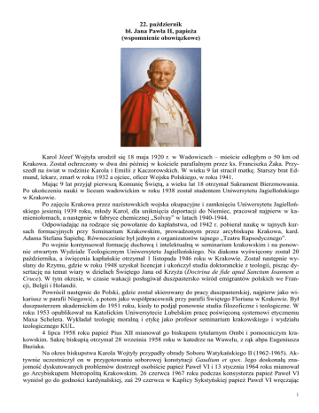 22. październik bł. Jana Pawła II, papieŜa (wspomnienie obowiązkowe) Karol Józef Wojtyła urodził się 18 maja 1920 r. w Wadowicach – mieście odległym o 50 km od Krakowa. Został ochrzczony w dwa dni później w kościele parafialnym przez ks. Franciszka śaka. Przyszedł na świat w rodzinie Karola i Emilii z Kaczorowskich. W wieku 9 lat stracił matkę. Starszy brat Edmund, lekarz, zmarł w roku 1932 a ojciec, oficer Wojska Polskiego, w roku 1941. Mając 9 lat przyjął pierwszą Komunię Świętą, a wieku lat 18 otrzymał Sakrament Bierzmowania. Po ukończeniu nauki w liceum wadowickim w roku 1938 został studentem Uniwersytetu Jagiellońskiego w Krakowie. Po zajęciu Krakowa przez nazistowskich wojska okupacyjne i zamknięciu Uniwersytetu Jagiellońskiego jesienią 1939 roku, młody Karol, dla uniknięcia deportacji do Niemiec, pracował najpierw w kamieniołomach, a następnie w fabryce chemicznej „Solvay” w latach 1940-1944. Odpowiadając na rodzące się powołanie do kapłaństwa, od 1942 r. pobierał naukę w tajnych kursach formacyjnych przy Seminarium Krakowskim, prowadzonym przez arcybiskupa Krakowa, kard. Adama Stefana Sapiehę. Równocześnie był jednym z organizatorów tajnego „Teatru Rapsodycznego”. Po wojnie kontynuował formację duchową i intelektualną w seminarium krakowskim i na ponownie otwartym Wydziale Teologicznym Uniwersytetu Jagiellońskiego. Na diakona wyświęcony został 20 października, a święcenia kapłańskie otrzymał 1 listopada 1946 roku w Krakowie. Został następnie wysłany do Rzymu, gdzie w roku 1948 uzyskał licencjat i ukończył studia doktoranckie z teologii, pisząc dysertację na temat wiary w dziełach Świętego Jana od KrzyŜa (Doctrina de fide apud Sanctum Ioannem a Cruce). W tym okresie, w czasie wakacji posługiwał duszpastersko wśród emigrantów polskich we Francji, Belgii i Holandii. Powrócił następnie do Polski, gdzie został skierowany do pracy duszpasterskiej, najpierw jako wikariusz w parafii Niegowić, a potem jako współpracownik przy parafii Świętego Floriana w Krakowie. Był duszpasterzem akademickim do 1951 roku, kiedy to podjął ponownie studia filozoficzne i teologiczne. W roku 1953 opublikował na Katolickim Uniwersytecie Lubelskim pracę poświęconą systemowi etycznemu Maxa Schelera. Wykładał teologię moralną i etykę jako profesor seminarium krakowskiego i wydziału teologicznego KUL. 4 lipca 1958 roku papieŜ Pius XII mianował go biskupem tytularnym Ombi i pomocniczym krakowskim. Sakrę biskupią otrzymał 28 września 1958 roku w katedrze na Wawelu, z rąk abpa Eugeniusza Baziaka. Na okres biskupstwa Karola Wojtyły przypadły obrady Soboru Watykańskiego II (1962-1965). Aktywnie uczestniczył on w przygotowaniu soborowej konstytucji Gaudium et spes. Jego doskonałą znajomość dyskutowanych problemów dostrzegł osobiście papieŜ Paweł VI i 13 stycznia 1964 roku mianował go Arcybiskupem Metropolitą Krakowskim. 26 czerwca 1967 roku podczas konsystorza papieŜ Paweł VI wyniósł go do godności kardynalskiej, zaś 29 czerwca w Kaplicy Sykstyńskiej papieŜ Paweł VI wręczając 1 mu czerwony biret kreował go na kardynała. W okresie poprzedzającym wybór na Stolicę Piotrową, kardynał Wojtyła uczestniczył w 5 zgromadzeniach plenarnych Synodu Biskupów. Na zwołanym po śmierci Jana Pawła I drugim konklawe w roku 1978 (czyli w wieku 58 lat) abp kard. Wojtyła został wybrany przez Kolegium Kardynałów na papieŜa i przybrał imię Jana Pawła II. Wynik wyboru ogłoszono 16 października o godzinie 16:16. W niedzielę 22 października podczas Mszy Świętej na Placu Świętego Piotra odbyła się uroczysta liturgiczna inauguracja jego pontyfikatu (dokładnie 35 lat temu). Jan Paweł II był pierwszym papieŜem z Polski, jak równieŜ pierwszym po 455 latach biskupem Rzymu, nie będącym Włochem. Wielokrotnie przywoływał spełnione proroctwo Juliusza Słowackiego z wiersza „Słowiański papieŜ”. 264. następca św. Piotra był równieŜ poetą i poliglotą, a takŜe aktorem, dramaturgiem, pedagogiem i filozofem. Jako gorliwy pasterz otaczał szczególną troską, przede wszystkim: rodziny, młodzieŜ i ludzi chorych. Pontyfikat Jana Pawła II był jednym z najdłuŜszych w dziejach Kościoła. Od 14 marca 2004 roku pontyfikat Jana Pawła II uznawany jest za najdłuŜszy, po pontyfikacie św. Piotra oraz bł. Piusa IX. W tym czasie doszło do wielu róŜnorodnych, doniosłych przemian. NaleŜy wspomnieć o upadku reŜimów, do czego On sam się przyczynił. Aby głosić Ewangelię odbył 104 podróŜe apostolskie, które są przejawem jego pasterskiej troski o Kościół Powszechny. Poza tym dokonał 146 wizyt duszpasterskich we Włoszech, a jako biskup Rzymu odwiedził 317 z 332 parafii rzymskich. Jan Paweł II pełnił niestrudzenie posługę Piotrową w duchu misyjnym, oddając wszystkie swe siły, powodowany troską o wszystkie kościoły – sollicitudo omnium ecclesiarum – i miłością obejmującą całą ludzkość. Częściej niŜ którykolwiek z Jego poprzedników spotykał się z Ludem BoŜym i przywódcami państw – podczas uroczystości, audiencji ogólnych i prywatnych oraz wizyt duszpasterskich. śaden z jego poprzedników nie spotkał się z tak wielką ilością wiernych: w audiencjach generalnych, których odbyło się 1160, uczestniczyło łącznie 17.600.000 pielgrzymów, nie licząc tych, którzy wzięli udział w audiencjach specjalnych i w zgromadzeniach liturgicznych oraz w spotkaniach w ramach pielgrzymek apostolskich. W czasie trwania Wielkiego Jubileuszu roku 2000 papieŜ spotkał się z przeszło 8 milionami wiernych. Osobnym rozdziałem były spotkania z przedstawicielami świata polityki: odbyło się 38 wizyt oficjalnych i 738 audiencji udzielonych głowom państw, oraz 246 audiencji udzielonych szefom rządów. Spośród licznych dokumentów opublikowanych za jego pontyfikatu naleŜy podkreślić 14 encyklik, 15 adhortacji a