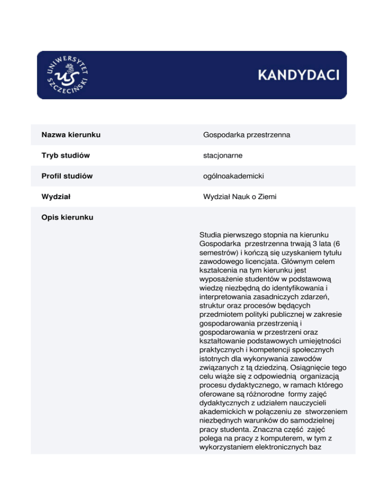 Nazwa kierunku Gospodarka przestrzenna Tryb studiów stacjonarne Profil studiów ogólnoakademicki Wydział Wydział Nauk o Ziemi Opis kierunku Studia pierwszego stopnia na kierunku Gospodarka przestrzenna trwają 3 lata (6 semestrów) i kończą się uzyskaniem tytułu zawodowego licencjata. Głównym celem kształcenia na tym kierunku jest wyposażenie studentów w podstawową wiedzę niezbędną do identyfikowania i interpretowania zasadniczych zdarzeń, struktur oraz procesów będących przedmiotem polityki publicznej w zakresie gospodarowania przestrzenią i gospodarowania w przestrzeni oraz kształtowanie podstawowych umiejętności praktycznych i kompetencji społecznych istotnych dla wykonywania zawodów związanych z tą dziedziną. Osiągnięcie tego celu wiąże się z odpowiednią organizacją procesu dydaktycznego, w ramach którego oferowane są różnorodne formy zajęć dydaktycznych z udziałem nauczycieli akademickich w połączeniu ze stworzeniem niezbędnych warunków do samodzielnej pracy studenta. Znaczna część zajęć polega na pracy z komputerem, w tym z wykorzystaniem elektronicznych baz danych, systemów komputerowego wspomagania projektowania CAD i systemów informacji geograficznej GIS. Wykłady i ćwiczenia w salach uzupełniane są przez zajęcia terenowe, w tym za granicą. Więcej informacji tutaj Specjalności Kryteria kwalifikacji Podstawą przy postępowaniu rekrutacyjnym są wyniki egzaminu maturalnego. Przy rekrutacji na studia pierwszego stopnia należy wybrać po jednym przedmiocie z każdej grupy. Grupa I (jeden przedmiot do wyboru): język polski, geografia, Grupa II (jeden przedmiot do wyboru): matematyka, geografia, wiedza o społeczeństwie, informatyka, Grupa III (jeden przedmiot do wyboru): język obcy nowożytny , fizyka i astronomia/fizyka, Jeżeli kandydat nie zdawał danego przedmiotu na egzaminie maturalnym to uzyskuje zero punktów za ten przedmiot. Brak przedmiotu nie dyskwalifikuje go jednak w postępowaniu rekrutacyjnym. Wyniki z wybranych przedmiotów podstawione do algorytmu dają wynik końcowy kandydata. Przykładowe przedmioty Metody analizy przestrzennej Prawne podstawy gospodarki przestrzennej i ochrony środowiska Geograficzne systemy informacyjne Planowanie strategiczne obszarów Lokalizacja działalności gospodarczej Zastosowanie GIS w gospodarce przestrzennej Możliwości zatrudnienia urzędy administracji rządowej i samorządowej np. wydziały planowania przestrzennego lub ochrony środowiska, firmy konsultingowe, przedsiębiorstwa użyteczności publicznej, agencje oraz fundacje rozwoju regionalnego i lokalnego, instytucje zajmujące się pozyskiwaniem funduszy unijnych na projekty regionalne i lokalne, agencje nieruchomości, firmy doradcze i konsultingowe oraz inne podmioty otoczenia biznesu, biura planistyczne i projektowe Kontynuacja nauki studia II stopnia Terminy Terminy postępowania rekrutacyjnego na studia stacjonarne i niestacjonarne na rok akademicki 2017/2018 w przygotowaniu. Dokumenty Kandydaci zakwalifikowani do II etapu postępowania rekrutacyjnego na wszystkie kierunki i specjalności studiów w Uniwersytecie Szczecińskim mają obowiązek złożenia kompletu dokumentów. Wykaz dokumentów w przygotowaniu. Olimpiady dla tego kierunku Wykaz olimpiad stopnia centralnego, konkursów międzynarodowych oraz ogólnopolskich, w tym organizowanych przez Uniwersytet Szczeciński, których laureaci lub finaliści mogą korzystać z preferencji w procesie rekrutacji na I rok studiów pierwszego stopnia i jednolitych studiów magisterskich w Uniwersytecie Szczecińskim w latach 2015 - 2017. Opłaty Opłata rekrutacyjna na rok akademicki 2016/2017 wynosiła 85 zł. Dodatkowe informacje Kontakt Masz pytania? [email protected] Biuro ds. Rekrutacji tel.: +48 91 444 10 29, +48 91 444 10 31, +48 91 444 11 60 Powered by TCPDF (www.tcpdf.org)