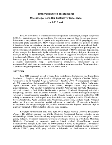 Sprawozdanie z działalności Miejskiego Ośrodka Kultury w Sulejowie za 2010 rok Rok 2010 obfitował w wiele różnorodnych wydarzeń kulturalnych, których sulejowski MOK był organizatorem lub uczestnikiem. Optymizmem napawa fakt, że zarówno imprezy kulturalno – rozrywkowe jak i zajęcia stałe organizowane przez MOK przyciągają coraz liczniejsze grupy uczestników. MOK wciąż rozszerza swoją działalność, podnosi komfort i bezpieczeństwo na zajęciach, starając się sprostać oczekiwaniom jak największej liczby odbiorców swoich usług. Rok 2010 to wydarzenia kulturalne, rozrywkowe, patriotyczne; to również kolejny rok przeprowadzania prac konserwacyjnych w MOKu oraz jego doposażenie. Celem naszym jest krzewienie życia kulturalnego na terenie Gminy Sulejów. Staramy się rozwijać talenty u najmłodszych, oferując im udział w zajęciach wokalnych, tanecznych i plastycznych. Dbamy o to, by dzieci mogły z nami spędzać swój czas wolny, organizując im konkursy, gry i zabawy. Nasz kalendarz wydarzeń kulturalnych wiąże się w dużej mierze z datami tradycyjnych świąt i patriotycznych uroczystości. Przyłączamy się do ogólnopolskich akcji oraz uczestniczymy w przeglądach poza naszą gminą. Współpracujemy z jednostkami gminnymi OSP, MZK, MOPS, MBP, BOJO. STYCZEŃ Rok 2010 rozpoczął się od wyjazdu koła wokalnego, działającego pod kierunkiem Mariusza. J. Magiery, od października ubiegłego roku przy Miejskim Ośrodku Kultury w Sulejowie, na IX Przegląd Kolęd i Pastorałek - Szydłów 2010. W przeglądzie wystąpiło ok. 200 uczestników. Sulejowski MOK reprezentowały: Klaudia Leszto, Sylwia Godlewska, Agata Ciotucha, Julia Wójtowicz, Ania Moruś, Martyna Kłych. Jury w składzie: przewodniczący - Pan Czesław Michałowicz dyrektor Państwowego Instytutu Muzycznego w Łodzi; członek - Pani Halina Dulikowska - profesor Akademii Muzycznej w Łodzi muzykolog; członek - Pani dr Aldona Plucińska - st. Kustosz Muzeum Etnologii i Etnografii w Łodzi w poczet laureatów przeglądu wpisało Klaudię Leszto w kategorii soliści klas I-III szkoły podstawowe oraz w kategorii zespoły wokalne nasz zespół w składzie: Klaudia Leszto, Sylwia Godlewska, Agata Ciotucha, Julia Wójtowicz, Ania Moruś, Martyna Kłych. Przegląd odbył się 8 stycznia, natomiast wyniki ogłoszono w niedzielę, 17 stycznia w kościele w Szydłowie. Na uwagę zasługuje fakt, że koło wokalne istniało dopiero 3 miesiące i był to pierwszy przegląd, w którym brało i odniosło takie sukcesy. Kolejnym wydarzeniem 2010 roku była XVIII edycja Wielkiej Orkiestry Świątecznej Pomocy. Do zbiórki pieniędzy na Wielką Orkiestrę Świątecznej Pomocy zgłosiło się do sulejowskiego MOKu 20 wolontariuszy z 4 placówek szkolnych i wychowawczych z terenu gminy Sulejów. W mroźny niedzielny poranek kwestujący zebrali się w budynku Miejskiej Biblioteki Publicznej na odprawie, podczas której odebrali identyfikatory, puszki i serduszkowce naklejki. Kilka minut po 8.00 wyruszyli w teren, by do godziny 13.00 zbierać pieniądze dla dzieci z chorobami nowotworowymi. Kwestujących spotkać można było przy sklepie TESCO, przy MBP, przy kościele w Sulejowie, na Podklasztorzu, w Witowie 1 i Włodzimierzowie. Mieszkańcy naszej gminy okazali się bardzo szczodrzy i każdy z naszych wolontariuszy uzbierał prawie pełną puszkę, pieniędzy. Rekordzistą okazał się Mateusz Gwarda ze Szkoły Podstawowej Nr 2 w Sulejowie, który uzbierał 617,61zł. W nagrodę otrzymał zaproszenie na pizzę, którą ufundowała PIZZERIA FIORE z Sulejowa. Szkoła Podstawowa Nr 2 uzbierała łącznie 1.489,42zł. Delegacja z Sulejowa w składzie: Mateusz Gwarda, Piotr Stobiecki, Mateusz Nowak, Natalia Calińska, Jarek Majchrzak oraz nauczyciele Maria Staniewska, Wiesława Wudarczyk. Kolejna placówka- Świetlica Wsparcia Dziennego, którą reprezentowały: Klaudia Włuka, Agata Kałuzińska, Natalia Firkowska, Angelika Firkowska oraz opiekun Lidia Kowalska, uzbierała 1.382,37zł. Gimnazjum w Przygłowie: Ewelina Krawczyk, Beata Bogobowicz, Sylwia Kozub, Urszula Tręda, Katarzyna Wojtala opiekun Renata Rudzka kwota - 914 zł. Szkoła Podstawowa w Łęcznie w składzie: Anna Kołek- opiekun oraz wychowankowie Bartłomiej Kmita, Paulina Kołek, Aleksandra Kołek, Sara Kołek, Adrian Kłych uzbierali 1.038,27zł. Kwesta na WOŚP w Sulejowie zasiliła konto Fundacji Jurka Owsiaka na łączną kwotę 4824,06zł . Mimo wiatru i mrozu zebrano o 800zł więcej niż w roku ubiegłym. Za zgodą Burmistrza Sulejowa Stanisława Baryły, w Gminnym Centrum Informacji, kwestujący otrzymali słodki poczęstunek i ciepłą herbatę przygotowane przez p. Bernadetę Banaszczyk. 11 stycznia na sali w MOKu odbyła się sesja RM W styczniu zawiązały się nowe grupy zainteresowań w MOKu. Kiedy w grudniu 2009 r. ogłoszono nabór do Chóru Cysterskiego przyszedł do MOKu jeden chętny do śpiewania. Można by rzec, że pomysł nie spodobał się miłośnikom śpiewu, ale… Pan przyszedł w imieniu istniejącego już chóru, który działa od 3 lat przy kościele parafialnym pw. Św. Floriana w Sulejowie. Idąc dalej tym śladem skontaktowano się z Panem organistą i jednocześnie instruktorem śpiewu w chórze – Pawłem Banasikiem i oto 12 stycznia 2010 roku spotkano się z chórem w Miejskim Ośrodku Kultury w Sulejowie. Ponad 20 osobowy zespół zgodził się działać pod nazwą CHÓR CYSTERSKI CANTATE DEO. Próby odbywały się w każdy poniedziałek w MOKu pod kierunkiem Mariusza J. Magiery oraz Pawła Banasika. Po kilku miesiącach poszukiwań, w styczniu kadra pracownicza MOKu powiększyła się o instruktora tańca nowoczesnego – p. Dagmarę Skrzynecką. W połowie miesiąca przeprowadzono nabór na te zajęcia i utworzono dwie grupy taneczne pn. ABSTRAKT I i ABSTRAKT II. 17 stycznia 2010 r. to dzień wyjątkowy dla naszego miasta. Obchodzono wtedy 65 rocznicę wyzwolenia Sulejowa. W związku z obchodami tej ro