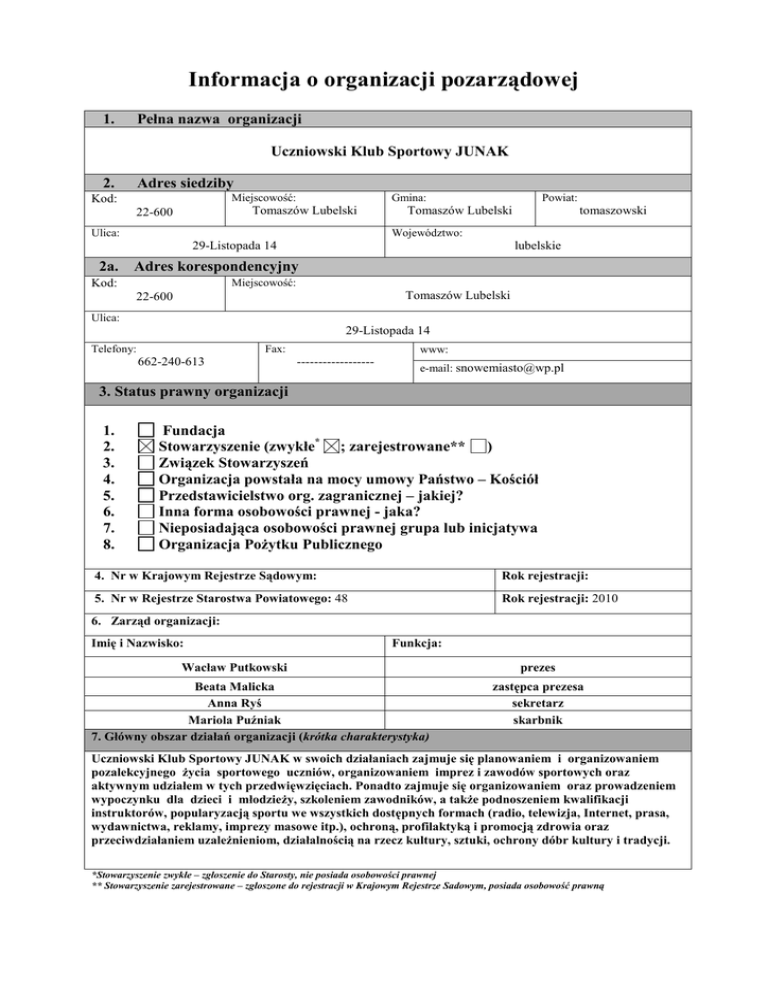 Informacja o organizacji pozarządowej 1. Pełna nazwa organizacji Uczniowski Klub Sportowy JUNAK 2. Adres siedziby Miejscowość: Kod: Gmina: Tomaszów Lubelski 22-600 Ulica: Powiat: Tomaszów Lubelski Województwo: 29-Listopada 14 2a. tomaszowski lubelskie Adres korespondencyjny Miejscowość: Kod: Tomaszów Lubelski 22-600 Ulica: 29-Listopada 14 Telefony: Fax: 662-240-613 www: ------------------ e-mail: [email protected] 3. Status prawny organizacji 1. 2. 3. 4. 5. 6. 7. 8. Fundacja Stowarzyszenie (zwykłe* ; zarejestrowane** ) Związek Stowarzyszeń Organizacja powstała na mocy umowy Państwo – Kościół Przedstawicielstwo org. zagranicznej – jakiej? Inna forma osobowości prawnej - jaka? Nieposiadająca osobowości prawnej grupa lub inicjatywa Organizacja Pożytku Publicznego 4. Nr w Krajowym Rejestrze Sądowym: Rok rejestracji: 5. Nr w Rejestrze Starostwa Powiatowego: 48 Rok rejestracji: 2010 6. Zarząd organizacji: Imię i Nazwisko: Funkcja: Wacław Putkowski Beata Malicka Anna Ryś Mariola Puźniak 7. Główny obszar działań organizacji (krótka charakterystyka) prezes zastępca prezesa sekretarz skarbnik Uczniowski Klub Sportowy JUNAK w swoich działaniach zajmuje się planowaniem i organizowaniem pozalekcyjnego życia sportowego uczniów, organizowaniem imprez i zawodów sportowych oraz aktywnym udziałem w tych przedwięwzięciach. Ponadto zajmuje się organizowaniem oraz prowadzeniem wypoczynku dla dzieci i młodzieży, szkoleniem zawodników, a także podnoszeniem kwalifikacji instruktorów, popularyzacją sportu we wszystkich dostępnych formach (radio, telewizja, Internet, prasa, wydawnictwa, reklamy, imprezy masowe itp.), ochroną, profilaktyką i promocją zdrowia oraz przeciwdziałaniem uzależnieniom, działalnością na rzecz kultury, sztuki, ochrony dóbr kultury i tradycji. *Stowarzyszenie zwykłe – zgłoszenie do Starosty, nie posiada osobowości prawnej ** Stowarzyszenie zarejestrowane – zgłoszone do rejestracji w Krajowym Rejestrze Sadowym, posiada osobowość prawną