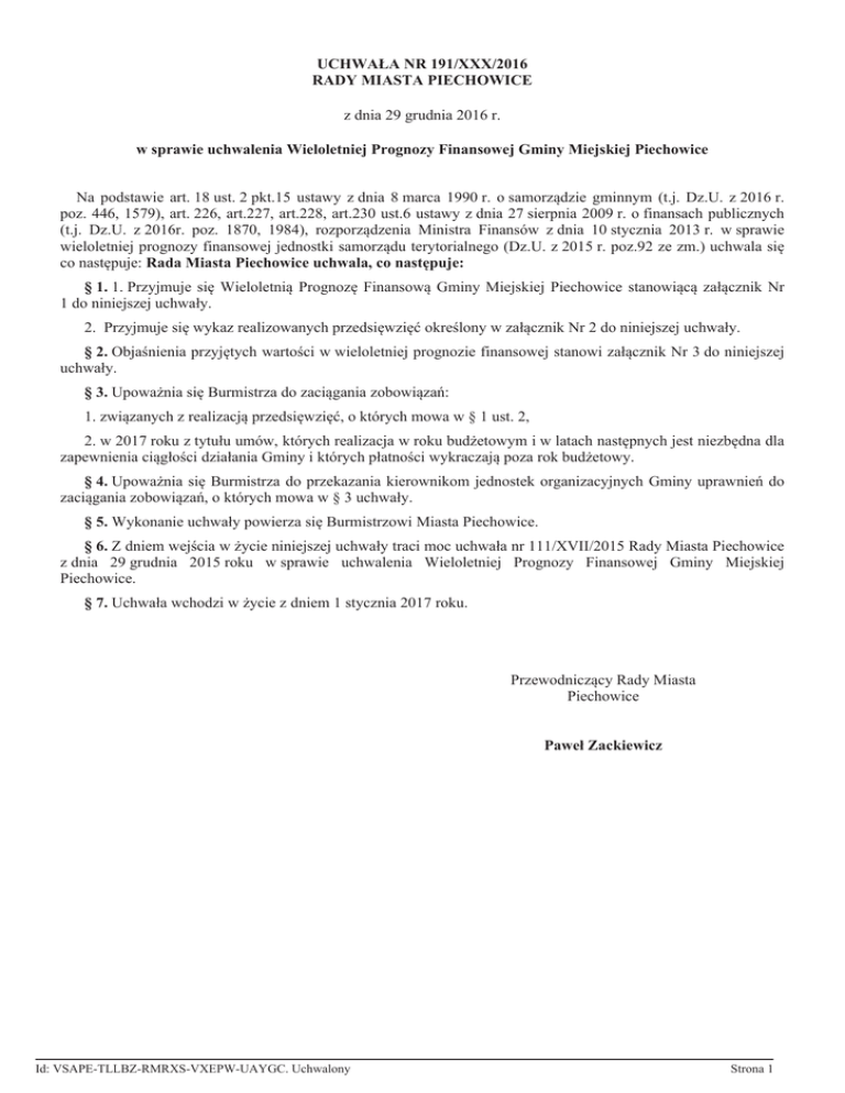 wieloletniej prognozy finansowej jednostki samorządu terytorialnego (Dz.U. z 2015 r. poz.92 ze zm.) uchwala się