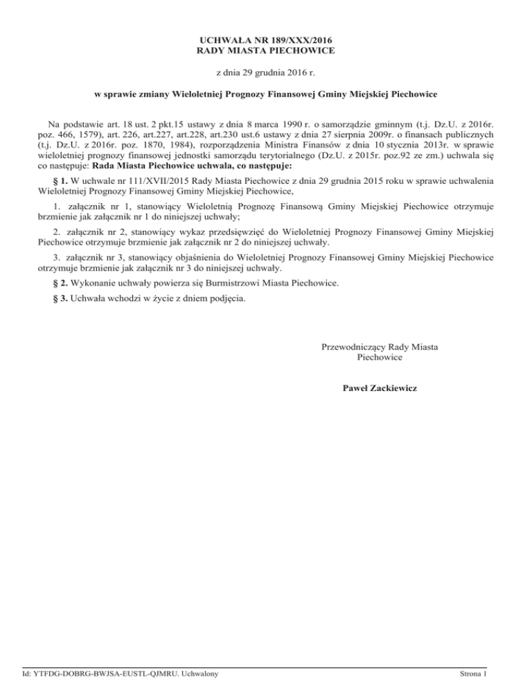 UCHWAŁA NR 189/XXX/2016 RADY MIASTA PIECHOWICE z dnia 29 grudnia 2016 r. w sprawie zmiany Wieloletniej Prognozy Finansowej Gminy Miejskiej Piechowice Na podstawie art. 18 ust. 2 pkt.15 ustawy z dnia 8 marca 1990 r. o samorządzie gminnym (t.j. Dz.U. z 2016r. poz. 466, 1579), art. 226, art.227, art.228, art.230 ust.6 ustawy z dnia 27 sierpnia 2009r. o finansach publicznych (t.j. Dz.U. z 2016r. poz. 1870, 1984), rozporządzenia Ministra Finansów z dnia 10 stycznia 2013r. w sprawie wieloletniej prognozy finansowej jednostki samorządu terytorialnego (Dz.U. z 2015r. poz.92 ze zm.) uchwala się co następuje: Rada Miasta Piechowice uchwala, co następuje: § 1. W uchwale nr 111/XVII/2015 Rady Miasta Piechowice z dnia 29 grudnia 2015 roku w sprawie uchwalenia Wieloletniej Prognozy Finansowej Gminy Miejskiej Piechowice, 1. załącznik nr 1, stanowiący Wieloletnią Prognozę Finansową Gminy Miejskiej Piechowice otrzymuje brzmienie jak załącznik nr 1 do niniejszej uchwały; 2. załącznik nr 2, stanowiący wykaz przedsięwzięć do Wieloletniej Prognozy Finansowej Gminy Miejskiej Piechowice otrzymuje brzmienie jak załącznik nr 2 do niniejszej uchwały. 3. załącznik nr 3, stanowiący objaśnienia do Wieloletniej Prognozy Finansowej Gminy Miejskiej Piechowice otrzymuje brzmienie jak załącznik nr 3 do niniejszej uchwały. § 2. Wykonanie uchwały powierza się Burmistrzowi Miasta Piechowice. § 3. Uchwała wchodzi w życie z dniem podjęcia. Przewodniczący Rady Miasta Piechowice Paweł Zackiewicz Id: YTFDG-DOBRG-BWJSA-EUSTL-QJMRU. Uchwalony Strona 1 Uzasadnienie Zmiany Wieloletniej Prognozy Finansowej Gminy Miejskiej Piechowice wprowadzone niniejszą uchwałą: 1. Dostosowano załącznik nr 1 niniejszej uchwały do wielkości budżetu na rok 2016 po zmianach dokonanych na podstawie podjętych Uchwał Rady Miasta Piechowice i wydanych Zarządzeń Burmistrza Piechowice w okresie od 29 września 2016r. do 29 grudnia 2016r. 2. Dostosowano wysokość poszczególnych przedsięwzięć w załączniku nr 2 niniejszej uchwały do wielkości wynikających z budżetu na rok 2016 po zmianach, na realizację przedsięwzięć w 2016r. 3. Zmniejszono o kwotę 11.000 zł wydatki na obsługę długu w 2016r. Id: YTFDG-DOBRG-BWJSA-EUSTL-QJMRU. Uchwalony Strona 1 2 2 ! " " &' % " " 3 ( # $') " (4 " (*+,---,./(0 !" # $%$ # " .+ % $# " ./(0 1 $ $ $ $ . . . "- . , ' ! ( 6 ! !% ! !" ! !"! ! !# ! !& !% !%! !%!% "22 %43// " %/ " 0 %#% 12/3%& 1 "0 1"%3"1 " 4 0 "/ 3// // ///3// 1 01" &#&3// 4 1%" 24%3// % /02 /003// " #%0 42%3&4 2& /#1322 #11 /#31 %/ # 0 0 & &#/3 4 0 #/4 &4#30 " 10% 42/3// 5" 023%/ 2 1/" 2%230/ 4 1/4 4"#3#/ % 1" 1/&3// # / " 4&43"% &/2 01&3%& %0/ 1""3 ! %/ & %/ &2 4#23"" 2 414 0#23"" # /"/ #&03// #/ ///3// 2 #2" 2023// 4 &&/ ///3// % ""# /&3// % 120 #423"" 0/# 1//3// &// ///3// "0# 1//3// %/ & 22 &#/3// % /#/ #"23 " 0 #%/ 2"&3"1 # /4& #%&3// 2 #%"322 2 1#4 2"23"1 4 100 &4&31" % ""# /&3// " /%2 %123"2 4 0 4/%314 44 0/#3&2 ##4 " %3%# %/ 4 %" #"" #1"342 %% %%" %/%324 # 10 0/&3// %/ &//3// 0 % 1403// 4 22/ 0&/3// % %" #0 3// & 4 % &//3%4 % / %1/32% &// ///3// 1// %1/32% %/ 1 0 ""& #%#3// 2 41& #%#3// # 4" 1# 3// %/ ///3// 2 41" & 23// 4 #1& ///3// % " / "4 3// % &// /423// 44/ ///3// 4&/ ///3// /3// %/ 2 0 %&/ /1#3// 2 4#/ /1#3// # 4" 1# 3// %/ ///3// 2 41" & 23// 4 #1& ///3// % " / "4 3// % &// /423// 4 / ///3// 4// ///3// /3// %/ 0 0 %&/ /1#3// 2 4#/ /1#3// # 4" 1# 3// %/ ///3// 2 41" & 23// 4 #1& ///3// % " / "4 3// % &// /423// 4 / ///3// 4// ///3// /3// %/%/ 0 %&/ /1#3// 2 4#/ /1#3// # 4" 1# 3// %/ ///3// 2 41" & 23// 4 #1& ///3// % " / "4 3// % &// /423// 4 / ///3// 4// ///3// /3// %- 8 7 ! %%1 %1 ! "- ! ! ) ! *+) !%* %//0 ! 3 , 3 9 , > Id: YTFDG-DOBRG-BWJSA-EUSTL-QJMRU. Uchwalony ! :! %/ " ! ! 22& ;! !- > ! < =3 9# 3 , - 3 ! %%1 ! ! Strona 1 $ $ $ $ $ > > ? . . > ? ?3 > . . 3 ?3 ! %#" . 3 ! %#" . ! ?3 0/ ? ! %#" 3 , ? . ! %#" > ? , #- 3 > 9 . ? - . ' % ( 6 %! ! %! ! ! %! !% %! !" %! !"! %! !"! ! %! !"! !% %!% )%! * + )%!%* " %/ " 1 4% /00300 4 "14 #1#31& /3// /3// /3// "10 2%2340 "10 2%2340 /3// /3// %/ # 2 #1/ #"&3#4 1 0 0 1 /34# /3// /3// /3// %#4 4023// %#4 4023// /3// /3// &&/ 1%#32% ! %/ & %/ 42 4#23"" 2 /24 4&03&1 /3// /3// /3// 1" #443// 1" ##43// /3// /3// % &0# 022314 %## 4%&3%# 0 12# 44&3/2 1 &&" 2//3%2 /3// /3// /3// 1" #443// 1" ##43// /3// /3// % %"/ 24#32/ %/ 4 %" /"1 % "3#2 %/ 22 "243#2 /3// /3// /3// "" 2 23// "" 2 23// /3// /3// % && 2%13// %/ 1 2 &41 %4"32" 1 #4 4"32" /3// /3// /3// /" "0%3// /" "0%3// /3// /3// /4 //3// %/ 2 2 4 " &&&3// 1 &" #%#3// /3// /3// /3// 1# +// 1# +// /3// /3// /2% " 3// %/ 0 2 1/1 4// 1 &1/ /1#3// /3// /3// . #0 4013// #0 4013// /3// /3// "1 &2/3// %/%/ 2 &4" 4// 1 &#% &1#3// /3// /3// . %# 2#03// %# 2#03// /3// /3// /% /2/3// %/ & #- %! > %/ "5%/ 2! % Id: YTFDG-DOBRG-BWJSA-EUSTL-QJMRU. Uchwalony Strona 2 $ $ . 6 . ' 6 " &- " # ) * 5)%* )#! * + )#!%* + )#!"* + )#!#* $ 3 B A $ 3 @ 3 . ( $ #! , . #! ! !% 1 4 !% . #!% , . . #!%! #!" , . #!"! > &- . #!# , . #!#! %/ " 4% 42/3%4 %"% &//3// /3// /3// %"% &//3// /3// /3// /3// /3// /3// %/ # ##& /#31/ % 204 ""#3 1 /3// /3// 4# %"13 1 /3// % 1"% /013// /3// /3// /3// ! %/ & 5 // ///3// "21 2# 3%/ /3// /3// "21 2# 3%/ // ///3// /3// /3// /3// /3// %/ & %&& 11"3/& / %%&3#0 /3// /3// / %%&3#0 /3// /3// /3// /3// /3// %/ 4 "04 %4/3%/ %2 ///3// /3// /3// %2 ///3// /3// /3// /3// /3// /3// %/ 1 142 4/3 1 /3// /3// /3// /3// /3// /3// /3// /3// /3// %/ 2 4"4 & 03// 1" 0//3// /3// /3// /3// /3// /3// /3// 1" 0//3// /3// %/ 0 &#% #%/3// ## ///3// /3// /3// /3// /3// /3// /3// ## ///3// /3// %/%/ 424 #%/3// /3// /3// /3// /3// /3// /3// /3// /3// /3// > ! " Id: YTFDG-DOBRG-BWJSA-EUSTL-QJMRU. Uchwalony Strona 3 $ $ $ C @ . ? ?3 . ! %#" ' & ( 6 4- )&! * + )&!%* ? ? ! . %#" &! &! ! )&! ! ! * + )&! ! !%* + )&! ! !"* 1&& 4 %31& /3// !" . &! ! ! ? ! %#" !" ! %#" . &! ! !% 4- . &! ! !" &!% %/ " 1&& 4 %31& /3// /3// /3// /3// %/ # " #%" /#13/& " #%" /#13/& /3// /3// /3// /3// /3// ! %/ & %21 2# 3%/ %21 2# 3%/ /3// /3// /3// 