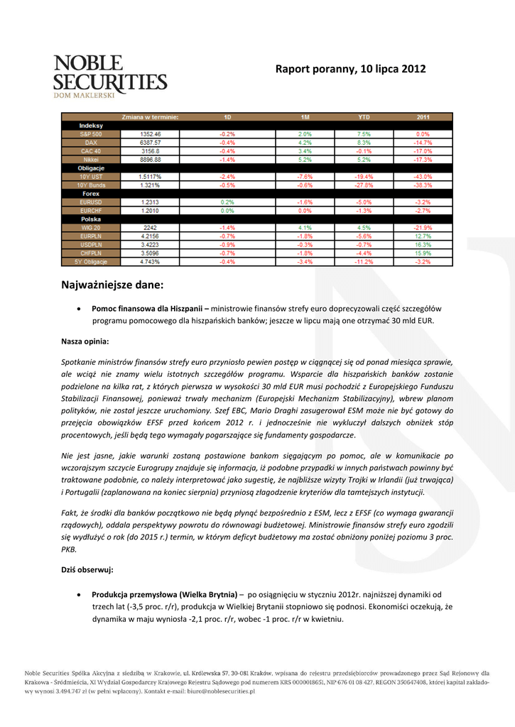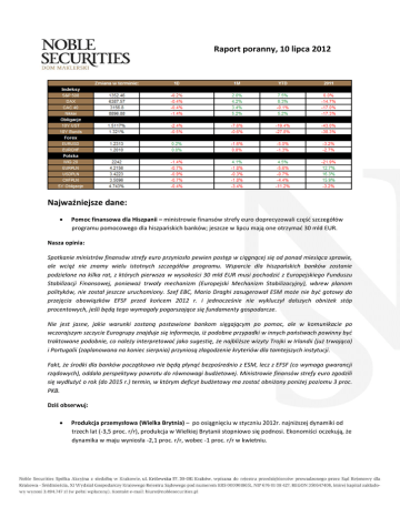 Raport poranny, 10 lipca 2012 Najważniejsze dane: Pomoc finansowa dla Hiszpanii – ministrowie finansów strefy euro doprecyzowali część szczegółów programu pomocowego dla hiszpańskich banków; jeszcze w lipcu mają one otrzymać 30 mld EUR. Nasza opinia: Spotkanie ministrów finansów strefy euro przyniosło pewien postęp w ciągnącej się od ponad miesiąca sprawie, ale wciąż nie znamy wielu istotnych szczegółów programu. Wsparcie dla hiszpańskich banków zostanie podzielone na kilka rat, z których pierwsza w wysokości 30 mld EUR musi pochodzić z Europejskiego Funduszu Stabilizacji Finansowej, ponieważ trwały mechanizm (Europejski Mechanizm Stabilizacyjny), wbrew planom polityków, nie został jeszcze uruchomiony. Szef EBC, Mario Draghi zasugerował ESM może nie być gotowy do przejęcia obowiązków EFSF przed końcem 2012 r. i jednocześnie nie wykluczył dalszych obniżek stóp procentowych, jeśli będą tego wymagały pogarszające się fundamenty gospodarcze. Nie jest jasne, jakie warunki zostaną postawione bankom sięgającym po pomoc, ale w komunikacie po wczorajszym szczycie Eurogrupy znajduje się informacja, iż podobne przypadki w innych państwach powinny być traktowane podobnie, co należy interpretować jako sugestię, że najbliższe wizyty Trojki w Irlandii (już trwająca) i Portugalii (zaplanowana na koniec sierpnia) przyniosą złagodzenie kryteriów dla tamtejszych instytucji. Fakt, że środki dla banków początkowo nie będą płynąć bezpośrednio z ESM, lecz z EFSF (co wymaga gwarancji rządowych), oddala perspektywy powrotu do równowagi budżetowej. Ministrowie finansów strefy euro zgodzili się wydłużyć o rok (do 2015 r.) termin, w którym deficyt budżetowy ma zostać obniżony poniżej poziomu 3 proc. PKB. Dziś obserwuj: Produkcja przemysłowa (Wielka Brytnia) – po osiągnięciu w styczniu 2012r. najniższej dynamiki od trzech lat (-3,5 proc. r/r), produkcja w Wielkiej Brytanii stopniowo się podnosi. Ekonomiści oczekują, że dynamika w maju wyniosła -2,1 proc. r/r, wobec -1 proc. r/r w kwietniu. Analiza techniczna: GPW FW20U12 Od połowy czerwca kurs buduje formację rosnącego klina. Końcem ubiegłego tygodnia miało miejsce nietrwałe wybicie górą. Ostatnia sesja przyniosła zaś kolejną próbę wybicia, tym razem ku dołowi. Obecnie dolne ramię klina przebiega nieopodal otwarcia sesji poniedziałkowej (2 201 pkt), stąd utrzymanie układu wybicia sprowadza się do konieczności obrony ostatniej czarnej świecy. Zakres ruchu po opuszczeniu klina można oszacować na ok. 80 pkt. Midas W krótkim terminie na wykresie pojawił się schemat: wysoka biała świeca + płaska korekta oparta o górne ograniczenie bocznego ruchu sprzed wybicia. Obecnie kurs dotarł w pobliże w ten sposób wyróżniającego się poziomu (0.60), a jednocześnie działanie wspierające powinno zostać wzmocnione przez 3-tygodniową linię trendu wzrostowego. W średnim terminie poprawa sytuacji sygnalizowana jest przez wyjście ponad linię mocnego trendu spadkowego z poprzednich 4 miesięcy. JSW Po trwającym od tygodnia dość dynamicznym wybiciu z formacji trójkąta, na ostatniej sesji kurs uległ gwałtownej przecenie (-4.9%). Aby ta słabość mogła zostać wpisana w ramy klasycznego ruchu powrotnego do okolic wierzchołka trójkąta, ostatnie sesyjne minimum (92.80) musi zostać obronione. Analiza techniczna: Waluty EUR/USD Korekta rozpoczęta na początku tygodnia uległa niewielkiemu rozszerzeniu i zatrzymała się w okolicach zniesienia 41,4% ostatniego impulsu spadkowego niższego rzędu oraz przy początku korpusów świec z dołka z 1 czerwca. Daje to szansę na zakończenie korekty i kontynuację spadków, a najbliższym celem wydaje się być psychologiczny poziom 1,22, a następnie okolice 1,2157-1,2148, przy których kurs odbił się na przestrzeni maja i czerwca 2010 trzykrotnie oraz przy których wypada także równość ostatnich impulsów spadkowych (zielone prostokąty). Warto jednak wziąć pod uwagę, że wskaźnik RSI przebywa od końca zeszłego tygodnia w strefie wyprzedania i w dniu dzisiejszym wygenerował już sygnał kupna, jednak dopóki ostatni przebity dołek z 1 czerwca działa wciąż jako opór, a ostatnie dołki z 5 lipca (1,2362) nie zostały od dołu wybite, wydaje się że większe prawdopodobieństwo może leżeć po stronie kontynuacji spadków. EUR/PLN W dniu wczorajszym kurs odbił się kolejny raz od okolic górnego ograniczenia klina zniżkującego, jednak kontynuacja spadków wydaje się być zagrożona, ponieważ na wykresie i wskaźniku MACD można zauważyć pozytywną dywergencję (niebieska linia), która mogłaby przemawiać za przynajmniej chwilową zmianą trendu. Na chwilę obecną pozostajemy jedna wciąż w obrębie klina i dopiero wybicie górą z formacji oraz przebicie ostatnich szczytów z 6 i 9 czerwca na poziomie 4,2565, byłoby istotnym sygnałem dla kupujących, dającym szansę na większe wzrosty. Najbliższe wsparcie znajduje się natomiast w okolicach 4,1869 oraz przy dolnym ograniczeniu klina. Nie wykluczone, że miejsca te mogłyby być ponownie przetestowane, jednak do tego przydałby się także silniejszy ruch trendowy na eurodolarze. Departament Analiz Rynkowych Noble Securities S.A. Łukasz Wróbel , Główny Analityk [email protected] Tel: +48 600 942 105 Analiza techniczna – GPW: Krzysztof Ojczyk , Starszy Analityk [email protected] Tel: +48 12 422 31 00 w. 113 Analiza techniczna – waluty: Dominik Łebek, Departament Rynków Zagranicznych [email protected] Tel: +48 22 212 54 35 Jeżeli nie życzą sobie Państwo otrzymywać codziennego Przeglądu Rynków Noble Securities S.A., prosimy o odesłanie pustego maila z tematem "Wypisz_mnie". Niniejsze opracowanie jest jedynie materiałem informacyjnym do użytku odbiorcy. Materiał został przygotowany z należytą starannością i rzetelnością, na podstawie ogólnodostępnych informacji, ale ani autor, ani No