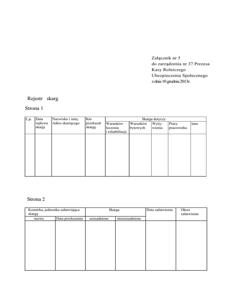 Załącznik nr 5 do zarządzenia nr 37 Prezesa Kasy Rolniczego Ubezpieczenia Społecznego z dnia 10 grudnia 2013r. Rejestr skarg Strona 1 L.p. Data wpływu skargi Nazwisko i imię Adres skarżącego Kto przekazał skargę Skarga dotyczy Warunków Warunków WyżyPracy leczenia bytowych wienia pracownika i rehabilitacji inne Strona 2 Komórka, jednostka załatwiająca skargę nazwa Data przekazania Skarga uzasadnione nieuzasadnione Data załatwienia Okres załatwienia