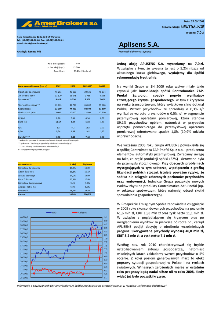 Data: 07.09.2008 Rekomendacja: NEUTRALNIE Wycena: Aleje Jerozolimskie 123a, 02-017 Warszawa Tel.: (48-22) 397-60-60, Fax.: (48-22) 397-60-61 e-mail: [email protected] Aplisens S.A. Analityk: Renata Miś Przemysł elektromaszynowy Kurs bi eżący (zł): 7,40 Li czba a kcji (tys .): 12 500 Free floa t: Dane skonsolidowane (tys. zł) Jedną akcję APLISENS S.A. wyceniamy na 7,0 zł. W związku z tym, że wycena ta jest o 5,2% niższa od aktualnego kursu giełdowego, wydajemy dla Spółki rekomendację Neutralnie. 28,4% (26 mln zł) 2007 2008 1H 2009* 2009P Przychody opera cyjne 41 213 45 163 20 631 48 034 Zys k opera cyjny 11 320 11 178 2 766 8 228 Zysk netto** 8 928 9 056 2 106 7 071 Wartoś ć ks i ęgowa** 41 013 49 703 65 042 55 386 Kapitalizacja 22 200 74 000 92 500 92 500 Li czba a kcji (mln) 3 000 10 000 12 500 12 500 EPS (zł) 2,98 0,91 0,54 0,57 BVPS (zł) 13,67 4,97 5,20 4,43 P/E 2,5 8,2 13,8 13,1 P/BV 0,54 1,49 1,42 1,67 Kurs (zł)*** 7,40 7,40 7,40 7,40 * wskaźniki rynkowe liczone na podstawie danych zanualizowanych ** zysk netto i kapitały przypadające jednostce dominującej *** kurs bieżący z dnia wydania rekomendacji Akcjonariusze: % akcji % głosów Mi ros ła w Da wi donis 16,0% 16,0% Adam Żura ws ki 15,1% 15,1% Ja nus z Szewczyk 14,0% 14,0% Piotr Zubkow 10,4% 10,4% Mi ros ła w Ka rczma rczyk 9,4% 9,4% Andrzej Kobia łka 6,7% 6,7% Pozos ta li 28,4% 28,4% Razem 100,0% 100,0% WIG Aplisens 40 000,0 9,1 39 000,0 8,9 38 000,0 8,7 36 000,0 35 000,0 8,5 8,3 8,1 7,7 33 000,0 7,5 32 000,0 7,3 31 000,0 7,1 29 000,0 28 000,0 W Prospekcie Emisyjnym Spółka zapowiadała osiągnięcie w 2009 roku skonsolidowanych przychodów na poziomie 61,6 mln zł, EBIT 13,8 mln zł oraz zysk netto 11,1 mln zł. W związku z pogłębiającym się kryzysem oraz po uwzględnieniu wyników za pierwsze półrocze br., Zarząd APLISENS podjął decyzję o obniżeniu wcześniejszych prognoz. Skorygowane przychody wynoszą 48,0 mln zł, EBIT 8,2 mln zł, a zysk netto 7,1 mln zł. 7,9 34 000,0 30 000,0 Na wyniki Grupy w 1H 2009 roku wpływ miały takie czynniki jak: konsolidacja spółki Controlmatica ZAPPnefal Sp. z o.o., spadek popytu wynikający z trwającego kryzysu gospodarczego, w tym z kryzysem na rynku transportowym, który wyjątkowo silno dotknął Polskę. Wzrost przychodów ze sprzedaży o 0,3% r/r wynikał ze wzrostu przychodów o 0,5% r/r w segmencie przemysłowej aparatury pomiarowej, która stanowi 89,1% przychodów ogółem, natomiast w przypadku osprzętu pomocniczego do przemysłowej aparatury pomiarowej odnotowano spadek 1,8% (10,9% udziału w przychodach). We wrześniu 2008 roku Grupa APLISENS powiększyła się o spółkę Controlmatica ZAP-Pnefal Sp. z o.o. - producenta elementów automatyki przemysłowej. Zwracamy uwagę na fakt, że część produkcji spółki (22%) kierowana była do przemysłu stoczniowego. Przy obecnych problemach występujących w tym sektorze, w połączeniu z groźbą likwidacji polskich stoczni, istnieje poważne ryzyko, że spółka nie osiągnie założonych poziomów przychodów oraz rentowności. Jednakże Grupa poszukuje nowych rynków zbytu na produkty Controlmatica ZAP-Pnefal (np. w sektorze spożywczym, który najmniej odczuł skutki spowolnienia gospodarczego). P - skorygowana prognoza Zarządu 37 000,0 7,0 zł 6,9 6,7 6,5 6,3 27 000,0 6,1 26 000,0 5,9 25 000,0 5,7 Według nas, rok 2010 charakteryzował się będzie ustabilizowaniem sytuacji gospodarczej, natomiast w kolejnych latach zakładamy wzrost przychodów o 5% rocznie. Z kolei poziom generowanych marż to efekt poprawy sytuacji gospodarczej w Polsce i na rynkach światowych. W naszych założeniach marże w ostatnim roku prognozy będą nadal niższe niż w roku 2008, kiedy widać już było początki kryzysu. Informacje o powiązaniach DM AmerBrokers ze Spółką znajdują się na ostatniej stronie, w rozdziale „Informacje dodatkowe”. Sytuacja w branży 1 Rynek aparatury kontrolnopomiarowej i automatyki przemysłowej Aparatura kontrolno-pomiarowa oraz automatyka przemysłowa wykorzystywane są głównie w przemyśle energetycznym, chemicznym, petrochemicznym, górniczym i hutniczym. Zastosowanie tej aparatury umożliwia pracę większości urządzeń przemysłowych, wpływa na znaczny wzrost wydajności wielu urządzeń i linii technologicznych oraz umożliwia ograniczenie zużycia energii i ilości odpadów w procesach produkcji. Stosowanie elementów automatyki i systemów regulacji przekłada się bezpośrednio na spadek kosztów we wszystkich gałęziach przemysłu. Ponadto aparatura kontrolno-pomiarowa, stanowiąc elementy systemów bezpieczeństwa, przeciwdziała awariom urządzeń przemysłowych. Rynek krajowy Wielkość polskiego rynku aparatury pomiarowej oszacowano w 2007 roku na około 95 mln zł. Przewidywano wtedy, że stopa wzrostu w latach 2007-2013 kształtować się będzie na poziomie 6,7% i na koniec 2013 roku wartość rynku prognozowana była na około 138 mln zł. Rynek aparatury kontrolno-pomiarowej Akcesoria instalacyjne dla w Polsce czujników oraz Czujniki i przetworniki temperatury 30% Hydrostatyczne sondy do pomiaru głębokości 7% przetworników temperatury i ciśnienia 9% Analogowe przetworniki do pomiaru ciśnienia i różnicy ciśnień 21% Inteligentne przetworniki do pomiaru ciśnienia i różnicy ciśnień 33% Źródło: Dane ze Spółki na podstawie Instytutu Metrologii i Inżynierii Biomedycznej na Wydziale Mechatroniki Politechniki Warszawskiej Wzrost rynku w najbliższych latach uzależniony będzie od poziomu nakładów na inwestycje, zarówno nowe, jak i odtworzeniowe w przemyśle petrochemicznym, energetyce, ochronie środowiska oraz branżach zajmujących się wydobyciem i przesyłem gazu ziemnego. Zarząd APLISENS szacuje, że udział Spółki w polskim rynku aparatury pomiarowej (tj. m.in. przetworniki ciśnienia, sondy głębokości, czujniki temperatury) w 2007 roku wyniósł około 25%. Rynek krajów WNP Według raportu firmy Frost&Sul
