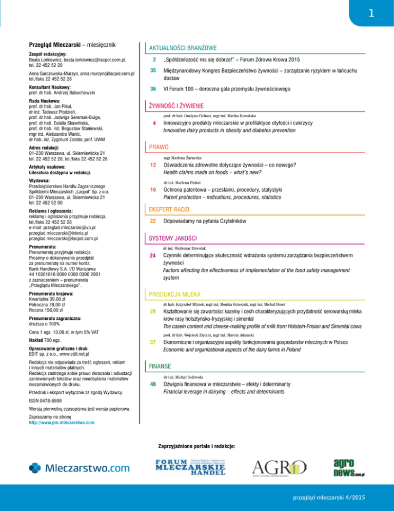 1 Przegląd Mleczarski – miesięcznik Zespół redakcyjny: Beata Lorkiewicz, [email protected], tel. 22 452 52 20 Anna Garczewska-Murzyn, [email protected] tel./faks 22 452 52 28 Konsultant Naukowy: prof. dr hab. Andrzej Babuchowski Rada Naukowa: prof. dr hab. Jan Pikul, dr inż. Tadeusz Płodzień, prof. dr hab. Jadwiga Seremak-Bulge, prof. dr hab. Eulalia Skawińska, prof. dr hab. inż. Bogusław Staniewski, mgr inż. Aleksandra Wanic, dr hab. inż. Zygmunt Zander, prof. UWM Adres redakcji: 01-230 Warszawa, ul. Skierniewicka 21 tel. 22 452 52 20, tel./faks 22 452 52 28 Artykuły naukowe: Literatura dostępna w redakcji. Wydawca: Przedsiębiorstwo Handlu Zagranicznego Spółdzielni Mleczarskich „Lacpol” Sp. z o.o. 01-230 Warszawa, ul. Skierniewicka 21 tel: 22 452 52 00 Reklama i ogłoszenia: reklamę i ogłoszenia przyjmuje redakcja, tel./faks 22 452 52 28 e-mail: [email protected] [email protected] [email protected] Prenumerata: Prenumeratę przyjmuje redakcja. Prosimy o dokonywanie przedpłat za prenumeratę na numer konta: Bank Handlowy S.A. I/O Warszawa 44 10301016 0000 0000 0306 2001 z zaznaczeniem – prenumerata „Przeglądu Mleczarskiego”. Prenumerata krajowa: Kwartalna 39,00 zł Półroczna 78,00 zł Roczna 156,00 zł AKTUALNOŚCI BRANŻOWE 2 35 Międzynarodowy Kongres Bezpieczeństwo żywności – zarządzanie ryzykiem w łańcuchu dostaw 36 VI Forum 100 – doroczna gala przemysłu żywnościowego ŻYWNOŚĆ I ŻYWIENIE prof. dr hab. Grażyna Cichosz, mgr inż. Marika Kowalska 4 mgr Marlena Żarnecka 12 Ochrona patentowa – przesłanki, procedury, statystyki Patent protection – indications, procedures, statistics EKSPERT RADZI 22 Odpowiadamy na pytania Czytelników SYSTEMY JAKOŚCI dr inż. Waldemar Dzwolak 24 Czynniki determinujące skuteczność wdrażania systemu zarządzania bezpieczeństwem żywności Factors affecting the effectiveness of implementation of the food safety management system PRODUKCJA MLEKA dr hab. Krzysztof Młynek, mgr inż. Monika Grzeszuk, mgr inż. Michał Benet 29 Kształtowanie się zawartości kazeiny i cech charakteryzujących przydatność serowarską mleka krów rasy holsztyńsko-fryzyjskiej i simental The casein content and cheese-making profile of milk from Holstein-Frisian and Simental cows prof. dr hab. Wojciech Ziętara, mgr inż. Marcin Adamski 37 Opracowanie graficzne i druk: EDIT sp. z o.o., www.edit.net.pl Przedruk i eksport wyłącznie za zgodą Wydawcy. Oświadczenia zdrowotne dotyczące żywności – co nowego? Health claims made on foods – what’s new? dr inż. Marlena Piekut 16 Cena 1 egz. 13,00 zł, w tym 5% VAT Redakcja nie odpowiada za treść ogłoszeń, reklam i innych materiałów płatnych. Redakcja zastrzega sobie prawo skracania i adiustacji zamówionych tekstów oraz nieodsyłania materiałów niezamówionych do druku. Innowacyjne produkty mleczarskie w profilaktyce otyłości i cukrzycy Innovative dairy products in obesity and diabetes prevention PRAWO Prenumerata zagraniczna: droższa o 100% Nakład 700 egz. „Spółdzielczość ma się dobrze!” – Forum Zdrowa Krowa 2015 Ekonomiczne i organizacyjne aspekty funkcjonowania gospodarstw mlecznych w Polsce Economic and organizational aspects of the dairy farms in Poland FINANSE dr inż. Michał Soliwoda 46 Dźwignia finansowa w mleczarstwie – efekty i determinanty Financial leverage in dairying – effects and determinants ISSN 0478-6599 Wersją pierwotną czasopisma jest wersja papierowa. Zapraszamy na stronę http://www.pm.mleczarstwo.com Zaprzyjaźnione portale i redakcje: przegląd mleczarski 4/2015