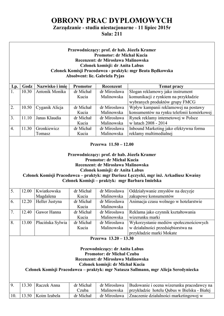 OBRONY PRAC DYPLOMOWYCH Zarządzanie - studia niestacjonarne - 11 lipiec 2015r Sala: 211 Przewodniczący: prof. dr hab. Józefa Kramer Promotor: dr Michał Kucia Recenzent: dr Mirosława Malinowska Członek komisji: dr Anita Labus Członek Komisji Pracodawca - praktyk: mgr Beata Będkowska Absolwent: lic. Gabriela Pyjas Lp. Godz Nazwisko i imię 1. 10.30 Antonik Monika Promotor dr Michał Kucia Recenzent dr Mirosława Malinowska 2. 10.50 Cyganik Alicja 3. 11.10 Janas Klaudia 4. 11.30 Gronkiewicz Tomasz dr Michał Kucia dr Michał Kucia dr Michał Kucia dr Mirosława Malinowska dr Mirosława Malinowska dr Mirosława Malinowska Temat pracy Slogan reklamowy jako instrument komunikacji z rynkiem na przykładzie wybranych produktów grupy FMCG Wpływ kampanii reklamowej na postawy konsumentów na rynku telefonii komórkowej Rynek reklamy internetowej w Polsce w latach 2008 - 2014 Inbound Marketing jako efektywna forma reklamy multimedialnej Przerwa 11.50 – 12.00 Przewodniczący: prof. dr hab. Józefa Kramer Promotor: dr Michał Kucia Recenzent: dr Mirosława Malinowska Członek komisji: dr Anita Labus Członek Komisji Pracodawca – praktyk: mgr Dariusz Łęczycki, mgr inż. Arkadiusz Kwaśny Członek Komisji – praktyk: mgr Barbara Imielska 5. 6. 12.00 Kwiatkowska Magdalena 12.20 Heller Justyna 7. 12.40 Gawor Hanna 8. 13.00 Plucińska Sylwia dr Michał Kucia dr Michał Kucia dr Michał Kucia dr Michał Kucia dr Mirosława Malinowska dr Mirosława Malinowska dr Mirosława Malinowska dr Mirosława Malinowska Oddziaływanie zmysłów na decyzje zakupowe konsumentów Animacja czasu wolnego w hotelarstwie Reklama jako czynnik kształtowania wizerunku marki Wykorzystanie mediów społecznościowych w działalności przedsiębiorstwa na przykładzie marki Mokate Przerwa 13.20 – 13.30 Przewodniczący: dr Anita Labus Promotor: dr Michał Czuba Recenzent: dr Mirosława Malinowska Członek komisji: dr Michał Kucia Członek Komisji Pracodawca – praktyk: mgr Natasza Sallmann, mgr Alicja Seredyniecka 9. 13.30 Raczek Anna 10. 13.50 Koim Izabela dr Michał Czuba dr Michał dr Mirosława Malinowska dr Mirosława Budowanie i ocena wizerunku pracodawcy na przykładzie hotelu Qubus w Bielsku - Białej Znaczenie działalności marketingowej w 11. 14.10 Korcz Joanna 12. 14.30 Wnęk Aleksandra 14.50 Sikora Adam 13. Czuba Malinowska dr Michał Czuba dr Michał Czuba dr Michał Czuba dr Mirosława Malinowska dr Mirosława Malinowska dr Mirosława Malinowska Przerwa funkcjonowaniu hotelu na przykładzie Qubus Hotel Bielsko - Biała Potencjał rozwoju usług wellness i spa na przykładzie hotelu Mazowsze z Ustronia Standardy obsługi w gastronomii na przykładzie Qubus Hotel Bielsko - Biała Ocena jakości usług hotelarskich na przykładzie Papuga Park Htel **** Spa 15.10 – 15.30 Przewodniczący: dr Anita Labus Promotor: dr Michał Czuba Recenzent: dr Mirosława Malinowska Członek komisji: dr Michał Kucia Członek Komisji – praktyk: mgr Sylwia Pilch Absolwent: lic. Katarzyna Tulkis 15.50 Dobija Aleksandra dr Michał Czuba dr Michał Czuba dr Mirosława Malinowska dr Mirosława Malinowska 16.10 Maruszczak Sebastian 16.30 Kaczmarek Dominika dr Michał Czuba dr Michał Czuba dr Mirosława Malinowska dr Mirosława Malinowska 16.50 Kaczmarczyk Joanna dr Michał Czuba dr Mirosława Malinowska 14. 15.30 Sordyl Izabela 15. 16. 17. 18. Typy gości, a rodzaje usług w hotelu wellness i spa Standardy obsługi w obiekcie hotelarskim na przykładzie Papuga Park Hotel w Bielsku Białej Sport, spa i wellness jako oferta nowoczesnego hotelarstwa Marketing usług wellness i spa na przykładzie hoteli Mazowsze Medi - Spa oraz Meta Resort i Vine SPA Usługi prozdrowotne i rekreacyjne w hotelarstwie na przykładzie hotelu Fero Lux w Korbielowie Przerwa 17.10 – 17.40 Przewodniczący: dr Anita Labus Promotor: dr Michał Czuba Recenzent: dr Mirosława Malinowska Promotor: dr Radosław Cyran Recenzent: dr Michał Czuba Członek komisji: dr Michał Kucia Członek Komisji – praktyk, wykładowca BWS: mgr Ewa Górnisiewicz Członek Komisji - wykładowca BWS : mgr Magdalena Górnisiewicz 19. 17.40 Korhel Alicja 20. 18.00 Kos Andrzej 21. 18.20 Satława Krystian dr Michał Czuba dr Michał Czuba dr Radosław Cyran dr Mirosława Malinowska dr Mirosława Malinowska dr Michał Czuba Zarządzanie restauracją hotelową i tradycyjną. Studium porównawcze Konsumpcja alkoholi wysokoprocentowych w polskich hotelach Rentowność inwestycji w nieruchomości wymagających nakładów finansowych na remont