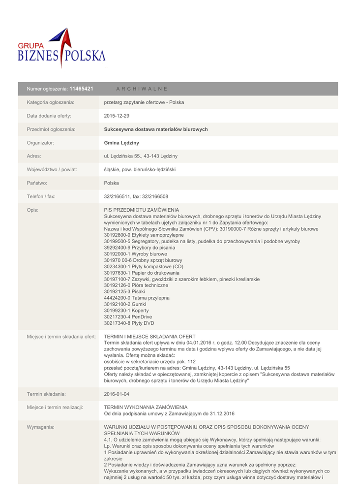 Numer ogłoszenia: 11465421 A RCHI WA L N E Kategoria ogłoszenia: przetarg zapytanie ofertowe - Polska Data dodania oferty: 2015-12-29 Przedmiot ogłoszenia: Sukcesywna dostawa materiałów biurowych Organizator: Gmina Lędziny Adres: ul. Lędzińska 55., 43-143 Lędziny Województwo / powiat: śląskie, pow. bieruńsko-lędziński Państwo: Polska Telefon / fax: 32/2166511, fax: 32/2166508 Opis: PIS PRZEDMIOTU ZAMÓWIENIA Sukcesywna dostawa materiałów biurowych, drobnego sprzętu i tonerów do Urzędu Miasta Lędziny wymienionych w tabelach ujętych załączniku nr 1 do Zapytania ofertowego: Nazwa i kod Wspólnego Słownika Zamówień (CPV): 30190000-7 Różne sprzęty i artykuły biurowe 30192800-9 Etykiety samoprzylepne 30199500-5 Segregatory, pudełka na listy, pudełka do przechowywania i podobne wyroby 39292400-9 Przybory do pisania 30192000-1 Wyroby biurowe 301970 00-6 Drobny sprzęt biurowy 30234300-1 Płyty kompaktowe (CD) 30197630-1 Papier do drukowania 30197100-7 Zszywki, gwoździki z szerokim łebkiem, pinezki kreślarskie 30192126-0 Pióra techniczne 30192125-3 Pisaki 44424200-0 Taśma przylepna 30192100-2 Gumki 30199230-1 Koperty 30217230-4 PenDrive 30217340-8 Płyty DVD Miejsce i termin składania ofert: TERMIN I MIEJSCE SKŁADANIA OFERT Termin składania ofert upływa w dniu 04.01.2016 r. o godz. 12.00 Decydujące znaczenie dla oceny zachowania powyższego terminu ma data i godzina wpływu oferty do Zamawiającego, a nie data jej wysłania. Ofertę można składać: osobiście w sekretariacie urzędu pok. 112 przesłać pocztą/kurierem na adres: Gmina Lędziny, 43-143 Lędziny, ul. Lędzińska 55 Oferty należy składać w opieczętowanej, zamkniętej kopercie z opisem "Sukcesywna dostawa materiałów biurowych, drobnego sprzętu i tonerów do Urzędu Miasta Lędziny" Termin składania: 2016-01-04 Miejsce i termin realizacji: TERMIN WYKONANIA ZAMÓWIENIA Od dnia podpisania umowy z Zamawiającym do 31.12.2016 Wymagania: WARUNKI UDZIAŁU W POSTĘPOWANIU ORAZ OPIS SPOSOBU DOKONYWANIA OCENY SPEŁNIANIA TYCH WARUNKÓW 4.1. O udzielenie zamówienia mogą ubiegać się Wykonawcy, którzy spełniają następujące warunki: Lp. Warunki oraz opis sposobu dokonywania oceny spełniania tych warunków 1 Posiadanie uprawnień do wykonywania określonej działalności Zamawiający nie stawia warunków w tym zakresie 2 Posiadanie wiedzy i doświadczenia Zamawiający uzna warunek za spełniony poprzez: Wykazanie wykonanych, a w przypadku świadczeń okresowych lub ciągłych również wykonywanych co najmniej 2 usług na wartość 50 tys. zł każda, przy czym usługa winna dotyczyć dostawy materiałów i drobnego sprzętu biurowego. 4.2. Ocena spełniania warunków udziału w postępowaniu będzie dokonana na zasadzie spełnia/nie spełnia, na podstawie oświadczeń i dokumentów wymienionych w pkt 5. 5. WYKAZ OŚWIADCZEŃ LUB DOKUMENTÓW, JAKIE MAJĄ DOSTARCZYĆ WYKONAWCY W CELU POTWIERDZENIA SPEŁNIANIA WARUNKÓW UDZIAŁU W POSTĘPOWANIU ORAZ INNYCH WYMAGANYCH DOKUMENTÓW 5.1. W celu wykazania spełniania przez Wykonawcę warunków, należy przedłożyć: Lp. Wymagany dokument 1 Wykaz dostaw lub usług Wykaz wykonanych, a w przypadku świadczeń okresowych lub ciągłych również wykonywanych, głównych dostaw lub usług, w okresie ostatnich trzech lat przed upływem terminu składania ofert albo wniosków o dopuszczenie do udziału w postępowaniu, a jeżeli okres prowadzenia działalności jest krótszy -w tym okresie, wraz z podaniem ich wartości, przedmiotu, dat wykonania i podmiotów, na rzecz których dostawy lub usługi zostały wykonane, oraz załączeniem dowodów, czy zostały wykonane lub są wykonywane należycie 6. OPIS SPOSOBU OBLICZANIA CENY OFERTY 6.1 Cena podana w ofercie powinna zawierać wszystkie koszty związane z realizacją przedmiotu zamówienia. 6.2 Podana cena brutto jest obowiązująca w całym okresie ważności oferty, pozostaje stała przez cały okres realizacji zamówienia i nie będzie podlegać waloryzacji. 6.3 Cena ofertowa winna być określona w złotych polskich (zł) w zaokrągleniu do 1 grosza. Wszystkie płatności będą realizowane wyłącznie w złotych polskich, zgodnie z obowiązującymi przepisami. 6.4Cena ofertowa winna być podana cyfrowo i słownie. Za cenę ofert przyjmuje się cenę brutto (tj. z podatkiem VAT). 7. OPIS SPOSOBU PRZYGOTOWANIA OFERTY 7.1. Oferta winna być sporządzona w języku polskim, maszynowo lub czytelnym pismem ręcznym, zgodnie z formularzem stanowiącym załącznik nr 1. 7.2. Oferent może złożyć tylko jedną ofertę. Oferta składa się z: - formularza ofertowego, - wykazu usług (zgodnie z 5.1.1), Do oferty należy również dołączyć: - aktualny odpis z właściwego rejestru albo aktualne zaświadczenie o wpisie do ewidencji działalności gospodarczej, jeżeli odrębne przepisy wymagają wpisu do rejestru lub zgłoszenia do ewidencji działalności gospodarczej, wystawiony nie wcześniej niż 6 miesięcy przed upływem terminu składania ofert, oraz - pełnomocnictwo, jeżeli umocowanie osoby podpisującej ofertę nie wynika jednoznacznie z treści przedłożonego odpisu z rejestru lub zaświadczenia, 7.3. Formularz ofertowy wraz ze wszystkimi załącznikami musi być trwale spięty i ponumerowany. 7.4. Oferta powinna być złożona w zamkniętej kopercie z oznaczeniem Wykonawcy, adresem, oraz dopiskiem: Oferta na: "Sukcesyw na dostawa materiałów biurowych, drobnego sprzętu i tonerów do Urzędu Miasta Lędziny " 7.5. Oferty złożone po terminie zostaną zwrócone Wykonawcy bez otwierania. 7.6. Ewentualne poprawki w treści oferty winny być naniesione w sposób umożliwiający odczytanie błędnego tekstu (przekreślone), parafowane wraz z adnotacją daty ich uczynienia. 7.7. Wykonawca może wprowadzić zmiany lub wycofać złożoną przez siebie ofertę pod warunkiem, że zamawiający otrzyma pisemne powiadomienie o wprowadzeniu zmian lub wycofaniu oferty, przed upływem terminu składani