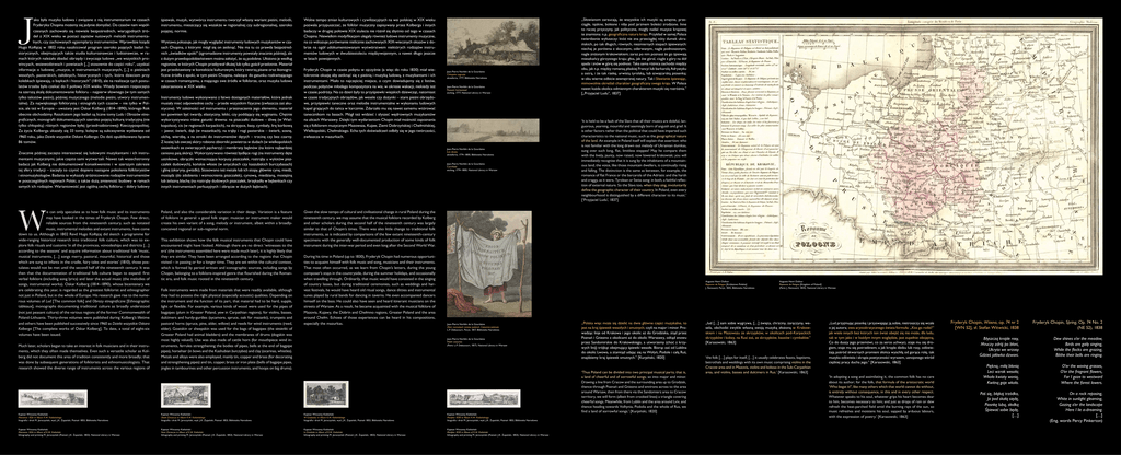 J aka była muzyka ludowa i związane z nią instrumentarium w czasach Fryderyka Chopina możemy się jedynie domyślać. Do czasów nam współczesnych zachowało się niewiele bezpośrednich, wiarygodnych źródeł z XIX wieku w postaci zapisów nutowych melodii instrumenta lnych, czy zachowanych egzemplarzy instrumentów. Wprawdzie ksiądz Hugo Kołłątaj w 1802 roku naszkicował program szeroko pojętych badań historycznych, obejmujących także studia kulturoznawcze i ludoznawcze, w ramach których należało zbadać obrzędy i zwyczaje ludowe „we wszystkich prowincyach, woiewodztwach i powiatach [...] stosownie do części roku”, uzyskać informacje o ludowej „muzyce, o instrumentach muzycznych, [...] o pieśniach wesołych, pasterskich, żałobnych, historycznych i tych, które dzieciom przy kolebkach śpiewają, o baykach i historyach” (1810), ale na realizacje tych postulatów trzeba było czekać do II połowy XIX wieku. Wtedy bowiem rozpoczęto na szerszą skalę dokumentowanie folkloru – najpierw słownego (w tym samych tylko tekstów pieśni), później muzycznego (melodie pieśni, utwory instrumentalne). Za największego folklorystę i etnografa tych czasów – nie tylko w Polsce, ale też w Europie – uważany jest Oskar Kolberg (1814–1890), którego Rok obecnie obchodzimy. Rezultatem jego badań są liczne tomy Ludu i Obrazów etnograficznych, monografii dokumentujących szeroko pojętą kulturę tradycyjną (nie tylko chłopską) różnych regionów byłej (przedrozbiorowej) Rzeczypospolitej. Za życia Kolberga ukazały się 33 tomy, kolejne są sukcesywnie wydawane od 1960 roku, jako Dzieła wszystkie Oskara Kolberga. Do dziś opublikowano łącznie 86 tomów. Znacznie później zaczęto interesować się ludowymi muzykantami i ich instrumentami muzycznymi, jakie często sami wytwarzali. Nawet tak wszechstronny badacz jak Kolberg nie dokumentował konsekwentnie i w szerszym zakresie tej sfery tradycji – zaczęły to czynić dopiero następne pokolenia folklorystów i etnomuzykologów. Badania te wykazały zróżnicowanie rodzajów instrumentów w poszczególnych regionach Polski, a także dużą zmienność budowy w ramach samych ich rodzajów. Wariantowość jest ogólną cechą folkloru – dobry ludowy W e can only speculate as to how folk music and its instruments may have looked in the times of Fryderyk Chopin. Few direct, reliable sources from the nineteenth century, such as notated music, instrumental melodies and extant instruments, have come down to us. Although in 1802 Revd Hugo Kołłątaj did sketch a programme for wide-ranging historical research into traditional folk culture, which was to explore folk rituals and customs ‘in all the provinces, voivodeships and districts […] according to the seasons’ and acquire information about traditional folk ‘music, musical instruments, […] songs merry, pastoral, mournful, historical and those which are sung to infants in the cradle, fairy tales and stories’ (1810), those postulates would not be met until the second half of the nineteenth century. It was then that the documentation of traditional folk culture began to expand: first verbal folklore (including song lyrics) and later the actual music (the melodies of songs, instrumental works). Oskar Kolberg (1814–1890), whose bicentenary we are celebrating this year, is regarded as the greatest folklorist and ethnographer not just in Poland, but in the whole of Europe. His research gave rise to the numerous volumes of Lud [The common folk] and Obrazy etnograficzne [Ethnographic tableaux], monographs documenting traditional culture as broadly understood (not just peasant culture) of the various regions of the former Commonwealth of Poland-Lithuania. Thirty-three volumes were published during Kolberg’s lifetime and others have been published successively since 1960 as Dzieła wszystkie Oskara Kolberga [The complete works of Oskar Kolberg]. To date, a total of eight-six volumes have been issued. Much later, scholars began to take an interest in folk musicians and in their instruments, which they often made themselves. Even such a versatile scholar as Kolberg did not document this area of tradition consistently and more broadly; that was done by subsequent generations of folklorists and ethnomusicologists. That research showed the diverse range of instruments across the various regions of śpiewak, muzyk, wytwórca instrumentu tworzył własny wariant pieśni, melodii, instrumentu, mieszczący się wszakże w regionalnej czy subregionalnej, szeroko pojętej, normie. Wystawa pokazuje, jak mogły wyglądać instrumenty ludowych muzykantów w czasach Chopina, z którymi mógł się on zetknąć. Nie ma tu co prawda bezpośrednich „świadków epoki” (zgromadzone instrumenty powstały znacznie później), ale z dużym prawdopodobieństwem można założyć, że są podobne. Ułożono je według regionów, w których Chopin przebywał dłużej lub tylko gościł przelotnie. Materiał jest przedstawiony w kontekście kulturowym, który tworzą pisane oraz ikonograficzne źródła z epoki, w tym pieśni Chopina, należące do gatunku rozkwitającego w czasach romantyzmu, a mającego swe źródła w folklorze, oraz muzyka ludowa zakorzeniona w XIX wieku. Instrumenty ludowe wykonywano z łatwo dostępnych materiałów, które jednak musiały mieć odpowiednie cechy – przede wszystkim fizyczne (zwłaszcza zaś akustyczne). W zależności od instrumentu i przeznaczenia jego elementu, materiał ten powinien być twardy, elastyczny, lekki, czy poddający się wyginaniu. Chętnie wykorzystywano różne gatunki drewna: na piszczałki dudowe – śliwę (w Wielkopolsce), cis (w regionach karpackich), na skrzypce, basy, cymbały, lirę korbową – jawor, świerk, dąb (w mazankach), na trąby i rogi pasterskie – świerk, sosnę, olchę, wierzbę, a na stroiki do instrumentów dętych – trzcinę czy bez czarny. Z koziej lub owczej skóry robiono zbi