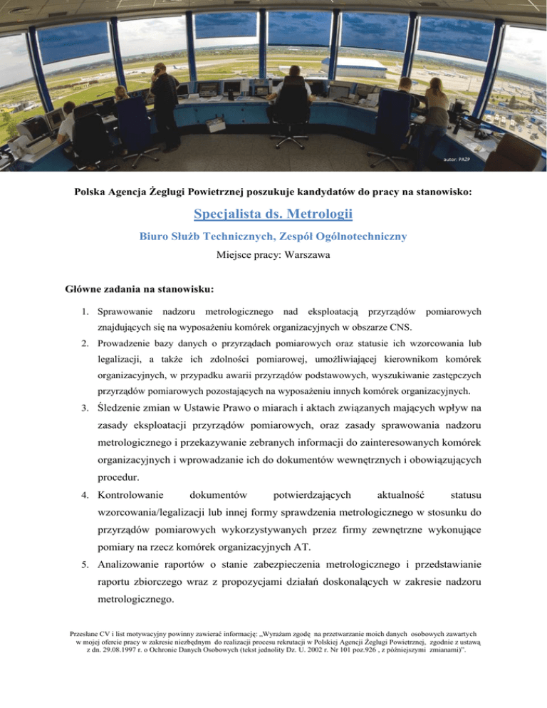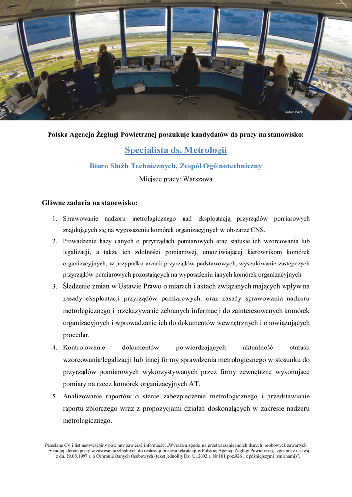 autor: PAŻP Polska Agencja Żeglugi Powietrznej poszukuje kandydatów do pracy na stanowisko: Specjalista ds. Metrologii Biuro Służb Technicznych, Zespół Ogólnotechniczny Miejsce pracy: Warszawa Główne zadania na stanowisku: 1. Sprawowanie nadzoru metrologicznego nad eksploatacją przyrządów pomiarowych znajdujących się na wyposażeniu komórek organizacyjnych w obszarze CNS. 2. Prowadzenie bazy danych o przyrządach pomiarowych oraz statusie ich wzorcowania lub legalizacji, a także ich zdolności pomiarowej, umożliwiającej kierownikom komórek organizacyjnych, w przypadku awarii przyrządów podstawowych, wyszukiwanie zastępczych przyrządów pomiarowych pozostających na wyposażeniu innych komórek organizacyjnych. 3. Śledzenie zmian w Ustawie Prawo o miarach i aktach związanych mających wpływ na zasady eksploatacji przyrządów pomiarowych, oraz zasady sprawowania nadzoru metrologicznego i przekazywanie zebranych informacji do zainteresowanych komórek organizacyjnych i wprowadzanie ich do dokumentów wewnętrznych i obowiązujących procedur. 4. Kontrolowanie dokumentów potwierdzających aktualność statusu wzorcowania/legalizacji lub innej formy sprawdzenia metrologicznego w stosunku do przyrządów pomiarowych wykorzystywanych przez firmy zewnętrzne wykonujące pomiary na rzecz komórek organizacyjnych AT. 5. Analizowanie raportów o stanie zabezpieczenia metrologicznego i przedstawianie raportu zbiorczego wraz z propozycjami działań doskonalących w zakresie nadzoru metrologicznego. Przesłane CV i list motywacyjny powinny zawierać informację: „Wyrażam zgodę na przetwarzanie moich danych osobowych zawartych w mojej ofercie pracy w zakresie niezbędnym do realizacji procesu rekrutacji w Polskiej Agencji Żeglugi Powietrznej, zgodnie z ustawą z dn. 29.08.1997 r. o Ochronie Danych Osobowych (tekst jednolity Dz. U. 2002 r. Nr 101 poz.926 , z późniejszymi zmianami)”. 6. Pełnienie roli inicjatora zbiorczego wniosków zakupowych dot. zakupu, naprawy i legalizacji/wzorcowania/sprawdzania przyrządów pomiarowych w obszarze CNS. 7. Administrowanie procedurą postępowania PP-AT-01 Nadzór metrologiczny. Wymagania wobec kandydatów: wykształcenie wyższe, preferowane kierunki: elektronika, elektryka, mechanika, elektromechanika, fizyka, metrologia, miernictwo elektryczne lub elektroniczne, min. 5 lat stażu pracy w organach nadzoru metrologicznego, placówkach dydaktycznych na stanowiskach związanych z kształceniem metrologów, placówkach naukowych na stanowisku związanym z eksploatacją lub kontrolą przyrządów pomiarowych, zrealizowane szkolenia w zakresie zarządzania jakością, eksploatacji, konstrukcji lub napraw przyrządów pomiarowych oraz w zakresie prawa o miarach i aktów związanych, prawo jazdy kategorii B, znajomość języka angielskiego na poziomie min. B2 (z uwzględnieniem znajomości słownictwa technicznego), umiejętność budowania pozytywnych relacji interpersonalnych, umiejętność pracy w zespole, efektywna organizacja pracy, samodzielność, odpowiedzialność, dokładność, sumienność. metodyczność. mile widziane ukończenie studiów podyplomowych w zakresie metrologii. Przesłane CV i list motywacyjny powinny zawierać informację: „Wyrażam zgodę na przetwarzanie moich danych osobowych zawartych w mojej ofercie pracy w zakresie niezbędnym do realizacji procesu rekrutacji w Polskiej Agencji Żeglugi Powietrznej, zgodnie z ustawą z dn. 29.08.1997 r. o Ochronie Danych Osobowych (tekst jednolity Dz. U. 2002 r. Nr 101 poz.926 , z późniejszymi zmianami)”. Oferujemy: zatrudnienie w oparciu o umowę o pracę; bogaty pakiet benefitów; zatrudnienie w stabilnej firmie o wieloletniej tradycji. Zainteresowane osoby prosimy o przesłanie do dnia 26.06.2015r. aplikacji zawierającej: CV i list motywacyjny na adres: [email protected] z dopiskiem w tytule wiadomości: ATIO. Za wszystkie aplikacje dziękujemy. Informujemy, że tylko kompletne aplikacje będę rozpatrywane i będziemy się skontaktować jedynie z wybranymi kandydatami. Przesłane CV i list motywacyjny powinny zawierać informację: „Wyrażam zgodę na przetwarzanie moich danych osobowych zawartych w mojej ofercie pracy w zakresie niezbędnym do realizacji procesu rekrutacji w Polskiej Agencji Żeglugi Powietrznej, zgodnie z ustawą z dn. 29.08.1997 r. o Ochronie Danych Osobowych (tekst jednolity Dz. U. 2002 r. Nr 101 poz.926 , z późniejszymi zmianami)”.