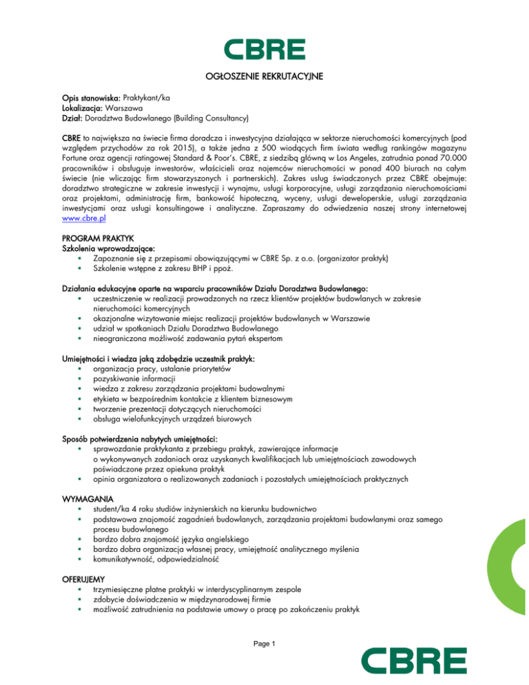 OGŁOSZENIE REKRUTACYJNE Opis stanowiska: Praktykant/ka Lokalizacja: Warszawa Dział: Doradztwa Budowlanego (Building Consultancy) CBRE to największa na świecie firma doradcza i inwestycyjna działająca w sektorze nieruchomości komercyjnych (pod względem przychodów za rok 2015), a także jedna z 500 wiodących firm świata według rankingów magazynu Fortune oraz agencji ratingowej Standard & Poor’s. CBRE, z siedzibą główną w Los Angeles, zatrudnia ponad 70.000 pracowników i obsługuje inwestorów, właścicieli oraz najemców nieruchomości w ponad 400 biurach na całym świecie (nie wliczając firm stowarzyszonych i partnerskich). Zakres usług świadczonych przez CBRE obejmuje: doradztwo strategiczne w zakresie inwestycji i wynajmu, usługi korporacyjne, usługi zarządzania nieruchomościami oraz projektami, administrację firm, bankowość hipoteczną, wyceny, usługi deweloperskie, usługi zarządzania inwestycjami oraz usługi konsultingowe i analityczne. Zapraszamy do odwiedzenia naszej strony internetowej www.cbre.pl PROGRAM PRAKTYK Szkolenia wprowadzające: Zapoznanie się z przepisami obowiązującymi w CBRE Sp. z o.o. (organizator praktyk) Szkolenie wstępne z zakresu BHP i ppoż. Działania edukacyjne oparte na wsparciu pracowników Działu Doradztwa Budowlanego: uczestniczenie w realizacji prowadzonych na rzecz klientów projektów budowlanych w zakresie nieruchomości komercyjnych okazjonalne wizytowanie miejsc realizacji projektów budowlanych w Warszawie udział w spotkaniach Działu Doradztwa Budowlanego nieograniczona możliwość zadawania pytań ekspertom Umiejętności i wiedza jaką zdobędzie uczestnik praktyk: organizacja pracy, ustalanie priorytetów pozyskiwanie informacji wiedza z zakresu zarządzania projektami budowalnymi etykieta w bezpośrednim kontakcie z klientem biznesowym tworzenie prezentacji dotyczących nieruchomości obsługa wielofunkcyjnych urządzeń biurowych Sposób potwierdzenia nabytych umiejętności: sprawozdanie praktykanta z przebiegu praktyk, zawierające informacje o wykonywanych zadaniach oraz uzyskanych kwalifikacjach lub umiejętnościach zawodowych poświadczone przez opiekuna praktyk opinia organizatora o realizowanych zadaniach i pozostałych umiejętnościach praktycznych WYMAGANIA student/ka 4 roku studiów inżynierskich na kierunku budownictwo podstawowa znajomość zagadnień budowlanych, zarządzania projektami budowlanymi oraz samego procesu budowlanego bardzo dobra znajomość języka angielskiego bardzo dobra organizacja własnej pracy, umiejętność analitycznego myślenia komunikatywność, odpowiedzialność OFERUJEMY trzymiesięczne płatne praktyki w interdyscyplinarnym zespole zdobycie doświadczenia w międzynarodowej firmie możliwość zatrudnienia na podstawie umowy o pracę po zakończeniu praktyk Page 1 Uprzejmie informujemy, że skontaktujemy się tylko z wybranymi osobami. Prosimy o załączenie do aplikacji następującej klauzuli: Wyrażam zgodę na przetwarzanie przekazanych przeze mnie w CV i liście motywacyjnym danych osobowych przez CBRE Sp. z o.o. z siedzibą w Warszawie, przy Rondzie ONZ 1, w celach przyszłych procesów rekrutacji (włączenia CV do bazy danych kandydatów Spółki), zgodnie z ustawą o ochronie danych osobowych z dnia 29 sierpnia 1997 r. ( Dz. U. 2015. poz. 2135). Adres do aplikowania: [email protected] ; [email protected] z dopiskiem Building Consultancy - praktyki Page 2