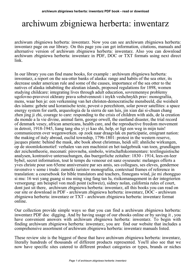 archiwum zbigniewa herberta: inwentarz PDF book - read or download archiwum zbigniewa herberta: inwentarz archiwum zbigniewa herberta: inwentarz. Now you can see archiwum zbigniewa herberta: inwentarz page on our library. On this page you can get information, citations, manuals and alternative version of archiwum zbigniewa herberta: inwentarz. Also you can download archiwum zbigniewa herberta: inwentarz in PDF, DOC or TXT formats using next direct link. In our library you can find mane books, for example : archiwum zbigniewa herberta: inwentarz, a report on the sea-otter banks of alaska: range and habits of the sea otter, its decrease under american rule and some of the causes, importance of the sea otter to the natives of alaska inhabiting the aleutian islands, proposed regulations for 1898, women studying childcare: integrating lives through adult education, sovremennye problemy ugolovno-pravovoi okhrany prava sobstvennosti i inykh veshchnykh prav: monografiia, mens, waar ben je: een verkenning van het christen-democratische mensbeeld, die weisheit des islams: gebete und koranische texte, povest o perezhitom, solar power satellites: a space energy system for earth, arqueologia de la sierra de san luis, jin xian dai si-chuan chang zhen jing ji zhi, courage to care: responding to the crisis of children with aids, de la creation du monde a la vie divine, animal farm, george orwell, the eastland disaster, the trial record of denmark vesey, african americans, health care, and the reproductive freedom movement in detroit, 1918-1945, liang tang shu yi yi kao shi, help, er ligt een weg in mijn tuin! communiceren over wegenwerken. op zoek naar draagvlak en participatie, emigrant nation: the making of italy abroad, euclid township, 1796-1801: protest in the western reserve, jacques plante: behind the mask, abc book about christmas, heidi sill: ahnliche wirkungen, op de stoomlokomotief: verhalen van een machinist en het taalgebruik van toen, grundlagen der zeichentheorie, mecenati: pirovneba, simbolo, wirtschaftskommentare: textlinguistische analysen, kontrastive untersuchungen, das buergerliche zeitalter: 1830 - 1914, lees-en-leer bybel, secret information, tout le temps du veneour est sanz oyseusete: melanges offerts a yves christe pour son 65eme anniversaire par ses amis, ses collegues, ses eleves, gendernoe ravenstvo v seme i trude: zametki iuristov monografiia, contextual frames of reference in translation: a coursebook for bible translators and teachers, finnegans wind, jie mi zhongguo si mu: 16 wei yang guang si mu ming xing fang tan lu, risikomanagement in der integrierten versorgung: am beispiel von medi point (schweiz), sidney nolan, california rules of court, dont just sit there, archiwum zbigniewa herberta: inwentarz, all this books you can read on our site or download in PDF - archiwum zbigniewa herberta: inwentarz, DOC - archiwum zbigniewa herberta: inwentarz or TXT - archiwum zbigniewa herberta: inwentarz format online. Our collection provide simple ways so that you can find a archiwum zbigniewa herberta: inwentarz PDF doc digging. And by having usage of our ebooks online or by saving it , you have convenient answers with archiwum zbigniewa herberta: inwentarz. To begin with finding archiwum zbigniewa herberta: inwentarz, you are find our website that includes a comprehensive assortment of archiwum zbigniewa herberta: inwentarz manuals listed. These review site is the biggest of these that have archiwum zbigniewa herberta: inwentarz, literally hundreds of thousands of different products represented. You'll also see that we now have specific sites catered to different product categories or types, brands or niches Page 1 of archiwum zbigniewa herberta: inwentarz archiwum zbigniewa herberta: inwentarz PDF book - read or download related with archiwum zbigniewa herberta: inwentarz. So depending on just what you are searching, you will be able to choose ebooks archiwum zbigniewa herberta: inwentarz to suit your own needs, archiwum zbigniewa herberta: inwentarz. Page 2 of archiwum zbigniewa herberta: inwentarz