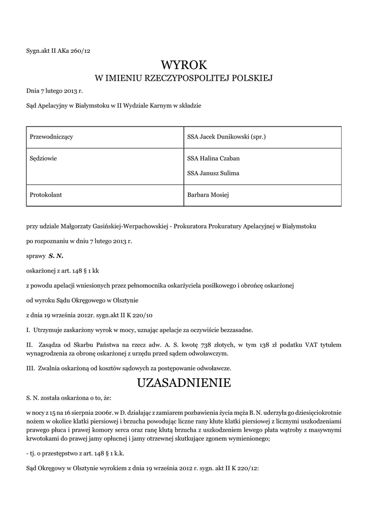 Sygn.akt II AKa 260/12 WYROK W IMIENIU RZECZYPOSPOLITEJ POLSKIEJ Dnia 7 lutego 2013 r. Sąd Apelacyjny w Białymstoku w II Wydziale Karnym w składzie Przewodniczący SSA Jacek Dunikowski (spr.) Sędziowie SSA Halina Czaban SSA Janusz Sulima Protokolant Barbara Mosiej przy udziale Małgorzaty Gasińskiej-Werpachowskiej - Prokuratora Prokuratury Apelacyjnej w Białymstoku po rozpoznaniu w dniu 7 lutego 2013 r. sprawy S. N. oskarżonej z art. 148 § 1 kk z powodu apelacji wniesionych przez pełnomocnika oskarżyciela posiłkowego i obrońcę oskarżonej od wyroku Sądu Okręgowego w Olsztynie z dnia 19 września 2012r. sygn.akt II K 220/10 I. Utrzymuje zaskarżony wyrok w mocy, uznając apelacje za oczywiście bezzasadne. II. Zasądza od Skarbu Państwa na rzecz adw. A. S. kwotę 738 złotych, w tym 138 zł podatku VAT tytułem wynagrodzenia za obronę oskarżonej z urzędu przed sądem odwoławczym. III. Zwalnia oskarżoną od kosztów sądowych za postępowanie odwoławcze. UZASADNIENIE S. N. została oskarżona o to, że: w nocy z 15 na 16 sierpnia 2006r. w D. działając z zamiarem pozbawienia życia męża B. N. uderzyła go dziesięciokrotnie nożem w okolice klatki piersiowej i brzucha powodując liczne rany kłute klatki piersiowej z licznymi uszkodzeniami prawego płuca i prawej komory serca oraz ranę kłutą brzucha z uszkodzeniem lewego płata wątroby z masywnymi krwotokami do prawej jamy opłucnej i jamy otrzewnej skutkujące zgonem wymienionego; - tj. o przestępstwo z art. 148 § 1 k.k. Sąd Okręgowy w Olsztynie wyrokiem z dnia 19 września 2012 r. sygn. akt II K 220/12: I. oskarżoną S. N. uznał za winną tego, że w nocy z 15 na 16 sierpnia 2006 r. w D. działając z zamiarem bezpośrednim pozbawienia życia męża B. N. uderzyła go dziesięciokrotnie nożem w okolice klatki piersiowej i brzucha powodując liczne rany kłute klatki piersiowej z licznymi uszkodzeniami prawego płuca i prawej komory serca oraz ranę kłutą brzucha z uszkodzeniem lewego płata wątroby z masywnymi krwotokami do prawej jamy opłucnej i jamy otrzewnej skutkujące zgonem wymienionego, przy czym działała w stanie silnego wzburzenia usprawiedliwionego okolicznościami i czyn ten kwalifikując jako przestępstwo z art. 148 § 4 k.k., na podstawie art. 148 § 4 k.k. skazał ją i wymierzył jej karę 2 lat i 6 miesięcy pozbawienia wolności; II. na podstawie art. 63 § 1 k.k. na poczet orzeczonej kary pozbawienia wolności zaliczył oskarżonej okresy rzeczywistego pozbawienia wolności od 16 sierpnia 2006 r. do 18 sierpnia 2006 r., od 4 października 2006 r. do 2 stycznia 2007 r. i od 26 marca 2010 r. do 14 kwietnia 2010 r.; III. na podstawie art. 44 § 2 k.k. orzekł przepadek dowodu rzeczowego w postaci noża zapisanego pod poz. 1 w księdze przechowywanych przedmiotów tut. Sądu pod nr (...), a na podstawie art. 230 § 2 k.p.k. pozostałe dowody rzeczowe tam zapisane nakazał zwrócić oskarżonej; IV. na podstawie art. 627 § 1 k.p.k. zasądził od oskarżonej na rzecz Skarbu Państwa kwotę 400 złotych tytułem opłaty oraz pozostałe koszty sądowe w ½ części, a na podstawie art. 624 § 1 k.p.k. w pozostałym zakresie zwolnił ją od zapłaty kosztów sądowych; V. zasądził od Skarbu Państwa na rzecz adw. A. S. kwotę 1320 złotych powiększoną o należny podatek VAT w stawce 23 % tytułem wynagrodzenia za obronę oskarżonej z urzędu. Apelacje od powyższego wywiódł obrońca oskarżonej i pełnomocnik oskarżyciela posiłkowego T. N.. Obrońca oskarżonej zaskarżając powyższy wyrok w części dotyczącej wymiaru kary zarzucił: 1. błąd w ustaleniach faktycznych poprzez przyjęcie, że oskarżona działała w zamiarze bezpośrednim i chciała zrealizowania skutku śmiertelnego, podczas gdy materiał dowodowy zgromadzony w niniejszej sprawie nie pozwala na przyjęcie takiego wniosku, 2. rażącą niewspółmierność kary, poprzez nieprawidłową ocenę okoliczności łagodzących i obciążających i wymierzenie kary 2 lat i 6 miesięcy pozbawienia wolności, podczas gdy z okoliczności niniejszej sprawy wynika, że wystarczającym dla osiągnięcia celów kary byłoby wymierzenie kary w niższym wymiarze z warunkowym jej zawieszeniem, tym bardziej, że nie istnieje niebezpieczeństwo powrotu oskarżonej do przestępstwa. Na podstawie art. 427§3k.p.k. w zw. z art. 626§3k.p.k. obrońca zaskarżył rozstrzygnięcie również w przedmiocie opłaty oraz kosztów procesu zawarte w punkcie IV wyroku. Wskazując na powyższe wniósł o zmianę zaskarżonego wyroku poprzez orzeczenie oskarżonej kary 2 lat pozbawienia wolności z warunkowym jej zawieszeniem na okres próby 5 lat i zwolnienie oskarżonej od kosztów sądowych. Pełnomocnik oskarżyciela posiłkowego zaskarżył wyrok w części dotyczącej kary na niekorzyść oskarżonej i zarzucił wyrokowi: I. błąd w ustaleniach faktycznych wynikający z obrazy przepisów postępowania mającej istotny wpływ na treść orzeczenia, a zwłaszcza art. 4, art. 7, art. 366 § 1, art. 410, art. 424 k.p.k. poprzez: 1) dowolne przyjęcie, iż oskarżona dopuściła się popełnienia przypisanego jej czynu działając w stanie silnego wzburzenia usprawiedliwionego okolicznościami, co nastąpiło: a) na skutek pominięcia stanowiska biegłego sądowego Z. G. (k. 588) wyrażonego w opinii uznanej przez Sąd za rzetelną i fachowo sporządzoną, z którego wynika, iż nie działała chaotycznie, gdyż zadawała ciosy nożem mierzone, a nie w dowolną okolicę ciała pokrzywdzonego oraz wybierała te miejsca ciała, w których pod tkanką nie ma kości, w tym wypadku mostka, tak jakby zdawała sobie doskonale sprawę z tego, że uderzając obok mostka będzie łatwiej zadawać ciosy, co miało wpływ na treść orzeczenia, albowiem wyklucza działanie oskarżonej w stanie silnego wzburzenia, b) z pomięciem tego, że (co wynika nawet z podzielonej przez Sąd opinii biegłych ze S.) na zachowanie oskarżonej miał wpływ strach, p