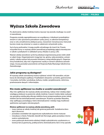 POLSKI – POLSKA Wyższa Szkoła Zawodowa Po ukończeniu szkoły średniej można nauczyć się zawodu studiując na uczelni zawodowej. Programy zostały zaprojektowane we współpracy z lokalnymi przedsiębiorstwami w celu sprostania potrzebom rynku pracy, w zakresie kompetencji oraz w celu umożliwienia zdobycia pracy. Zawartość merytoryczna i kierunek kursów może się zmieniać w czasie w zależności od potrzeb rynku. Są to kursy policealne i trwają zwykle od jednego do trzech lat. Prawie wszystkie kursy w wyższej szkole zawodowej przeplatają zajęcia teoretyczne w szkole z praktykami w zakładach pracy (Nauka w pracy, LIA). Wyższe szkoły zawodowe są formą edukacji organizowaną przez wiele szkół w całym kraju. Organizatorami mogą być np. gminy, rady powiatów, uniwersytety i szkoły wyższe lub prywatni dostawcy usług edukacyjnych. Organizatorzy kształcenia, aby móc organizować naukę w ramach szkolenia zawodowego, muszą posiadać pozwolenie od Krajowej Rady Wyższego Szkolnictwa Zawodowego. Jakie programy są dostępne? W wyższej szkole zawodowej można wybierać wśród 100 zawodów, od piekarza do dewelopera aplikacji. Przykładami obszarów są hotele, gastronomia i turystyka, technika i produkcja, kultura, media i projektowanie, rolnictwo, przetwarzanie danych i informatyka. Kto może aplikować na studia w uczelni zawodowej? Aby móc aplikować do wyższej szkoły zawodowej, należy mieć wiedzę odpowiadającą edukacji na poziomie szkoły średniej. Czasem trzeba także wykazać się specjalną wiedzą jaką oferują niektóre kursy przeprowadzane przez szkoły średnie lub też doświadczeniem zawodowym. Kryteria są bardzo liberalne, więc aplikujący posiadający różne doświadczenie i wiedzę mają możliwość spełnienia wymogów rekrutacyjnych. Możesz aplikować na wyższą szkołę zawodową, jeśli: • masz maturę ze szkoły średniej lub gminnej jednostki kształcenia dorosłych (Komvux) • posiadasz szwedzkie lub zagraniczne wykształcenie równe maturze • mieszkasz w Danii, Finlandii, Islandii lub Norwegii, gdzie posiadasz równoważne wykształcenie • masz potencjał ukończenia edukacji dzięki wykształceniu uzyskanemu w Szwecji lub za graniczną, praktycznemu doświadczeniu lub w inny sposób. POLSKI – POLSKA Wszyscy, niezależnie od wieku, są zaproszeni do aplikowania do wyższych szkół zawodowych. Istnieją jednak przepisy dotyczące wieku w zakresie pomocy dla studentów, ustalone przez Centralny Zarząd Pomocy Studentom (CSN). Czy musi się znać język szwedzki? Czy Twoim językiem ojczystym jest inny język niż szwedzki, duński, Wysp Owczych, islandzki, lub norweski? Wówczas trzeba posługiwać się językiem szwedzkim na tyle dobrze, by poradzić sobie z nauką. Szkoła zdecyduje, czy Twoje umiejętności są wystarczające. Niektóre szkoły dają dodatkowe wsparcie w zakresie języka szwedzkiego zorientowanego na zawód. Jeśli nie spełnia się wymogów formalnych Nie spełniasz wymogów formalnych w zakresie kwalifikowalności? Mimo to możesz nadal być dopuszczony do edukacji. Szkoły robią czasem wyjątki, jeśli stwierdzą, że poradzisz sobie z nauką i pracą w ramach zawodu, do którego to kształcenie prowadzi. Skontaktuj się ze szkołą i dowiedz się, jakie są wymagania. Jak aplikować? Każda szkoła prowadzi nabór na swoje kierunki we własnym zakresie. Skontaktuj się więc bezpośrednio ze szkołą, gdzie dowiesz się, jakie zasady obowiązują. W przypadku większej ilości chętnych szkoła dokona wyboru kryteriów przyjęcia, np. przez oceny, poziom wykształcenia i doświadczenia zawodowego. Można również przystąpić do sprawdzianu lub zaprezentować się w trakcie wywiadu. Nauka w trakcie pracy LIA to uczenie się w pracy i oznacza, że część nauki odbywa się w miejscu pracy. Podczas nauki będziesz rozwijać swoje umiejętności w miejscu pracy. Możesz poznać swój przyszły zawód i już w trakcie studiów nabędziesz doświadczenia zawodowego i poznasz swoją rolę zawodową. LIA pozwala na zdobycie doświadczenia, a dodatkowo kontaktów, które mogą okazać się przydatne podczas poszukiwania pracy w przyszłości. POLSKI – POLSKA Koszty i środki pomocowe Zdecydowana większość kursów na studiach zawodowych jest bezpłatna, ale są takie, które wymagają opłaty studenckiej. We wszystkich programach należy samemu zapłacić za książki i inne materiały do nauki. Zanim się zarejestrujesz, sprawdź w szkole, jakie opłaty obowiązują za dany program. Aplikując do wyższej szkoły zawodowej, masz prawo do ubiegania się o pomoc dla studentów z Centralnego Zarządu Pomocy Studentom (CSN). Punktacja w wyższych szkołach zawodowych Punktacja w wyższych szkołach zawodowych (punkty YH) określana jest przez czas trwania edukacji. Pięć punktów YH odpowiada jednemu tygodniowi nauki, w pełnym wymiarze godzin. 100 punktów YH odpowiada sześciu miesiącom nauki w pełnym wymiarze, 200 punktów YH to pełny rok akademicki i tak dalej. Przeczytaj więcej o wyższych szkołach zawodowych na stronie yrkeshogskolan.se (Krajowa Agencja Wyższego Szkolnictwa Zawodowego)