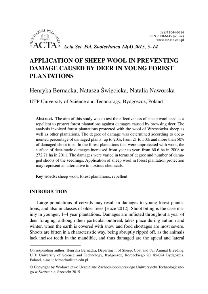 ISSN 1644-0714 ISSN 2300-6145 (online) www.asp.zut.edu.pl Acta Sci. Pol. Zootechnica 14(4) 2015, 5–14 APPLICATION OF SHEEP WOOL IN PREVENTING DAMAGE CAUSED BY DEER IN YOUNG FOREST PLANTATIONS Henryka Bernacka, Natasza Świ˛ecicka, Natalia Naworska UTP University of Science and Technology, Bydgoszcz, Poland Abstract. The aim of this study was to test the effectiveness of sheep wool used as a repellent to protect forest plantations against damages caused by browsing deer. The analysis involved forest plantations protected with the wool of Wrzosówka sheep as well as other plantations. The degree of damage was determined according to documented percentage of damaged plants: up to 20%, from 21 to 50% and more than 50% of damaged shoot tops. In the forest plantations that were unprotected with wool, the surface of deer-made damages increased from year to year, from 60.6 ha in 2008 to 272.71 ha in 2011. The damages were varied in terms of degree and number of damaged shoots of the seedlings. Application of sheep wool in forest plantation protection may represent an alternative to noxious chemicals. Key words: sheep wool, forest plantations, repellent INTRODUCTION Large populations of cervids may result in damages to young forest plantations, and also in classes of older trees [Haze 2012]. Shoot biting is the case mainly in younger, 1–4 year plantations. Damages are inflicted throughout a year of deer foraging, although their particular outbreak takes place during autumn and winter, when the earth is covered with snow and food shortages are most severe. Shoots are bitten in a characteristic way, being abruptly ripped off, as the animals lack incisor teeth in the mandible, and thus damaged are the apical and lateral Corresponding author: Henryka Bernacka, Department of Sheep, Goat and Fur Animal Breeding, UTP University of Science and Technology, Bydgoszcz, Kordeckiego 20, 85-084 Bydgoszcz, Poland, e-mail: [email protected] © Copyright by Wydawnictwo Uczelniane Zachodniopomorskiego Uniwersytetu Technologicznego w Szczecinie, Szczecin 2015 6 H. Bernacka et al. shoots as well as the leaves or needles. In older shrubs or trees, thicker shoots are crushed with the molars. Young, still poorly rooted seedlings are often plucked out with a bite [Haber 1961, Dominik 1977]. The methods of protecting forest plantations against foraging animals, according to the Forest Protection Instruction [Haze 2012], can be classified as indirect, ie. improving the living conditions of the animals, and direct ones, that is active forest protection, which – depending on the agent used – may be mechanical or chemical methods. The mechanical methods involve: − fences, which are efficient though expensive, − cutting the bark of spruce and pine to let some resin flow out, − individual tree wraps and screens made of various materials. Chemical methods include repellents or chemicals of an unpleasant smell, taste, which drive the deer away from the protected shoots. Application of chemicals, however, may involve a risk of animal poisoning. Therefore, only registered chemical repellents should be used in accordance with the instructions [Dominik 1977, Pruszyński and Wolny 2009, Haze 2012]. There is little information on sheep wool used as a protection measure against foraging deer damaging forest plantations. Forest Inspectorate Mi˛edzychód has been using this method for more than 10 years with good results. Additional advantage of wool is its relatively low price, which ranges from 3 to 6 PLN per kg. It should also be noted that this method of forest protection against animal damages is financially supported with the amount of 280 PLN per 1 ha of protected area for 1 year [Ordinance of the Ministry of Agriculture and Rural Development of 19 March 2009]. Thus, this environment-friendly method using wool to protect young shoots against animal eating may also be cost effective. It may represent an alternative to substances noxious applied for this purpose, which may harm the environment. This is especially important in terms of afforestation, when plantations are planted in new forest areas; these must be maintained in a proper condition to obtain the afforestation grant. The aim of the study was to test the effectiveness of sheep wool as a repellent used in the protection of young forest plantations against browsing by deer. MATERIAL AND METHODS We used records of the Forest Inspectorate Mi˛edzychód dealing with the measures taken in order to protect forest plantations and the area of the protected plantations. We also obtained lists of damages which depicted the size and extent of the damages in the forest plantations as a result of gnawing by deer (the entire Forest Inspectorate Mi˛edzychód). Acta Sci. Pol. Application of sheep wool in preventing damage. . . 7 The Forest Inspectorate Mi˛edzychód belongs to the Wielkopolsko-Pomorska nature-forest region, districts Kotlina Gorzowska (the area of Mi˛edzychód and Krobielewko) and Lubuskie Lakeland (area Gorzyń) [Trampler et al. 1990]. The habitat structure of the forest under the management of the Inspectorate is mainly represented by fresh coniferous forest (66.1%). The share of coniferous habitats in the Inspectorate reaches 83.8%, whereas wet, boggy habitats and alder carrs represent only 2.6%. The species composition of the forest stands is strongly dominated by the pine (91.7%). The forest stands are mostly in the class IV of age. In terms of hunting management, the Mi˛edzychód Inspectorate area is divided into 8 leased hunting districts (4 forest and 4 field). Game present in the area include mainly red deer, roe deer, wild boar and fox. The analysis involved young forest plantations protected with sheep wool and other plantations in the entire are Forestry Inspectorate Mi˛edzychód in the years 2008–2011 which were not protected, also due to high costs of such protection measures. The assumed degree of damage was in line with the damage doc