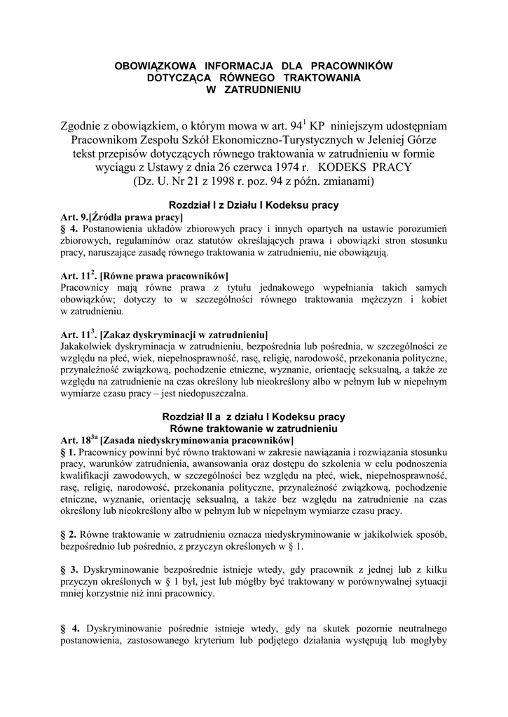 OBOWIĄZKOWA INFORMACJA DLA PRACOWNIKÓW DOTYCZĄCA RÓWNEGO TRAKTOWANIA W ZATRUDNIENIU Zgodnie z obowiązkiem, o którym mowa w art. 941 KP niniejszym udostępniam Pracownikom Zespołu Szkół Ekonomiczno-Turystycznych w Jeleniej Górze tekst przepisów dotyczących równego traktowania w zatrudnieniu w formie wyciągu z Ustawy z dnia 26 czerwca 1974 r. KODEKS PRACY (Dz. U. Nr 21 z 1998 r. poz. 94 z późn. zmianami) Rozdział I z Działu I Kodeksu pracy Art. 9.[Źródła prawa pracy] § 4. Postanowienia układów zbiorowych pracy i innych opartych na ustawie porozumień zbiorowych, regulaminów oraz statutów określających prawa i obowiązki stron stosunku pracy, naruszające zasadę równego traktowania w zatrudnieniu, nie obowiązują. Art. 112. [Równe prawa pracowników] Pracownicy mają równe prawa z tytułu jednakowego wypełniania takich samych obowiązków; dotyczy to w szczególności równego traktowania mężczyzn i kobiet w zatrudnieniu. Art. 113. [Zakaz dyskryminacji w zatrudnieniu] Jakakolwiek dyskryminacja w zatrudnieniu, bezpośrednia lub pośrednia, w szczególności ze względu na płeć, wiek, niepełnosprawność, rasę, religię, narodowość, przekonania polityczne, przynależność związkową, pochodzenie etniczne, wyznanie, orientację seksualną, a także ze względu na zatrudnienie na czas określony lub nieokreślony albo w pełnym lub w niepełnym wymiarze czasu pracy – jest niedopuszczalna. Rozdział II a z działu I Kodeksu pracy Równe traktowanie w zatrudnieniu 3a Art. 18 [Zasada niedyskryminowania pracowników] § 1. Pracownicy powinni być równo traktowani w zakresie nawiązania i rozwiązania stosunku pracy, warunków zatrudnienia, awansowania oraz dostępu do szkolenia w celu podnoszenia kwalifikacji zawodowych, w szczególności bez względu na płeć, wiek, niepełnosprawność, rasę, religię, narodowość, przekonania polityczne, przynależność związkową, pochodzenie etniczne, wyznanie, orientację seksualną, a także bez względu na zatrudnienie na czas określony lub nieokreślony albo w pełnym lub w niepełnym wymiarze czasu pracy. § 2. Równe traktowanie w zatrudnieniu oznacza niedyskryminowanie w jakikolwiek sposób, bezpośrednio lub pośrednio, z przyczyn określonych w § 1. § 3. Dyskryminowanie bezpośrednie istnieje wtedy, gdy pracownik z jednej lub z kilku przyczyn określonych w § 1 był, jest lub mógłby być traktowany w porównywalnej sytuacji mniej korzystnie niż inni pracownicy. § 4. Dyskryminowanie pośrednie istnieje wtedy, gdy na skutek pozornie neutralnego postanowienia, zastosowanego kryterium lub podjętego działania występują lub mogłyby wystąpić niekorzystne dysproporcje albo szczególnie niekorzystna sytuacja w zakresie nawiązania i rozwiązania stosunku pracy, warunków zatrudnienia, awansowania oraz dostępu do szkolenia w celu podnoszenia kwalifikacji zawodowych wobec wszystkich lub znacznej liczby pracowników należących do grupy wyróżnionej ze względu na jedną lub kilka przyczyn określonych w § 1, chyba że postanowienie, kryterium lub działanie jest obiektywnie uzasadnione ze względu na zgodny z prawem cel, który ma być osiągnięty, a środki służące osiągnięciu tego celu są właściwe i konieczne. § 5. Przejawem dyskryminowania w rozumieniu § 2 jest także: 1) działanie polegające na zachęcaniu innej osoby do naruszenia zasady równego traktowania w zatrudnieniu lub nakazaniu jej naruszenia tej zasady. 2) niepożądane zachowanie, którego celem lub skutkiem jest naruszenie godności pracownika i stworzenie wobec niego zastraszającej, wrogiej, poniżającej, upokarzającej lub uwłaczającej atmosfery (molestowanie). § 6. Dyskryminowaniem ze względu na płeć jest także każde niepożądane zachowanie o charakterze seksualnym lub odnoszące się do płci pracownika, którego celem lub skutkiem jest naruszenie godności pracownika, w szczególności stworzenie wobec niego zastraszającej, wrogiej, poniżającej, upokarzającej lub uwłaczającej atmosfery; na zachowanie to mogą się składać fizyczne, werbalne lub pozawerbalne elementy (molestowanie seksualne). § 7. Podporządkowanie się przez pracownika molestowaniu lub molestowaniu seksualnemu, a także podjęcie przez niego działań przeciwstawiających się molestowaniu lub molestowaniu seksualnemu nie może powodować jakichkolwiek negatywnych konsekwencji wobec pracownika. Art. 183b[Naruszenie zasady równego traktowania] § 1. Za naruszenie zasady równego traktowania w zatrudnieniu, z zastrzeżeniem § 2–4, uważa się różnicowanie przez pracodawcę sytuacji pracownika z jednej lub kilku przyczyn określonych w art. 183a § 1, którego skutkiem jest w szczególności: 1) odmowa nawiązania lub rozwiązanie stosunku pracy, 2) niekorzystne ukształtowanie wynagrodzenia za pracę lub innych warunków zatrudnienia albo pominięcie przy awansowaniu lub przyznawaniu innych świadczeń związanych z pracą, 3) pominięcie przy typowaniu do udziału w szkoleniach podnoszących kwalifikacje zawodowe – chyba że pracodawca udowodni, że kierował się obiektywnymi powodami. § 2. Zasady równego traktowania w zatrudnieniu nie naruszają działania polegające na: 1) niezatrudnianiu pracownika z jednej lub kilku przyczyn określonych w art. 183a §1, jeżeli jest to uzasadnione ze względu na rodzaj pracy, warunki jej wykonywania lub wymagania zawodowe stawiane pracownikom, 2) wypowiedzeniu pracownikowi warunków zatrudnienia w zakresie wymiaru czasu pracy, jeżeli jest to uzasadnione przyczynami niedotyczącymi pracowników, 3) stosowaniu środków, które różnicują sytuację prawną pracownika ze względu na ochronę rodzicielstwa, wiek lub niepełnosprawność pracownika, 4) ustalaniu warunków zatrudniania i zwalniania pracowników, zasad wynagradzania i awansowania oraz dostępu do szkolenia w celu podnoszenia kwalifikacji zawodowych – z uwzględnieniem kryterium stażu pracy. § 3. Nie stanow