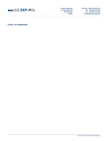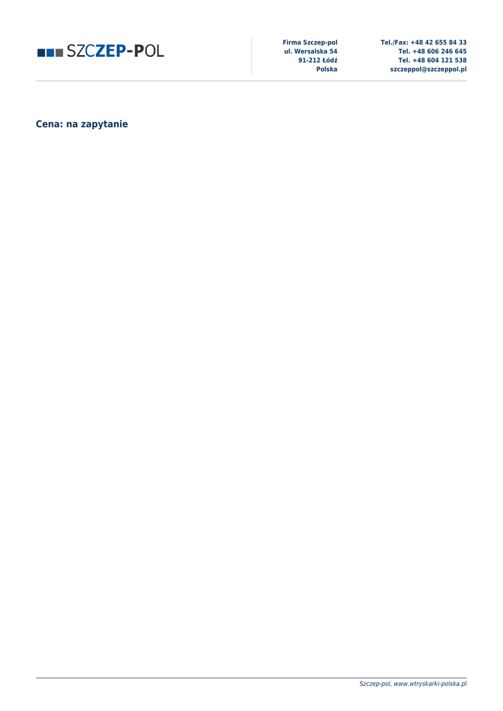 Firma Szczep-pol ul. Wersalska 54 91-212 Łódź Polska Tel./Fax: +48 42 655 84 33 Tel. +48 606 246 645 Tel. +48 604 121 538 [email protected] Cena: na zapytanie Szczep-pol, www.wtryskarki-polska.pl