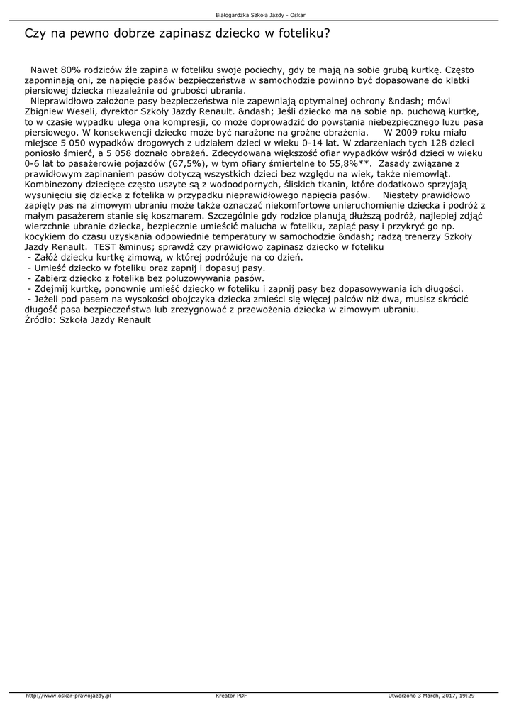 Białogardzka Szkoła Jazdy - Oskar Czy na pewno dobrze zapinasz dziecko w foteliku? Nawet 80% rodziców źle zapina w foteliku swoje pociechy, gdy te mają na sobie grubą kurtkę. Często zapominają oni, że napięcie pasów bezpieczeństwa w samochodzie powinno być dopasowane do klatki piersiowej dziecka niezależnie od grubości ubrania. Nieprawidłowo założone pasy bezpieczeństwa nie zapewniają optymalnej ochrony – mówi Zbigniew Weseli, dyrektor Szkoły Jazdy Renault. – Jeśli dziecko ma na sobie np. puchową kurtkę, to w czasie wypadku ulega ona kompresji, co może doprowadzić do powstania niebezpiecznego luzu pasa piersiowego. W konsekwencji dziecko może być narażone na groźne obrażenia. W 2009 roku miało miejsce 5 050 wypadków drogowych z udziałem dzieci w wieku 0-14 lat. W zdarzeniach tych 128 dzieci poniosło śmierć, a 5 058 doznało obrażeń. Zdecydowana większość ofiar wypadków wśród dzieci w wieku 0-6 lat to pasażerowie pojazdów (67,5%), w tym ofiary śmiertelne to 55,8%**. Zasady związane z prawidłowym zapinaniem pasów dotyczą wszystkich dzieci bez względu na wiek, także niemowląt. Kombinezony dziecięce często uszyte są z wodoodpornych, śliskich tkanin, które dodatkowo sprzyjają wysunięciu się dziecka z fotelika w przypadku nieprawidłowego napięcia pasów. Niestety prawidłowo zapięty pas na zimowym ubraniu może także oznaczać niekomfortowe unieruchomienie dziecka i podróż z małym pasażerem stanie się koszmarem. Szczególnie gdy rodzice planują dłuższą podróż, najlepiej zdjąć wierzchnie ubranie dziecka, bezpiecznie umieścić malucha w foteliku, zapiąć pasy i przykryć go np. kocykiem do czasu uzyskania odpowiednie temperatury w samochodzie – radzą trenerzy Szkoły Jazdy Renault. TEST − sprawdź czy prawidłowo zapinasz dziecko w foteliku - Załóż dziecku kurtkę zimową, w której podróżuje na co dzień. - Umieść dziecko w foteliku oraz zapnij i dopasuj pasy. - Zabierz dziecko z fotelika bez poluzowywania pasów. - Zdejmij kurtkę, ponownie umieść dziecko w foteliku i zapnij pasy bez dopasowywania ich długości. - Jeżeli pod pasem na wysokości obojczyka dziecka zmieści się więcej palców niż dwa, musisz skrócić długość pasa bezpieczeństwa lub zrezygnować z przewożenia dziecka w zimowym ubraniu. Źródło: Szkoła Jazdy Renault http://www.oskar-prawojazdy.pl Kreator PDF Utworzono 3 March, 2017, 19:29