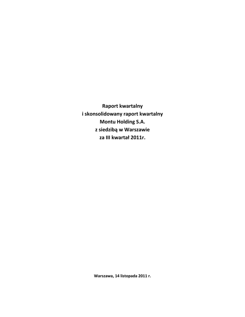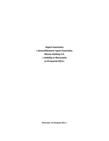 Raport kwartalny i skonsolidowany raport kwartalny Montu Holding S.A. z siedzibą w Warszawie za III kwartał 2011r. Warszawa, 14 listopada 2011 r. 1. Dane Spółki Podstawowe informacje Nazwa (firma) Nazwa skrócona Forma prawna Kraj siedziby Siedziba Adres Montu Holding Spółka Akcyjna Montu Holding S.A. spółka akcyjna Polska Warszawa 00-203 Warszawa, ul. Bonifraterska 17 Telefon + 48 22 614 59 75 Faks + 48 22 614 26 22 Adres poczty elektronicznej Adres głównej strony internetowej [email protected] www.montu.pl Identyfikator wg właściwej klasyfikacji statystycznej REGON: 141800547 Numer wg właściwej identyfikacji podatkowej NIP: 525-245-37-55 2. Osoby zarządzające i nadzorujące Na dzieo sporządzenia niniejszego sprawozdania skład Zarządu jest następujący: Pan Piotr Łysiak – Prezes Zarządu Na dzieo sporządzenia niniejszego sprawozdania skład Rady Nadzorczej jest następujący: Pan Klaudiusz Sytek – Przewodniczący Rady Nadzorczej, Pan Tadeusz Piętka – Wiceprzewodniczący Rady Nadzorczej, Pan Rafał Bednarczyk – Członek Rady Nadzorczej, Pan Paweł Miller – Członek Rady Nadzorczej, Pan Robert Rajewski – Członek Rady Nadzorczej. Raport kwartalny i skonsolidowany raport kwartalny Montu Holding S.A. za III kwartał 2011 roku Strona 2 z 6 3. Informacja o stanie majątkowym i sytuacji finansowej spółki. Jednostkowe informacje finansowe za 3 kwartał 2011 roku 1) Wybrane dane finansowe jednostkowe, zgodnie z wymaganiami zawartymi w Załączniku nr 3 do Regulaminu ASO - § 5 Raporty kwartalne. Wybrane dane finansowe z bilansu zł a kapitał własny b należności długoterminowe c należności krótkoterminowe środki pieniężne i inne aktywa d pieniężne e zobowiązania długoterminowe f zobowiązania krótkoterminowe na 31.09.2011 514.914,10 241.666,64 28.160,24 na 31.09.2010 27.873,45 0,00 4.464,86 114.141,69 35.039,94 0,00 29.054,47 0,00 11.631,35 za 3 kwartał 2011 roku 0,00 100,00 -34.590,04 za 3 kwartał 2010 roku 0,00 0,00 0,00 -34.591,12 0,00 -34.270,91 -34.270,91 0,00 0,00 Wybrane dane finansowe z rachunku zysków i strat zł g amortyzacja h przychody netto ze sprzedaży i zysk/strata na sprzedaży zysk/strata na działalności j operacyjnej k zysk/strata brutto l zysk/strata netto Wybrane dane finansowe z rachunku zysków i strat (narastająco) zł g amortyzacja h przychody netto ze sprzedaży i zysk/strata na sprzedaży zysk/strata na działalności j operacyjnej k zysk/strata brutto l zysk/strata netto za 3 kwartały za 3 kwartały 2011 roku 2010 roku 0,00 0,00 300,00 0,00 -104.535,36 0,00 -105.938,68 0,00 -105.615,20 -105.615,20 0,00 0,00 Raport kwartalny i skonsolidowany raport kwartalny Montu Holding S.A. za III kwartał 2011 roku Strona 3 z 6 2) Komentarz Zarządu Emitenta na temat czynników i zdarzeo, które miały wpływ na osiągnięte wyniki finansowe Strata brutto wynika z kosztów jakie Spółka wygenerowała w związku z nabyciem Montu Sp. z o.o. oraz organizacją WZ i procesu wejścia na NewConnect (koszty prawników, notariuszy, opłaty sądowe, itp.) Koszty obsługi prawnej wyniosły ok. 30 tys. zł, koszty obsługi księgowej wyniosły ok. 5 tys. zł, koszty wynajmu siedziby Spółki wyniosły ok. 20 tys. zł, koszty funkcjonowania na rynku publicznym (opłaty KDPW, GPW, itp.) wyniosły ok. 30 tys. zł oraz koszty notariuszy wyniosły ok. 5 tys. zł. Były to główne pozycje kosztowe w Spółce. Zarząd prognozuje, że w IV kwartale 2011 r. koszty operacyjne Spółki powinny ulec znacznemu obniżeniu ze względu na zakooczone procesy związane z nabyciem Spółki zależnej oraz wejściem na rynek New Connect. 3) Informacje Zarządu Emitenta na temat aktywności, jaką w okresie objętym raportem Emitent podejmował w obszarze rozwoju prowadzonej działalności, w szczególności poprzez działania nastawione na wprowadzenie rozwiązao innowacyjnych w przedsiębiorstwie 16 marca 2011 r. nastąpił zakup 3.400 udziałów w Montu Sp. z o.o. (stanowiących 100 % kapitału zakładowego) przez Montu Holding S.A. (wtedy pod nazwą Advicone S.A.) za kwotę 170 tys. zł od Ketys Investments Sp. z o.o. (1.700 udziałów) oraz P. Krystyny Katarzyny Pietki (1.700 udziałów). Spółka, będąc spółką holdingową nie prowadzi aktywnej działalności operacyjnej. Zarząd Spółki główną uwagę koncentruje na budowie grupy firm świadczących usługi z zakresu bezpieczeostwa dla podmiotów biznesowych (B2B). W związku z tym, - realizując strategię rozwoju Grupy Spółka w dniu 28 października 2011 r. podpisała list intencyjny na zakup pakietu udziałów w podmiocie gospodarczym świadczącym usługi ochroniarskie oraz konwojowania gotówki (Emitent informował o tym raportem bieżącym nr 19/2011 z dnia 28 października 2011 r.). Skonsolidowane informacje finansowe za 3 kwartał 2011 roku 1) Wybrane dane finansowe zgodnie z wymaganiami zawartymi w Załączniku nr 3 do Regulaminu ASO - § 5 Raporty kwartalne. Wybrane dane finansowe z bilansu zł a kapitał własny b należności długoterminowe c należności krótkoterminowe środki pieniężne i inne aktywa d pieniężne e zobowiązania długoterminowe f zobowiązania krótkoterminowe na 31.09.2011 -12.972,60 241.666,64 120.626,87 na 31.09.2010 -50.919,43 0,00 20.810,11 114.769,27 35.194,70 241.666,64 455.189,72 0,00 108.090,93 Raport kwartalny i skonsolidowany raport kwartalny Montu Holding S.A. za III kwartał 2011 roku Strona 4 z 6 Wybrane dane finansowe z rachunku zysków i strat zł g amortyzacja h przychody netto ze sprzedaży i zysk/strata na sprzedaży zysk/strata na działalności j operacyjnej k zysk/strata brutto l zysk/strata netto za 3 kwartał za 3 kwartał 2011 roku 2010 roku 1.146,30 0,00 96.440,03 6.730,34 -200.113,53 -19.446,19 -200.596,07 -19.516,96 -207.223,09 -207.223,09 -19.516,96 -19.516,96 Wybrane dane finansowe z rachunku zysków i strat (narastająco) zł g amortyzacja h przychody netto ze sprzedaży i zysk/strata na sprzedaży zysk/strata na działalno