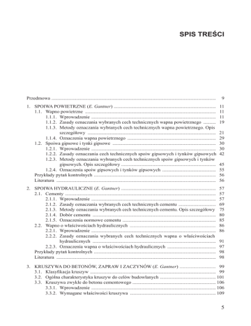 SPIS TREŚCI Przedmowa .................................................................................................................................... 9 1. SPOIWA POWIETRZNE (E. Gantner) .................................................................................. 1.1. Wapno powietrzne ......................................................................................................... 1.1.1. Wprowadzenie .................................................................................................... 1.1.2. Zasady oznaczania wybranych cech technicznych wapna powietrznego .......... 1.1.3. Metody oznaczania wybranych cech technicznych wapna powietrznego. Opis szczegółowy ....................................................................................................... 1.1.4. Oznaczenia wapna powietrznego ....................................................................... 1.2. Spoiwa gipsowe i tynki gipsowe ................................................................................... 1.2.1. Wprowadzenie .................................................................................................... 1.2.2. Zasady oznaczania cech technicznych spoiw gipsowych i tynków gipsowych 1.2.3. Metody oznaczania wybranych cech technicznych spoiw gipsowych i tynków gipsowych. Opis szczegółowy ............................................................................ 1.2.4. Oznaczenia spoiw gipsowych i tynków gipsowych ........................................... Przykłady pytań kontrolnych .................................................................................................. Literatura ................................................................................................................................ 11 11 11 19 2. SPOIWA HYDRAULICZNE (E. Gantner) ............................................................................ 2.1. Cementy ......................................................................................................................... 2.1.1. Wprowadzenie .................................................................................................... 2.1.2. Zasady oznaczania wybranych cech technicznych cementu .............................. 2.1.3. Metody oznaczania wybranych cech technicznych cementu. Opis szczegółowy 2.1.4. Dobór cementu ................................................................................................... 2.1.5. Oznaczenia normowe cementu ........................................................................... 2.2. Wapno o właściwościach hydraulicznych ..................................................................... 2.2.1. Wprowadzenie .................................................................................................... 2.2.2. Zasady oznaczania wybranych cech technicznych wapna o właściwościach hydraulicznych ................................................................................................... 2.2.3. Oznaczenia wapna o właściwościach hydraulicznych ....................................... Przykłady pytań kontrolnych .................................................................................................. Literatura ................................................................................................................................ 21 29 30 30 42 45 55 56 56 57 57 57 69 75 80 85 86 86 91 97 98 98 3. KRUSZYWA DO BETONÓW, ZAPRAW I ZACZYNÓW (E. Gantner) ............................. 99 3.1. Klasyfikacja kruszyw ..................................................................................................... 99 3.2. Ogólna charakterystyka kruszyw do celów budowlanych ............................................. 101 3.3. Kruszywa zwykłe do betonu cementowego ................................................................... 106 3.3.1. Wprowadzenie .................................................................................................... 106 3.3.2. Wymagane właściwości kruszywa ..................................................................... 109 5 3.4. Kruszywa lekkie do betonu cementowego .................................................................... 116 3.5. Kruszywa do zapraw i zaczynów ................................................................................... 121 3.5.1. Wprowadzenie .................................................................................................... 121 3.5.2. Wymagania normowe ......................................................................................... 122 Literatura ................................................................................................................................ 127 4. BADANIA KRUSZYW (E. Gantner) .................................................................................... 128 4.1. Pobieranie próbek kruszyw do badań ............................................................................ 128 4.2. Zasady badania wybranych cech technicznych kruszyw ............................................... 131 4.3. Wybrane metody badania kruszyw. Opis szczegółowy ................................................. 137 4.3.1. Analiza sitowa .................................................................................................... 137 4.3.2. Oznaczanie gęstości ziaren i nasiąkliwości kruszyw zwykłych ......................... 142 4.3.3. Oznaczanie gęstości wstępnie osuszonych ziaren kruszywa .............................. 146 4.3.4. Oznaczanie gęstości ziaren i nasiąkliwości kruszyw lekkich ............................. 148 4.3.5. Oznaczanie wskaźnika kształtu .......................................................................... 149 4.3.6. Oznaczanie gęstości nasypowej i jamistości ...................................................... 153 4.3.7. Oznaczanie odporności na miażdżenie kruszyw o gęstości nasypowej większej niż 150 kg/m3 .....................