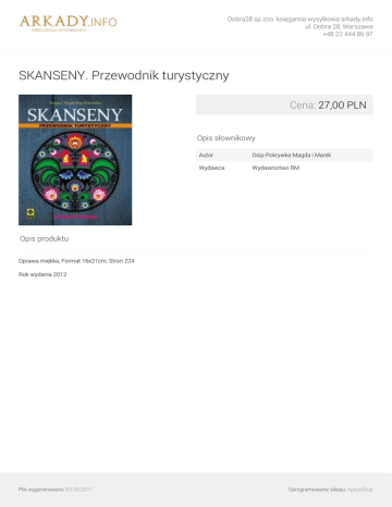 Dobra28 sp zoo. księgarnia wysyłkowa arkady.info ul. Dobra 28, Warszawa +48 22 444 86 97 SKANSENY. Przewodnik turystyczny Cena: 27,00 PLN Opis słownikowy Autor Osip-Pokrywka Magda i Marek Wydawca Wydawnictwo RM Opis produktu Oprawa miękka, Format 16x21cm, Stron 224 Rok wydania 2012 Plik wygenerowano: 03-03-2017 Powered by TCPDF (www.tcpdf.org) Oprogramowanie sklepu: AptusShop