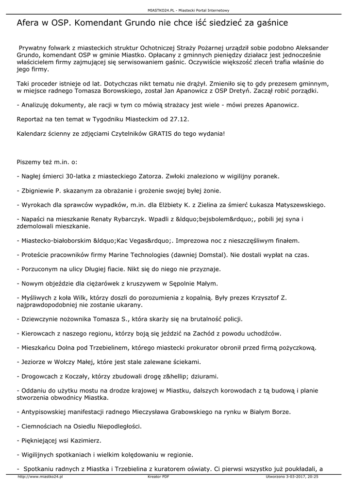MIASTKO24.PL - Miastecki Portal Internetowy Afera w OSP. Komendant Grundo nie chce iść siedzieć za gaśnice Prywatny folwark z miasteckich struktur Ochotniczej Straży Pożarnej urządził sobie podobno Aleksander Grundo, komendant OSP w gminie Miastko. Opłacany z gminnych pieniędzy działacz jest jednocześnie właścicielem firmy zajmującej się serwisowaniem gaśnic. Oczywiście większość zleceń trafia właśnie do jego firmy. Taki proceder istnieje od lat. Dotychczas nikt tematu nie drążył. Zmieniło się to gdy prezesem gminnym, w miejsce radnego Tomasza Borowskiego, został Jan Apanowicz z OSP Dretyń. Zaczął robić porządki. - Analizuję dokumenty, ale racji w tym co mówią strażacy jest wiele - mówi prezes Apanowicz. Reportaż na ten temat w Tygodniku Miasteckim od 27.12. Kalendarz ścienny ze zdjęciami Czytelników GRATIS do tego wydania! Piszemy też m.in. o: - Nagłej śmierci 30-latka z miasteckiego Zatorza. Zwłoki znaleziono w wigilijny poranek. - Zbigniewie P. skazanym za obrażanie i grożenie swojej byłej żonie. - Wyrokach dla sprawców wypadków, m.in. dla Elżbiety K. z Zielina za śmierć Łukasza Matyszewskiego. - Napaści na mieszkanie Renaty Rybarczyk. Wpadli z “bejsbolem”, pobili jej syna i zdemolowali mieszkanie. - Miastecko-białoborskim “Kac Vegas”. Imprezowa noc z nieszczęśliwym finałem. - Proteście pracowników firmy Marine Technologies (dawniej Domstal). Nie dostali wypłat na czas. - Porzuconym na ulicy Długiej fiacie. Nikt się do niego nie przyznaje. - Nowym objeździe dla ciężarówek z kruszywem w Sępolnie Małym. - Myśliwych z koła Wilk, którzy doszli do porozumienia z kopalnią. Były prezes Krzysztof Z. najprawdopodobniej nie zostanie ukarany. - Dziewczynie nożownika Tomasza S., która skarży się na brutalność policji. - Kierowcach z naszego regionu, którzy boją się jeździć na Zachód z powodu uchodźców. - Mieszkańcu Dolna pod Trzebielinem, którego miastecki prokurator obronił przed firmą pożyczkową. - Jeziorze w Wołczy Małej, które jest stale zalewane ściekami. - Drogowcach z Koczały, którzy zbudowali drogę z… dziurami. - Oddaniu do użytku mostu na drodze krajowej w Miastku, dalszych korowodach z tą budową i planie stworzenia obwodnicy Miastka. - Antypisowskiej manifestacji radnego Mieczysława Grabowskiego na rynku w Białym Borze. - Ciemnościach na Osiedlu Niepodległości. - Piękniejącej wsi Kazimierz. - Wigilijnych spotkaniach i wielkim kolędowaniu w regionie. - Spotkaniu radnych z Miastka i Trzebielina z kuratorem oświaty. Ci pierwsi wszystko już poukładali, a http://www.miastko24.pl Kreator PDF Utworzono 3-03-2017, 20:25 MIASTKO24.PL - Miastecki Portal Internetowy drudzy w ostrych słowach sprzeciwiają się reformie szkolnictwa, bo doprowadzi do zamknięcia szkoły w Starkowie. - Juniorach Startu Miastko. Zdjęcia grupowe piłkarzy i wywiad z prezesem klubu Janem Ponulakiem. - Strajku z 1988 r. w miasteckiej Fabryce Rękawiczek i Odzieży Skórzanej oraz w przetwórni runa leśnego w Trzebielinie. - Podsumowaniu programu “Aktywny senior” w gm. Biały Bór. - Radnym Jerzym Walczyńskim, który dla Koczały jest jak… Jacek Kaczmarski. To lokalny bard. - Szansie utworzenia klas sportowych o profilu zapasy i badminton w Miastku. - Ponadto wiele innych wydarzeń, interwencji oraz spraw kulturalnych i sportowych z gmin Miastko, Koczała, Biały Bór i Trzebielino, krzyżówka, horoskop, ogłoszenia drobne, ogłoszenia matrymonialne, prognoza pogody i felietony. Zapraszamy http://www.miastko24.pl Kreator PDF Utworzono 3-03-2017, 20:25