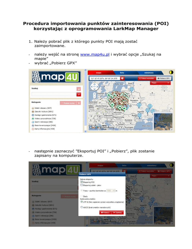 Procedura importowania punktów zainteresowania (POI) korzystając z oprogramowania LarkMap Manager 1. Należy pobrać plik z którego punkty POI mają zostać zaimportowane. - - należy wejść na stronę www.map4u.pl i wybrać opcje „Szukaj na mapie” wybrać „Pobierz GPX” następnie zaznaczyć ”Eksportuj POI” i „Pobierz”, plik zostanie zapisany na komputerze. 2. Z głównego menu LarkMap Manager, wybieramy opcje „Importuj POI” i klikamy „Dalej” 3. Kolejnym krokiem jest wybranie pliku poi-pl-k0.gpx ,który został zapisany na komputerze. Po wybraniu odpowiedniego pliku klikamy „Dalej”. 4. Następnie możemy wybrać dokładnie POI chcemy wgrać do aplikacji. Domyślnie zaznaczone są wszystkie Do wyboru użytkownika pozostaje wybranie POI z interesującej go kategorii lub zawierających tylko multimedia(zdjęcia, pliki dźwiękowe). W części „Dodatkowe opcje pobierania” użytkownik może zdefiniować czy chce pobierać multimedia(pliki graficzne, pliki dźwiękowe). Punkty zainteresowania posiadające: • pliki graficzne oznaczone są symbolem zdjęcia, • pliki dźwiękowe oznaczone są symbolem nuty, • pliki graficzne i dźwiękowe oznaczone są symbolem zdjęcia i nuty. Po zaznaczeniu wybranych punktów klikamy „Dalej”. 5. Należy wybrać lokalizację zainstalowanej aplikacji. • Jeśli urządzenie podłączone jest w trybie ActiveSync należy wybrać miejsce instalacji „ActiveSync” i wskazać odpowiednią pamięć. • Jeśli podłączona jest karta należy wybrać opcje „Dysk Wymienny”. Następnie kliknąć „Dalej”. 6. Następuje importowanie i instalowanie POI. Jeżeli operacja wykona się poprawnie zostanie wyświetlony komunikat „Instalacja zakończona prawidłowo”, a instalator przejdzie do menu głównego.