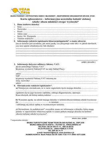 BIURO PODRÓŻY I WYPOCZYNKU DZIECI I MŁODZIEŻY – BEZPOŚREDNI ORGANIZATOR NR.KON. 0122 Karta zgłoszeniowo – informacyjna uczestnika kolonii/ zielonej szkoły/ obozu młodzież owego/ wycieczki* 1. Dane osobowe dziecka: • Imię: ..................................................................................................................................... • Nazwisko: ............................................................................................................................ • Pesel: .................................................................................................................................... • Adres zam: ........................................................................................................................... • Seria i Nr. Paszportu ............................................................................................................ • Telefon rodziców: ................................................................................................................ 2. Informacje rodziców/opiekunów/lekarza/pielęgniarki* o stanie zdrowia: (na co dziecko jest uczulone, jak znosi jazdę, czy przyjmuje stałe leki i w jakich dawkach, czy nosi aparat ortodontyczny lub okulary) ................................................................................................................................................. ................................................................................................................................................. ................................................................................................................................................. ................................................................................................................................................. ..................................... podpis ( pieczątka ) 3. Informacje dotyczce odbiorcy faktury VAT: a) nie potrzebuje Faktury VAT b) proszę wystawić FakturęVAT na mój Zakład Pracy: ............................................................................................................................................ adres: ....................................................................................................................................... NIP: ......................................................................................................................................... c) proszę wystawić Fakturę VAT imienną na: imię, nazwisko: ....................................................................................................................... adres: ....................................................................................................................................... 4. Oświadczenie rodziców/opiekunów*. a) Niniejszym oświadczam, że w razie zagrożenia życia mojego dziecka.............................. ................................................................................................................................................. zgadzam się na jego leczenie szpitalne, zabiegi diagnostyczne, operacje. Kasa chorych, do której należą rodzice: ................................................................................. b) Wyrażam zgodę na udział mojego dziecka w kolonii/obozie/zielonej szkole/wycieczce do ......................................................w terminie .................................................................... i deklaruję się uiścić opłatę w wyznaczonym terminie. c) Stwierdzam, że podałem/am* wszystkie znane mi informacje o dziecku, które mogą pomóc w zapewnieniu właściwej opieki w czasie pobytu mojego dziecka na kolonii/ obozie/zielonej szkole/wycieczce*. .......................................................... miasto, data , podpis * niepotrzebne skreślić BIURO TURYSTYCZNE TEAM TOUR 99-300 KUTNO AL. ZHP 2/39 BIURO OBSŁUGI KLIENTA – KUTNO UL. KRÓLEWSKA 47 TEL/FAX +48 24 355 41 71, 609 34 88 83 FILIA PŁOCK UL. JANA PAWŁA II 37/30 TEL 605 26 74 77 e-mail: [email protected], www.teamtour.pl NUMER KONTA: Bank Pekao SA 04 1240 1734 1111 0000 1075 3206