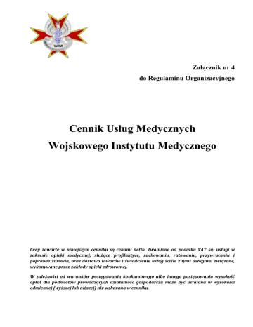 Załącznik nr 4 do Regulaminu Organizacyjnego Cennik Usług Medycznych Wojskowego Instytutu Medycznego Ceny zawarte w niniejszym cenniku są cenami netto. Zwolnione od podatku VAT są: usługi w zakresie opieki medycznej, służące profilaktyce, zachowaniu, ratowaniu, przywracaniu i poprawie zdrowia, oraz dostawa towarów i świadczenie usług ściśle z tymi usługami związane, wykonywane przez zakłady opieki zdrowotnej. W zależności od warunków postępowania konkursowego albo innego postępowania wysokość opłat dla podmiotów prowadzących działalność gospodarczą może być ustalana w wysokości odmiennej (wyższej lub niższej) niż wskazana w cenniku. Spis treści koszty ogólne 1 dnia pobytu cennik konsultacji pakiet badań do operacji koszty znieczuleń Klinika Dermatologiczna Klinika Pediatrii, Nefrologii i Alergologii Dziecięcej Klinika Okulistyki Klinika Otolaryngologii i Onkologii Laryngologicznej z Klinicznym Oddziałem Chirurgii Czaszkowo - Twarzowo - Szczękowej Kliniczny Oddział Chirurgii Czaszkowo - Twarzowo - Szczękowej Klinika Kardiochirurgii Klinika Kardiologii i Chorób Wewnętrznych Klinika Chorób Wewnętrznych, Pneumonologii, Alergologii i Immunologii Klinicznej Klinika Chirurgii Naczyniowej i Endowaskularnej Klinika Chorób Wewnętrznych i Hematologii Klinika Gastroenterologii Klinika Chirurgii Ogólnej, Onkologicznej, Metabolicznej i Torakochirurgii Klinika Urologii Ogólnej, Czynnościowej i Onkologicznej Klinika Ginekologii i Ginekologii Onkologicznej Klinika Onkologii Klinika Endokrynologii i Terapii Izotopowej Klinika Chorób Wewnętrznych i Reumatologii Klinika Neurochirurgii Klinika Ortopedii Klinika Traumatologii i Ortopedii Oddział Zakażeń Narządu Ruchu Klinika Neurologiczna Klinika Psychiatrii, Stresu Bojowego i Psychotraumatologii Klinika Rehabilitacji Klinika Chorób Infekcyjnych i Alergologii Klinika Chorób Wewnętrznych , Nefrologii i Dializoterapii Oddział Kliniczny Chirurgii Plastycznej, Rekonstrukcyjnej i Leczenia Oparzeń Szpitalny Oddział Ratunkowy Zakład Medycyny Nuklearnej Zakład Radiologii Lekarskiej Zakład Patomorfologii Zakład Transfuzjologii Klinicznej Zakład Diagnostyki Laboratoryjnej Ambulatorium Medycyny Pracy Opłaty za transport sanitarny zlecony przez lekarza załącznik nr 1 - Wartość świadczeń szpitalnych w Centralnym Szpitalu Klinicznym MON WIM załącznik nr 2 - Wartość świadczeń ambulatoryjnych w Centralnym Szpitalu Klinicznym MON WIM Cennik Usług Medycznych Wojskowego Instytutu Medycznego str. str. str. str. str. str. str. 3 4 4 4 5 6 7 str. 12 str. str. str. 14 17 17 str. 19 str. str. str. str. str. str. str. str. str. str. str. str. str. str. str. str. str. str. 20 21 23 24 26 29 31 31 32 32 34 37 43 44 45 46 47 48 str. 49 str. str. str. str. str. str. str. str. 51 52 53 59 61 64 71 71 str. 73 str. 74 strona 2 Koszty ogólne jednego dnia pobytu Lp. Nazwa kliniki Cena Standardowe: 1 Klinika Dermatologiczna 2 Klinika Pediatrii, Nefrologii i Alergologii Dziecięcej 3 Klinika Okulistyki 400 zł 400 zł 500 zł Klinika Otolaryngologii i Onkologii Laryngologicznej z Klinicznym Oddziałem Chirurgii Czaszkowo - Twarzowo - Szczękowej 500 zł 11 Kliniczny Oddział Chirurgii Czaszkowo - Twarzowo - Szczękowej Klinika Kardiologii i Chorób Wewnętrznych Klinika Kardiochirurgii Klinika Chorób Wewnętrznych Pneumonologii i Alergologii Klinika Chirurgii Naczyniowej i Endowaskularnej Klinika Chorób Wewnętrznych i Hematologii Klinika Gastroenterologii 500 zł 400 zł 800 zł 400 zł 500 zł 400 zł 400 zł 12 Klinika Chirurgii Ogólnej, Onkologicznej, Metabolicznej i Torakochirurgii 500 zł 4 5 6 7 8 9 10 Klinika Urologii Ogólnej, Czynnościowej i Onkologicznej 14 Klinika Ginekologii i Ginekologii Onkologicznej 15 Klinika Onkologii 16 Klinika Endokrynologii i Terapii Izotopowej 500 zł 500 zł 400 zł 400 zł 13 17 18 19 20 21 22 23 24 25 26 27 28 Klinika Endokrynologii i Terapii Izotopowej (koszt tylko dla pacjentów z nowotworami neuroendokrynnymi) 600 zł Klinika Chorób Wewnętrznych i Reumatologii Klinika Neurochirurgii Klinika Ortopedii Klinika Traumatologii i Ortopedii Oddział Zakażeń Narządu Ruchu Klinika Neurologiczna 400 zł 500 zł 500 zł 500 zł 500 zł 400 zł Klinika Psychiatrii, Stresu Bojowego i Psychotraumatologii (osobodzień diagnostyczno – psychoterapeutyczny) Klinika Psychiatrii, Stresu Bojowego i Psychotraumatologii Dzienny Oddział Zaburzeń Nerwicowych (osobodzień diagnostyczno – psychoterapeutyczny) Klinika Rehabilitacji Klinika Chorób Infekcyjnych i Alergologii Klinika Chorób Wewnętrznych , Nefrologii i Dializoterapii 29 Oddział Kliniczny Chirurgii Plastycznej, Rekonstrukcyjnej i Leczenia Oparzeń 30 Kliniczny Oddział Intensywnej Terapii 600 zł 400 zł 400 zł 400 zł 400 zł 500 zł 1 300 zł Ponadstandardowe: 1 sala chorych jednoosobowa Cennik Usług Medycznych Wojskowego Instytutu Medycznego 200 zł strona 3 Cennik konsultacji prof. dr hab. n. med. 2 dr hab. n. med. 3 lekarz ze specjalizacją 4 lekarz medycyny bez specjalizacji 300 zł 200 zł 150 zł 100 zł 1 Pakiet badań do operacji Lp. Nazwa badania Cena 1 Pobranie krwi 15 zł 2 Morfologia krwi z różnicowaniem krwinek białych (5 Diff) 17 zł 3 OB. 10 zł 4 Czas częściowej tromboplastyny po aktywacji (aPTT) 5 Czas protrombinowy (PT, INR, wskaźnik Quicka) 13 zł 6 Czas trombinowy (TT) 13 zł 7 Antygen HBs 21 zł 9 zł Biochemia 8 Glukoza 7 zł 9 Kreatynina 7 zł 10 Jonogram (Sód, Potas) 16 zł 11 Mocznik 7 zł 12 Bilirubina całkowita 7 zł 13 Aminotransferaza alaninowa (ALT) 7 zł 14 Aminotransferaza asparaginianowa (AST) 7 zł 15 Grupa krwi 30 zł 16 Badanie ogólne moczu z oceną mikroskopową osadu 13 zł 17 RTG klatki piersiowej 40 zł 18 EKG z opisem 35 zł 19 Spirometria bad. podstawowe 60 zł Koszty znieczuleń orientacyjny koszt pierwszej godziny znieczulenia 1 Sedacja 2 TIVA 250 zł 3 TIVA + zewnątrzoponowe ciągłe 300 zł 4 Znieczulenie odcinkowe dożylne 100 zł 5 Znieczulenie ogóln
