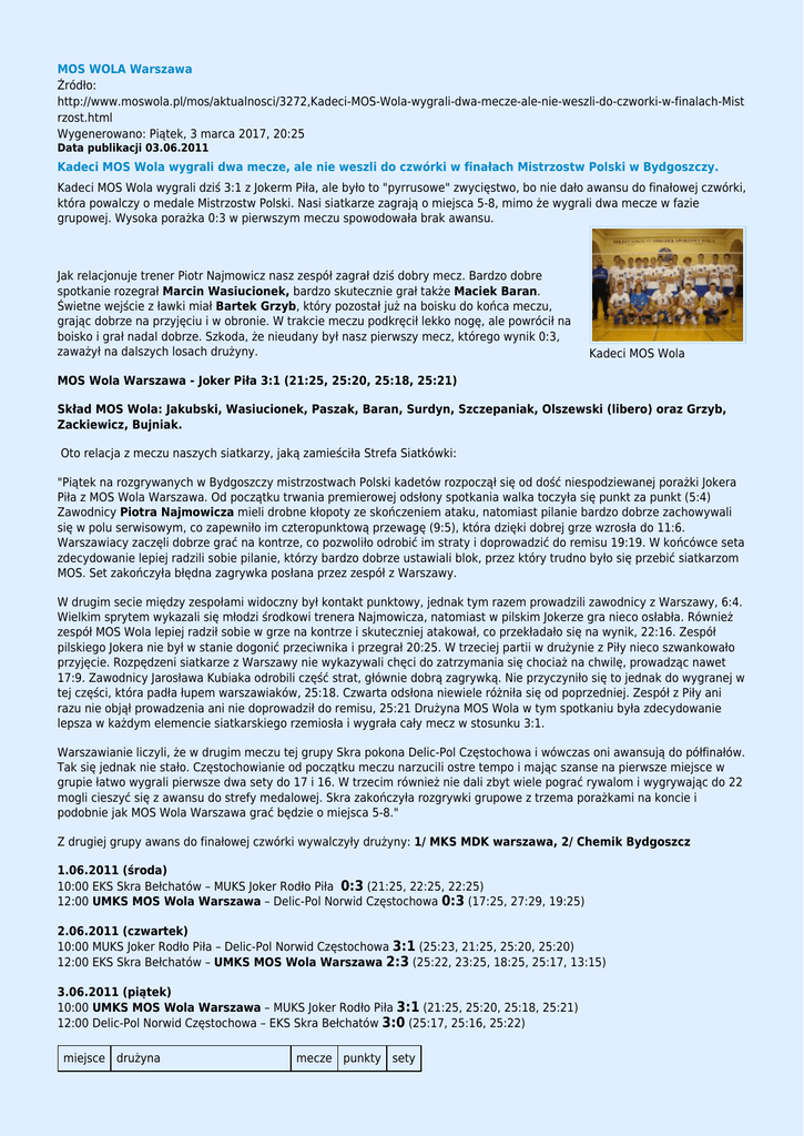MOS WOLA Warszawa Źródło: http://www.moswola.pl/mos/aktualnosci/3272,Kadeci-MOS-Wola-wygrali-dwa-mecze-ale-nie-weszli-do-czworki-w-finalach-Mist rzost.html Wygenerowano: Piątek, 3 marca 2017, 20:25 Data publikacji 03.06.2011 Kadeci MOS Wola wygrali dwa mecze, ale nie weszli do czwórki w finałach Mistrzostw Polski w Bydgoszczy. Kadeci MOS Wola wygrali dziś 3:1 z Jokerm Piła, ale było to "pyrrusowe" zwycięstwo, bo nie dało awansu do finałowej czwórki, która powalczy o medale Mistrzostw Polski. Nasi siatkarze zagrają o miejsca 5-8, mimo że wygrali dwa mecze w fazie grupowej. Wysoka porażka 0:3 w pierwszym meczu spowodowała brak awansu. Jak relacjonuje trener Piotr Najmowicz nasz zespół zagrał dziś dobry mecz. Bardzo dobre spotkanie rozegrał Marcin Wasiucionek, bardzo skutecznie grał także Maciek Baran. Świetne wejście z ławki miał Bartek Grzyb, który pozostał już na boisku do końca meczu, grając dobrze na przyjęciu i w obronie. W trakcie meczu podkręcił lekko nogę, ale powrócił na boisko i grał nadal dobrze. Szkoda, że nieudany był nasz pierwszy mecz, którego wynik 0:3, zaważył na dalszych losach drużyny. Kadeci MOS Wola MOS Wola Warszawa - Joker Piła 3:1 (21:25, 25:20, 25:18, 25:21) Skład MOS Wola: Jakubski, Wasiucionek, Paszak, Baran, Surdyn, Szczepaniak, Olszewski (libero) oraz Grzyb, Zackiewicz, Bujniak. Oto relacja z meczu naszych siatkarzy, jaką zamieściła Strefa Siatkówki: "Piątek na rozgrywanych w Bydgoszczy mistrzostwach Polski kadetów rozpoczął się od dość niespodziewanej porażki Jokera Piła z MOS Wola Warszawa. Od początku trwania premierowej odsłony spotkania walka toczyła się punkt za punkt (5:4) Zawodnicy Piotra Najmowicza mieli drobne kłopoty ze skończeniem ataku, natomiast pilanie bardzo dobrze zachowywali się w polu serwisowym, co zapewniło im czteropunktową przewagę (9:5), która dzięki dobrej grze wzrosła do 11:6. Warszawiacy zaczęli dobrze grać na kontrze, co pozwoliło odrobić im straty i doprowadzić do remisu 19:19. W końcówce seta zdecydowanie lepiej radzili sobie pilanie, którzy bardzo dobrze ustawiali blok, przez który trudno było się przebić siatkarzom MOS. Set zakończyła błędna zagrywka posłana przez zespół z Warszawy. W drugim secie między zespołami widoczny był kontakt punktowy, jednak tym razem prowadzili zawodnicy z Warszawy, 6:4. Wielkim sprytem wykazali się młodzi środkowi trenera Najmowicza, natomiast w pilskim Jokerze gra nieco osłabła. Również zespół MOS Wola lepiej radził sobie w grze na kontrze i skuteczniej atakował, co przekładało się na wynik, 22:16. Zespół pilskiego Jokera nie był w stanie dogonić przeciwnika i przegrał 20:25. W trzeciej partii w drużynie z Piły nieco szwankowało przyjęcie. Rozpędzeni siatkarze z Warszawy nie wykazywali chęci do zatrzymania się chociaż na chwilę, prowadząc nawet 17:9. Zawodnicy Jarosława Kubiaka odrobili część strat, głównie dobrą zagrywką. Nie przyczyniło się to jednak do wygranej w tej części, która padła łupem warszawiaków, 25:18. Czwarta odsłona niewiele różniła się od poprzedniej. Zespół z Piły ani razu nie objął prowadzenia ani nie doprowadził do remisu, 25:21 Drużyna MOS Wola w tym spotkaniu była zdecydowanie lepsza w każdym elemencie siatkarskiego rzemiosła i wygrała cały mecz w stosunku 3:1. Warszawianie liczyli, że w drugim meczu tej grupy Skra pokona Delic-Pol Częstochowa i wówczas oni awansują do półfinałów. Tak się jednak nie stało. Częstochowianie od początku meczu narzucili ostre tempo i mając szanse na pierwsze miejsce w grupie łatwo wygrali pierwsze dwa sety do 17 i 16. W trzecim również nie dali zbyt wiele pograć rywalom i wygrywając do 22 mogli cieszyć się z awansu do strefy medalowej. Skra zakończyła rozgrywki grupowe z trzema porażkami na koncie i podobnie jak MOS Wola Warszawa grać będzie o miejsca 5-8." Z drugiej grupy awans do finałowej czwórki wywalczyły drużyny: 1/ MKS MDK warszawa, 2/ Chemik Bydgoszcz 1.06.2011 (środa) 10:00 EKS Skra Bełchatów – MUKS Joker Rodło Piła 0:3 (21:25, 22:25, 22:25) 12:00 UMKS MOS Wola Warszawa – Delic-Pol Norwid Częstochowa 0:3 (17:25, 27:29, 19:25) 2.06.2011 (czwartek) 10:00 MUKS Joker Rodło Piła – Delic-Pol Norwid Częstochowa 3:1 (25:23, 21:25, 25:20, 25:20) 12:00 EKS Skra Bełchatów – UMKS MOS Wola Warszawa 2:3 (25:22, 23:25, 18:25, 25:17, 13:15) 3.06.2011 (piątek) 10:00 UMKS MOS Wola Warszawa – MUKS Joker Rodło Piła 3:1 (21:25, 25:20, 25:18, 25:21) 12:00 Delic-Pol Norwid Częstochowa – EKS Skra Bełchatów 3:0 (25:17, 25:16, 25:22) miejsce drużyna mecze punkty sety 1 Delic-Pol Norwid Częstochowa 3 5 7:3 2 MUKS Joker Rodło Piła 3 5 7:4 3 UMKS MOS Wola Warszawa 3 5 6:6 4 EKS Skra Bełchatów 3 2:9 3 Komentarz (0) dodaj komentarz Brak komentarzy dodaj komentarz